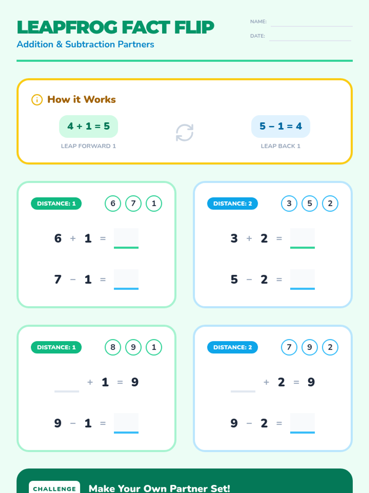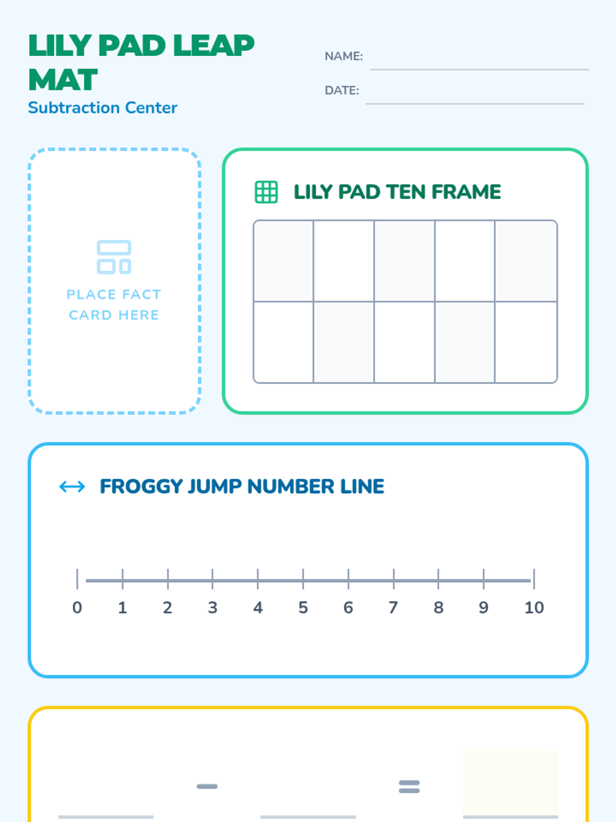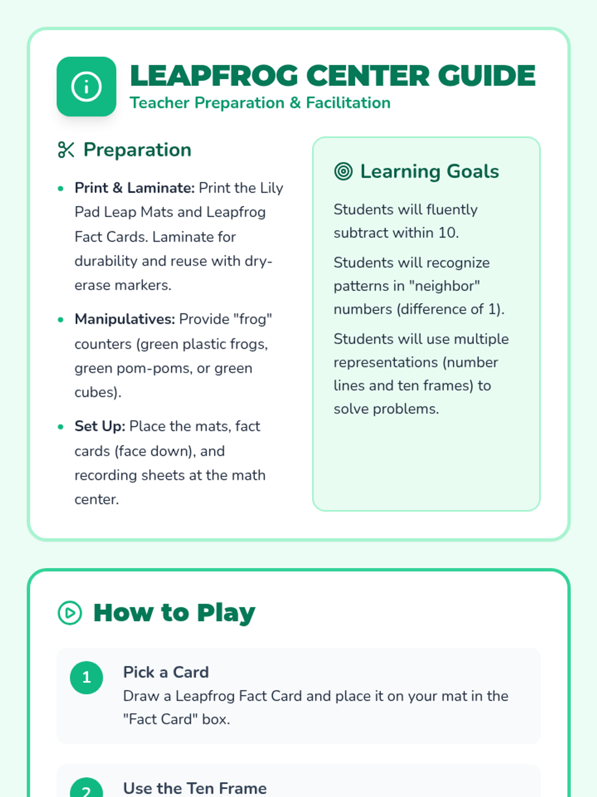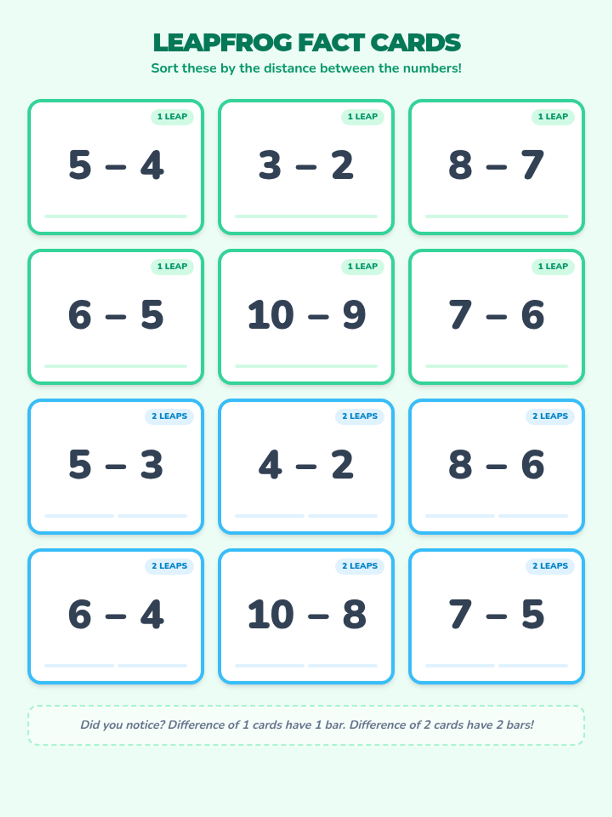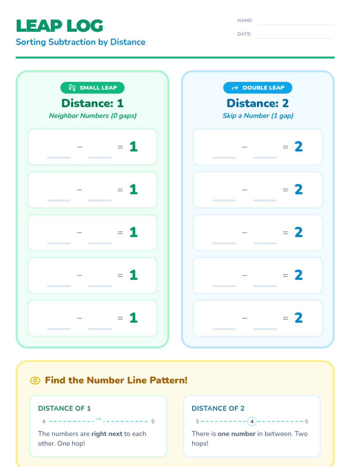 A hands-on math center activity designed for first graders to master subtraction facts within 10 that result in differences of one or two. Students use number lines and ten frames with physical manipulatives to visualize the 'hopping' and 'removing' concepts of subtraction.