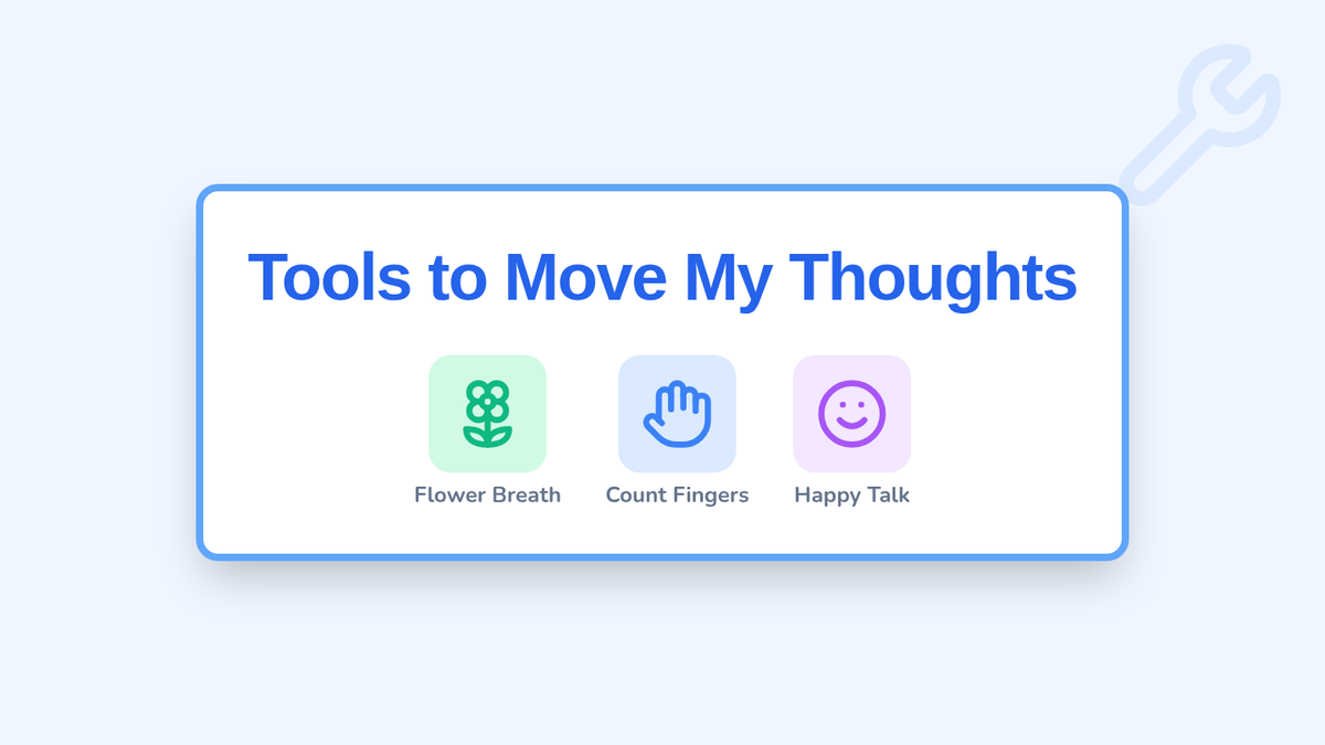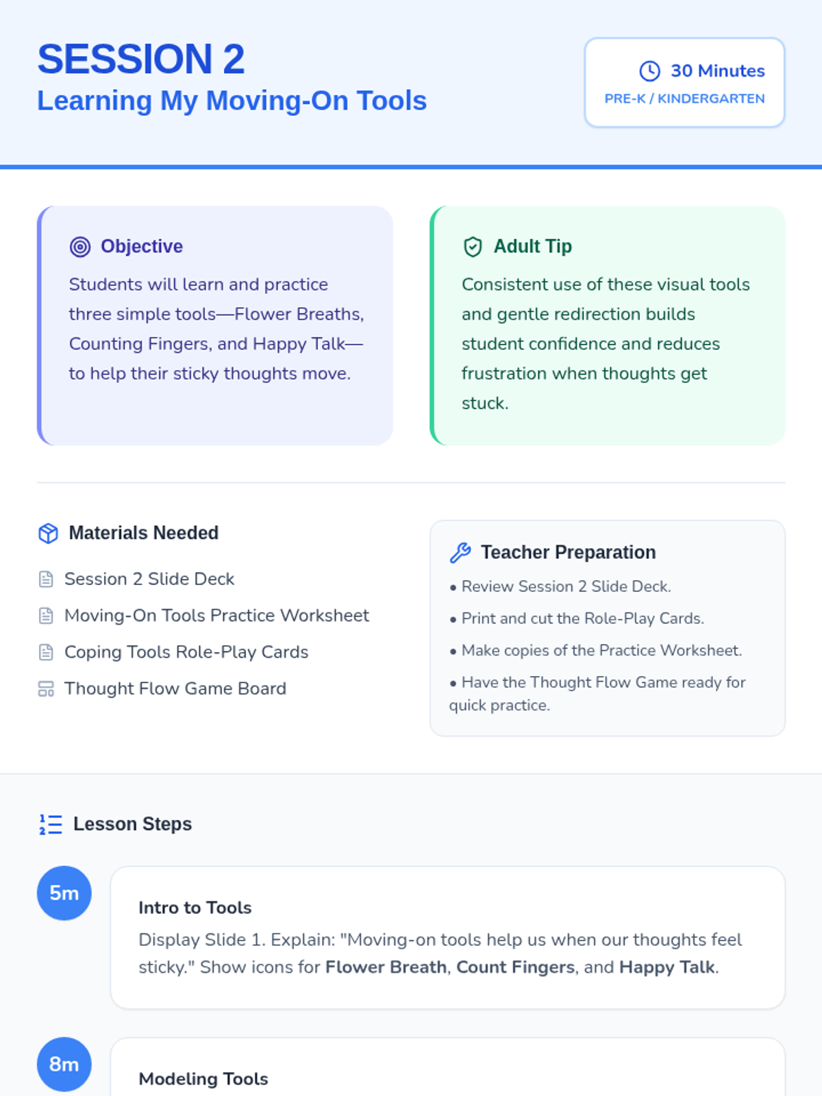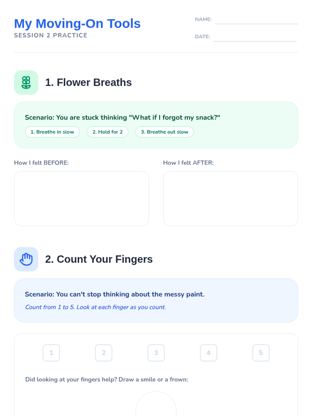 Students will learn and practice three simple tools—Flower Breaths, Counting Fingers, and Happy Talk—to help their sticky thoughts move.