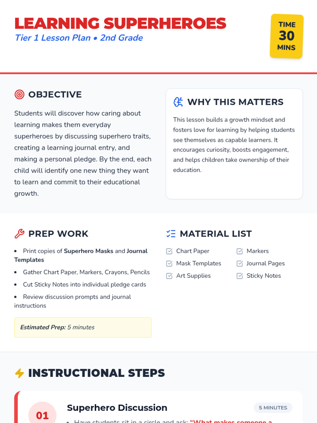A 30-minute Tier 1 lesson for 2nd graders to discover how curiosity, perseverance, and a love for learning turn them into everyday superheroes.