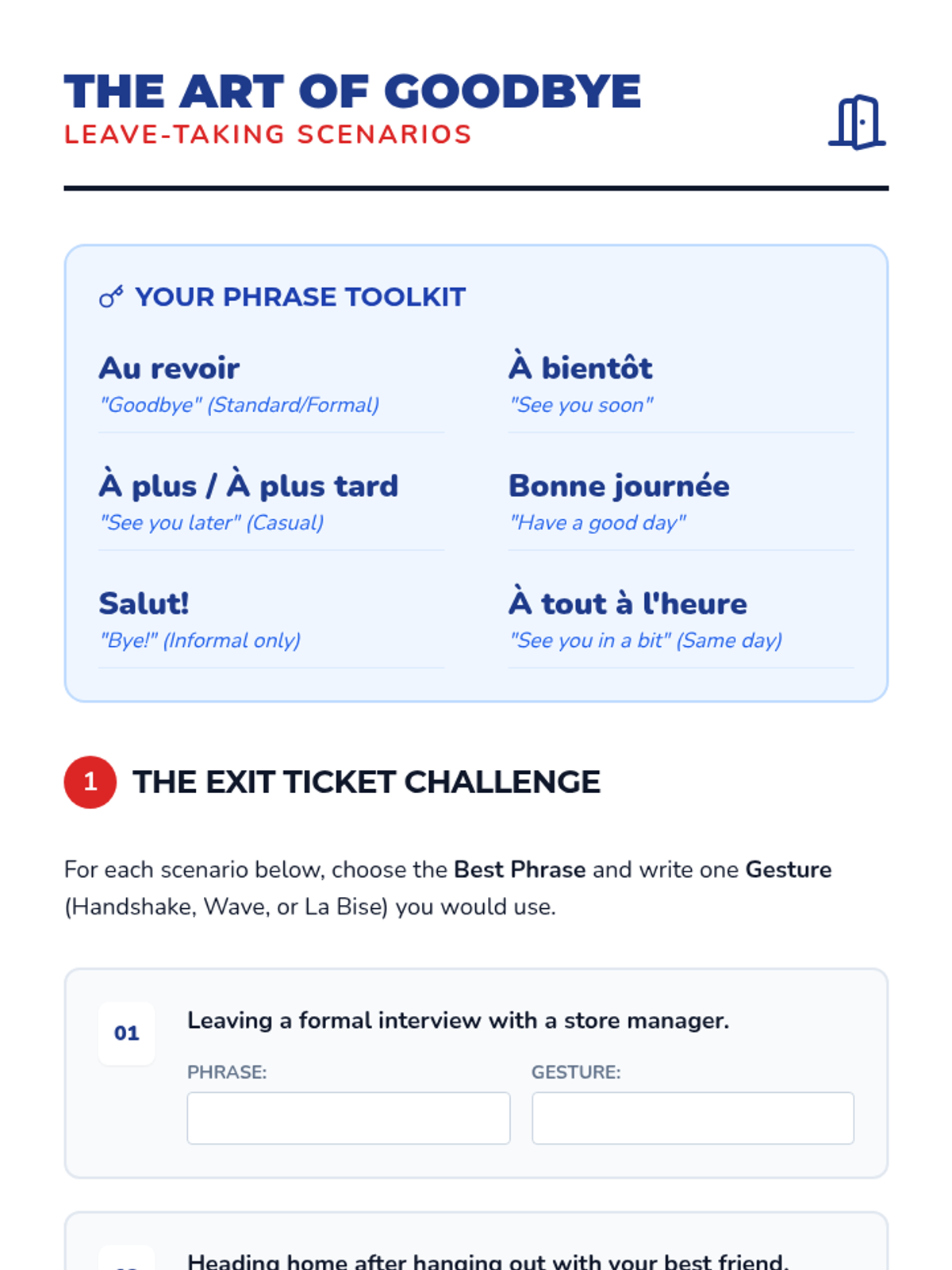This lesson focuses on ending conversations politely. Students learn a variety of leave-taking expressions and practice the 'art of the exit' in both formal and informal scenarios.