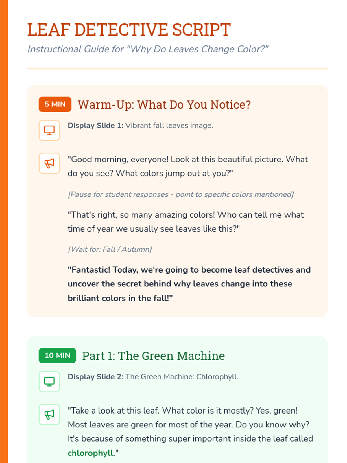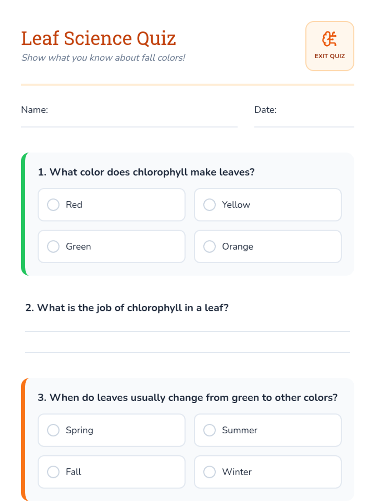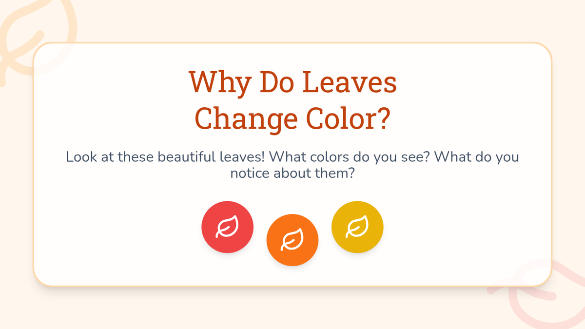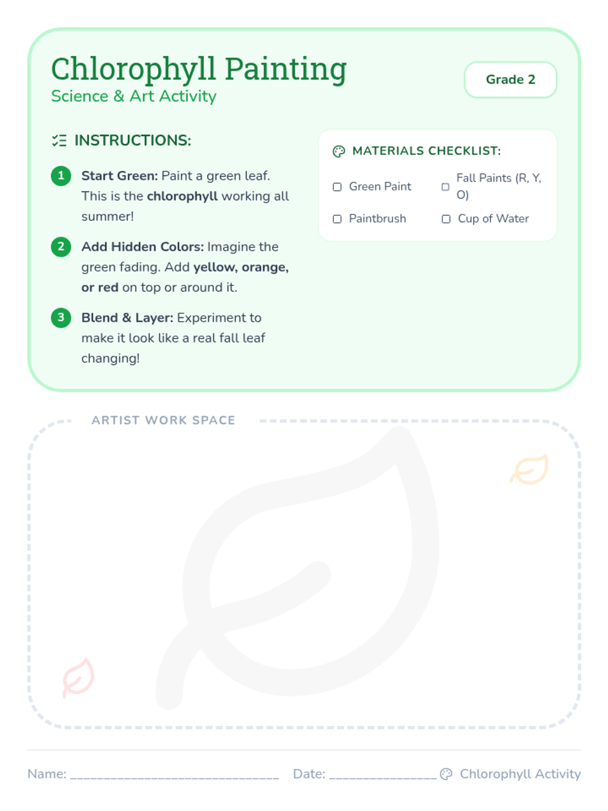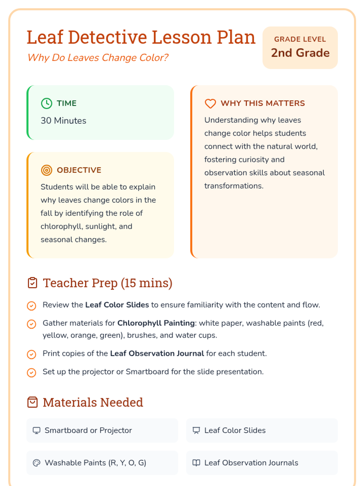 This interactive 30-minute lesson teaches 2nd graders about the role of chlorophyll and seasonal changes in the transformation of leaf colors during fall. Students will engage with a slide presentation, a creative painting activity, and a reflective journaling exercise.
