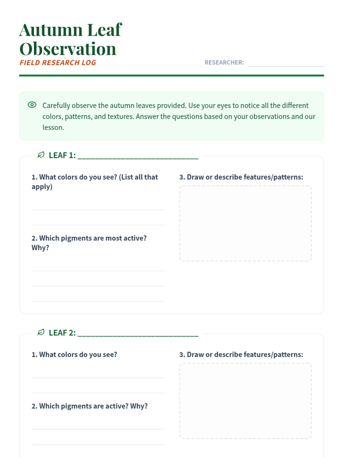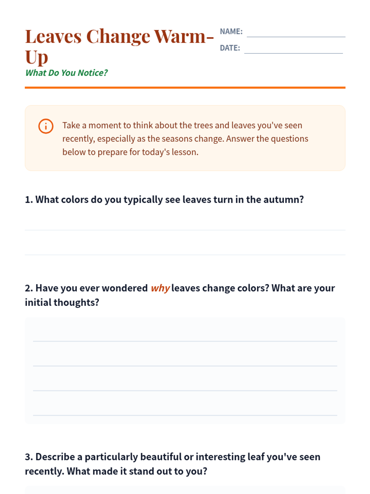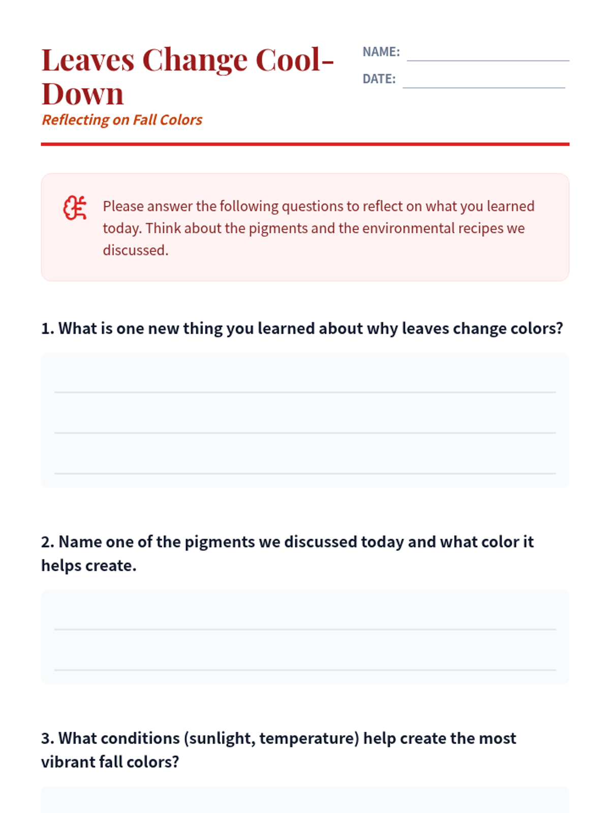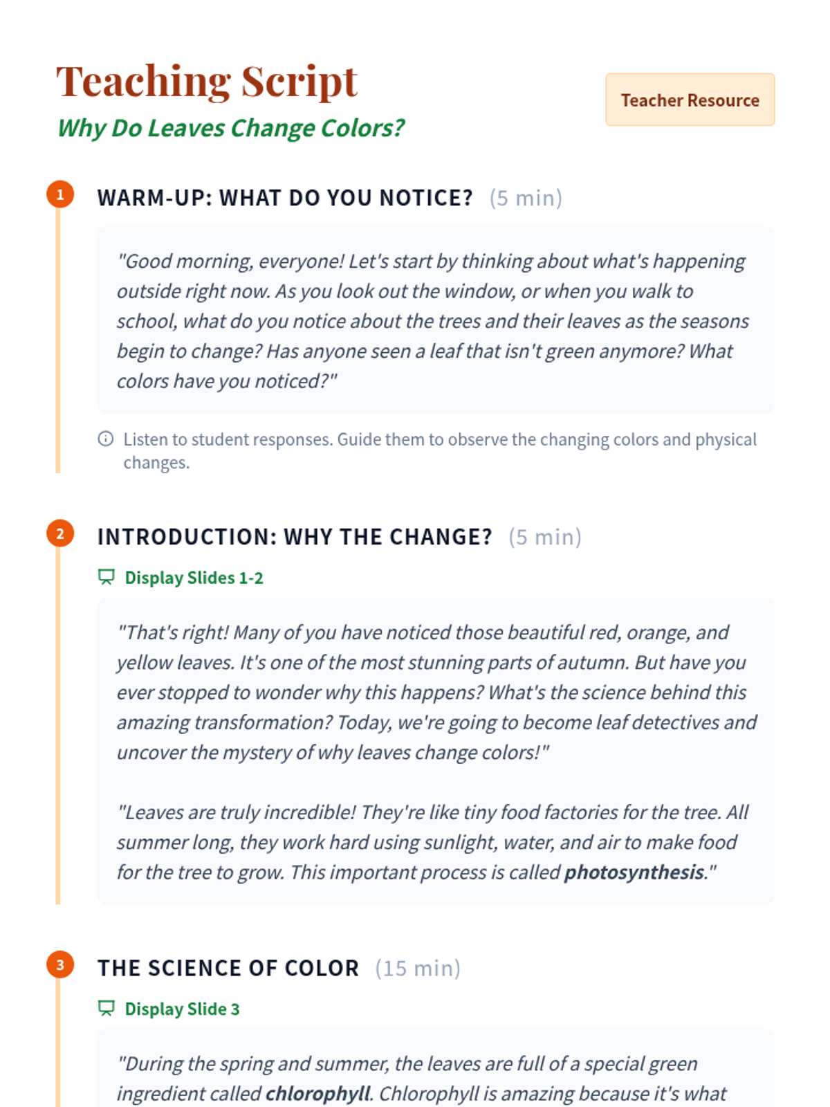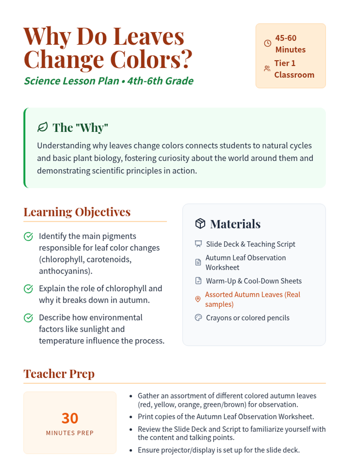 This lesson explores the fascinating science behind why leaves change colors in the fall. Students will learn about chlorophyll, other pigments, and the role of sunlight and temperature. Designed for 4th-6th grade students.