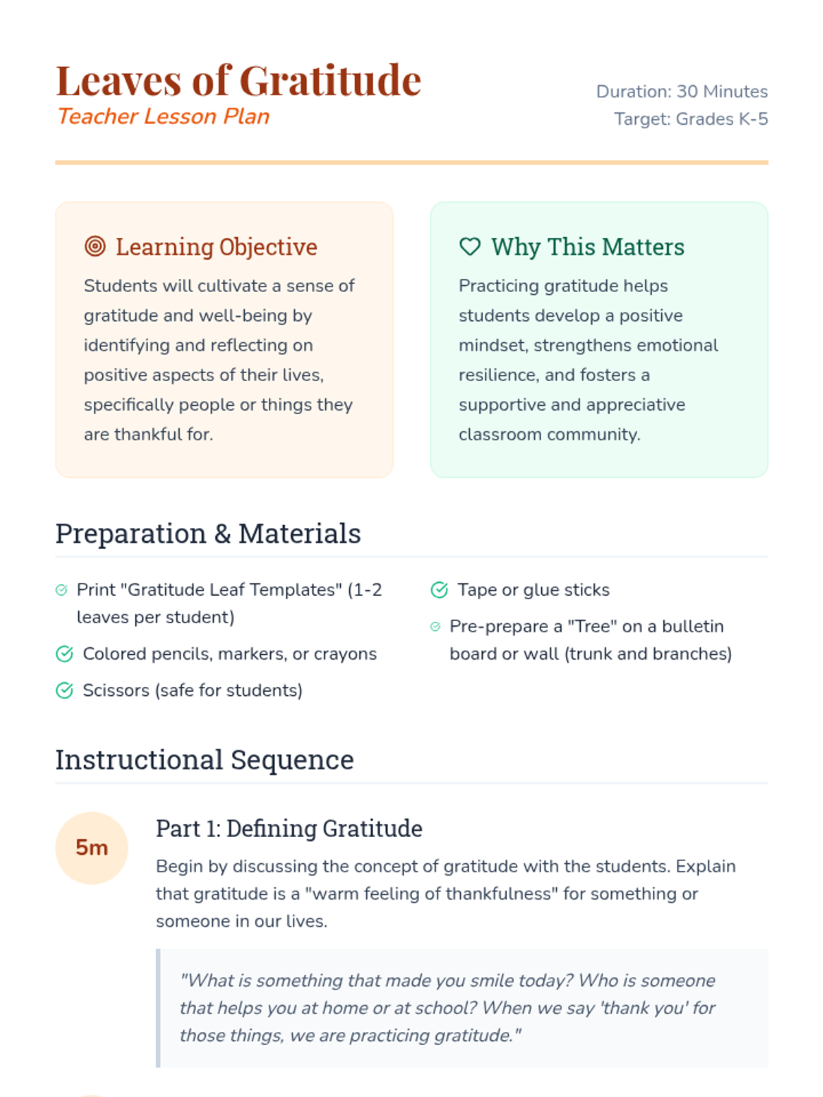 Students cultivate gratitude by creating personalized leaves for a classroom 'Gratitude Tree,' reflecting on positive aspects of their lives to foster well-being.
