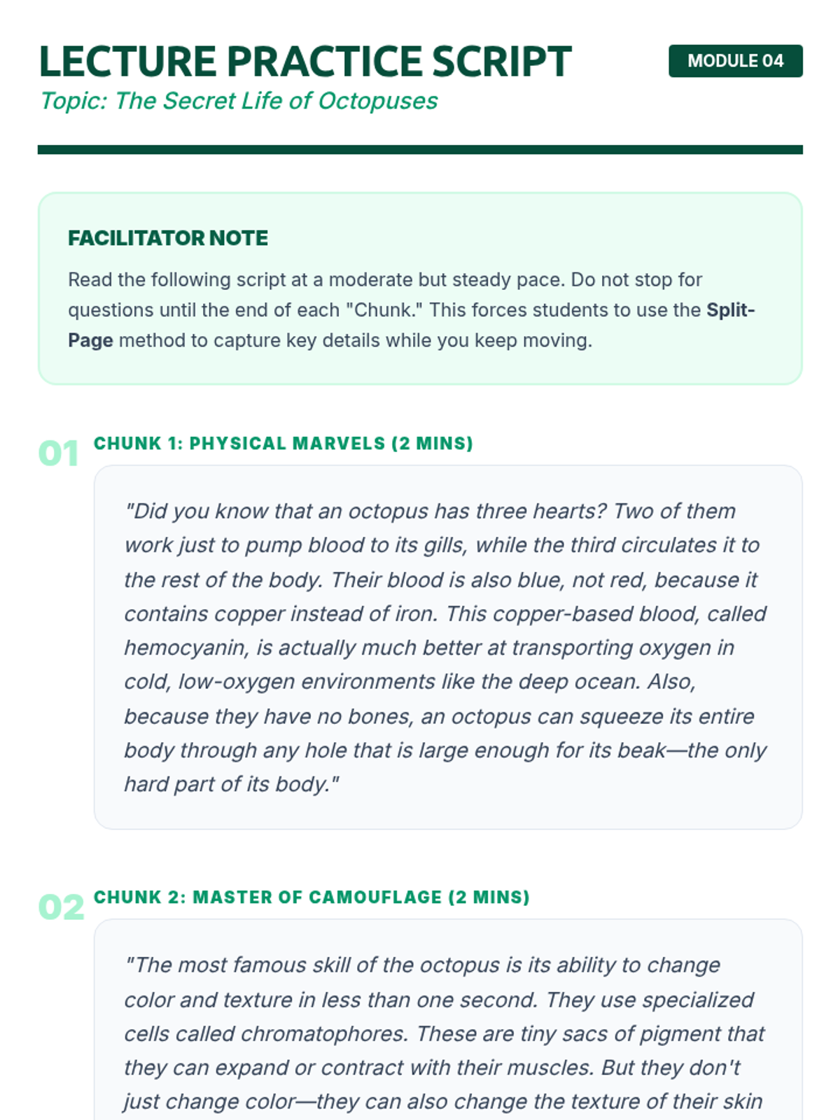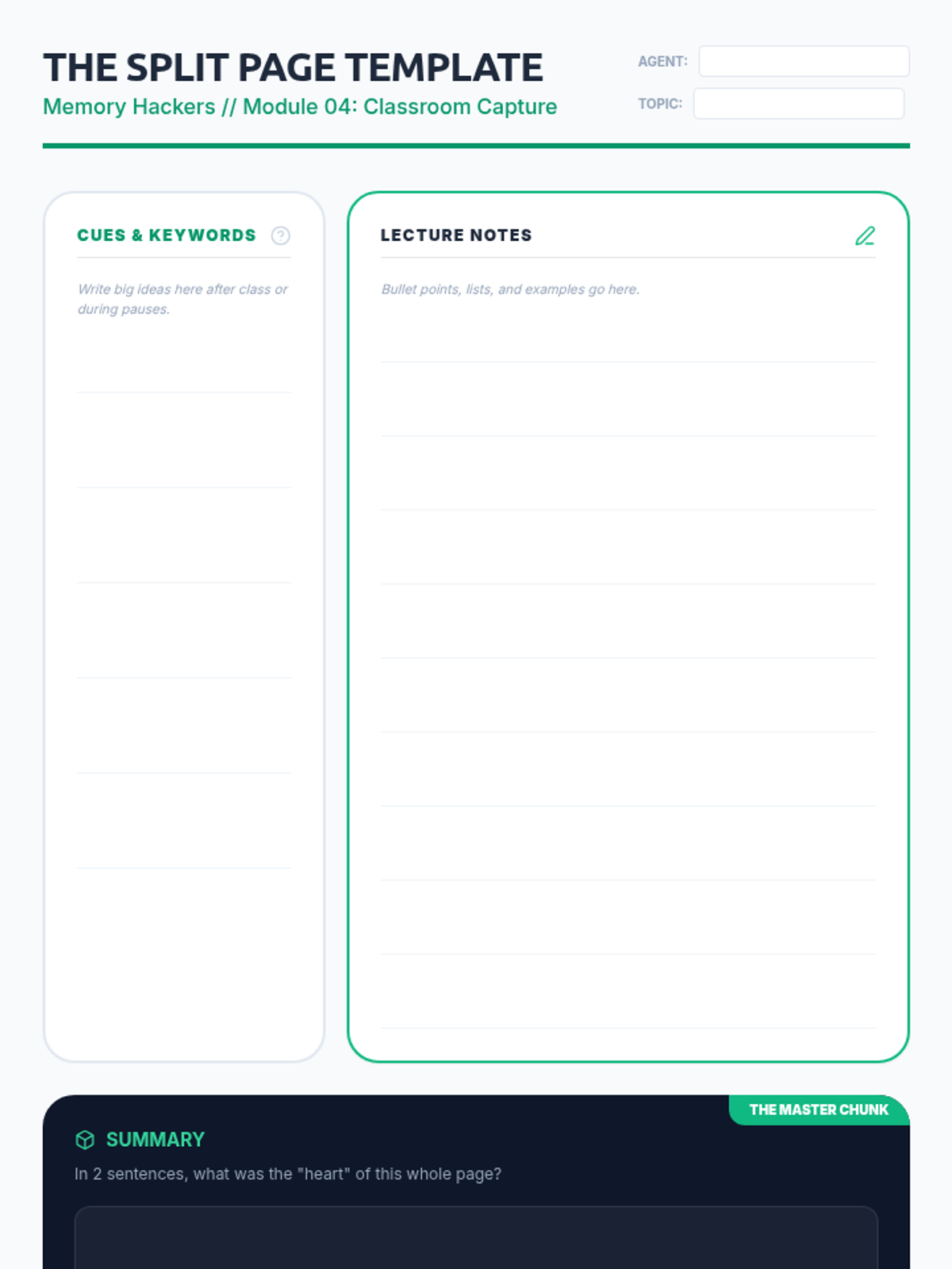 Applying auditory chunking to the classroom through Cornell Notes and split-page strategies for lecture retention.