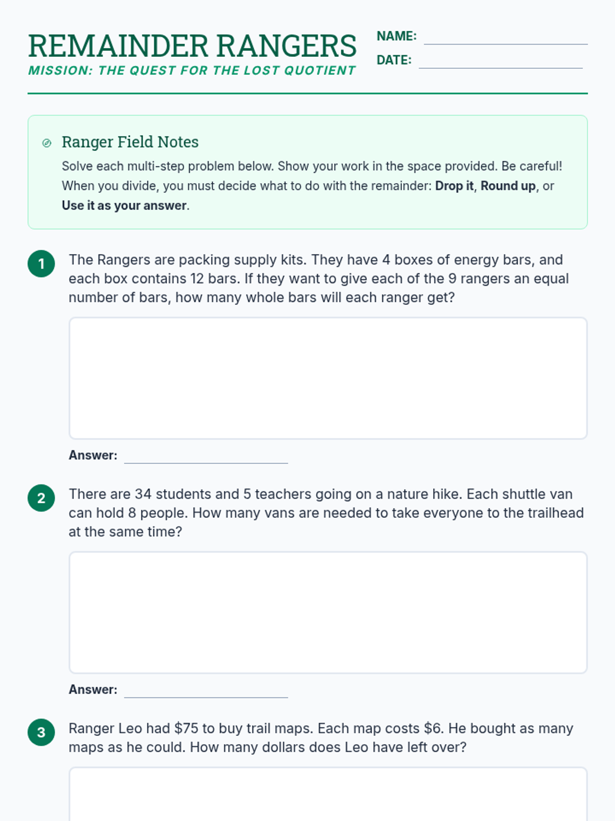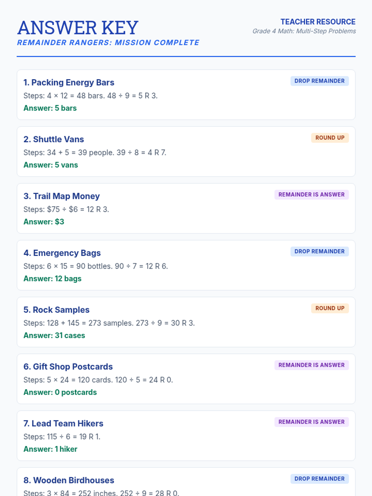 A lesson focused on solving multi-step word problems using all four operations with whole numbers, with a specific focus on interpreting remainders in real-world contexts.