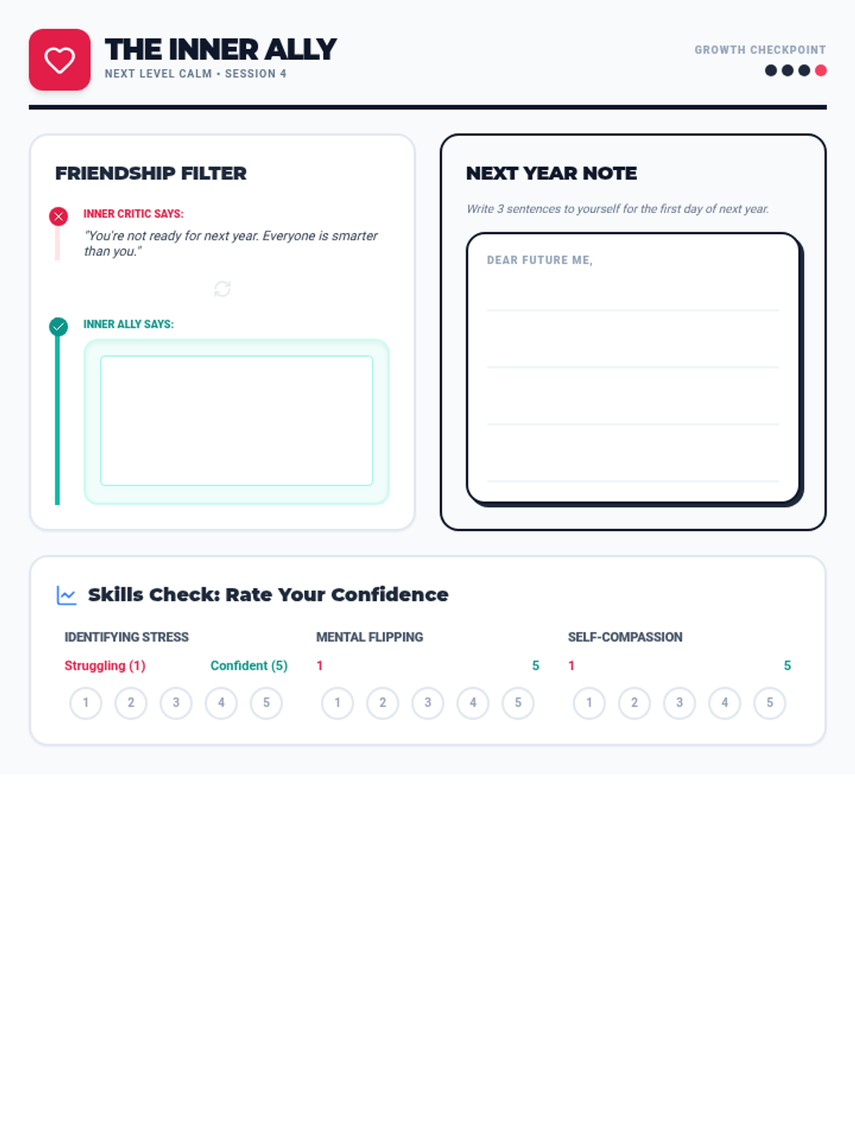 A transformative workshop for middle and high school students to swap their 'inner critic' for an 'inner advocate,' building resilience and self-compassion to navigate high-stakes testing and academic pressure.