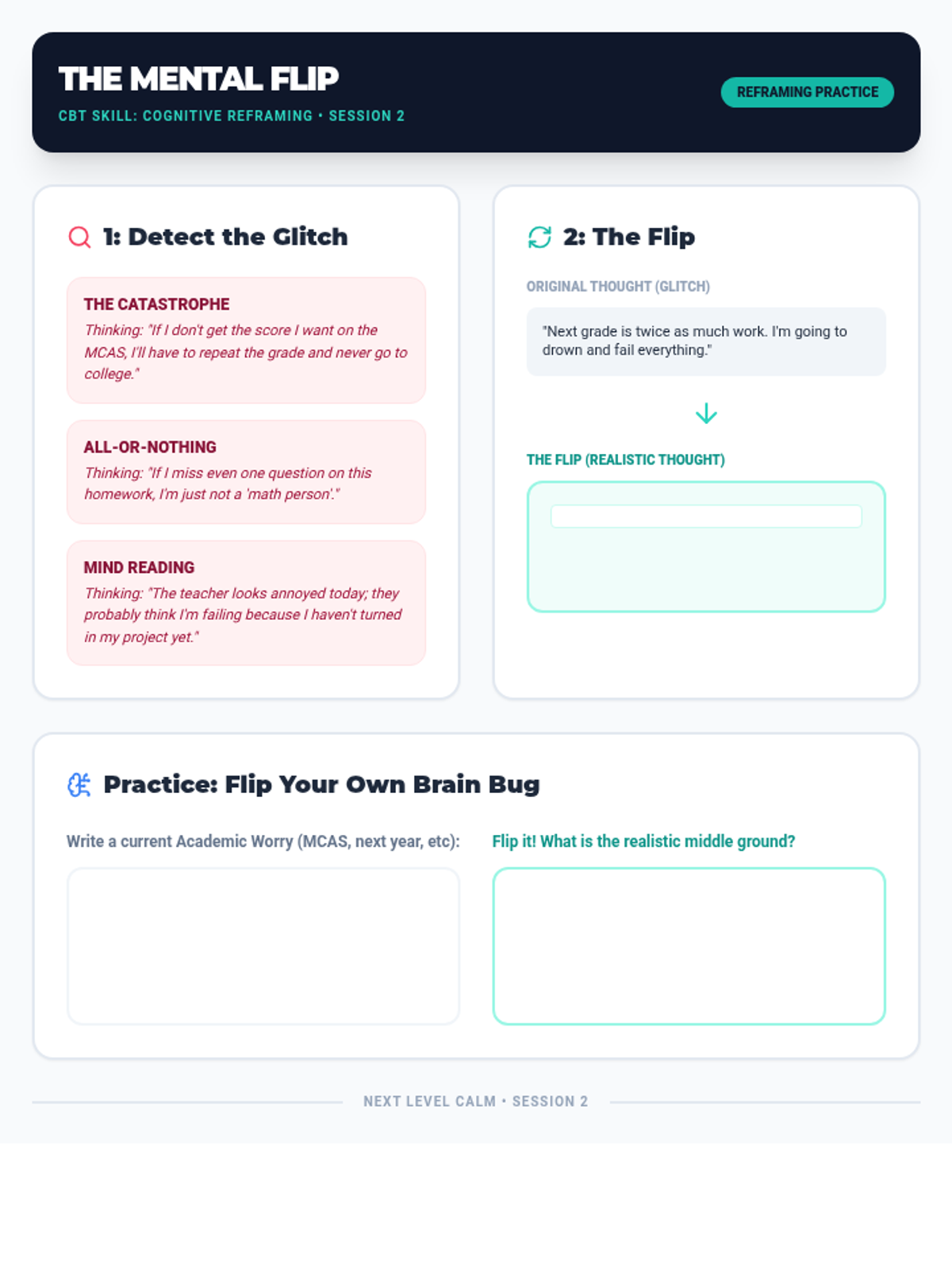 The second session focused on identifying cognitive distortions and practicing reframing techniques to challenge academic anxiety.