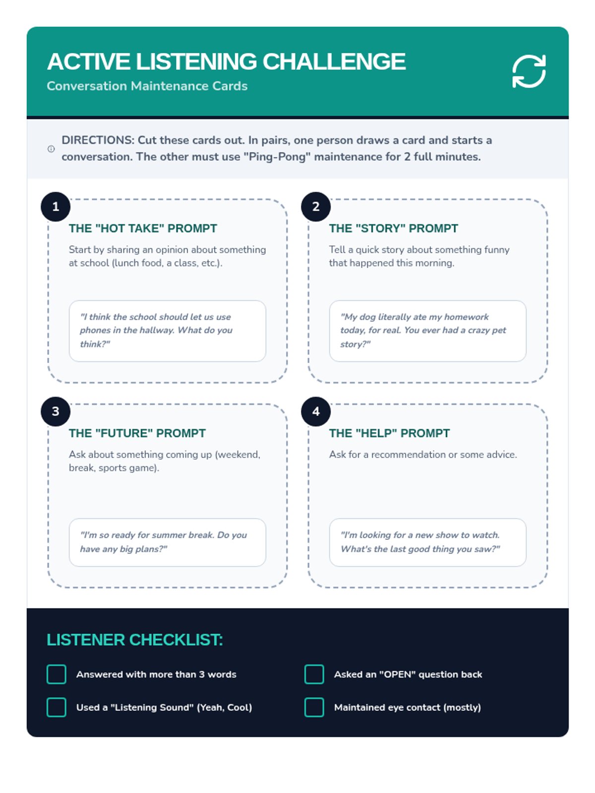 Introduction to group norms and learning how to effectively initiate conversations with peers using the 'Three-Second Rule' and 'OARS' model.