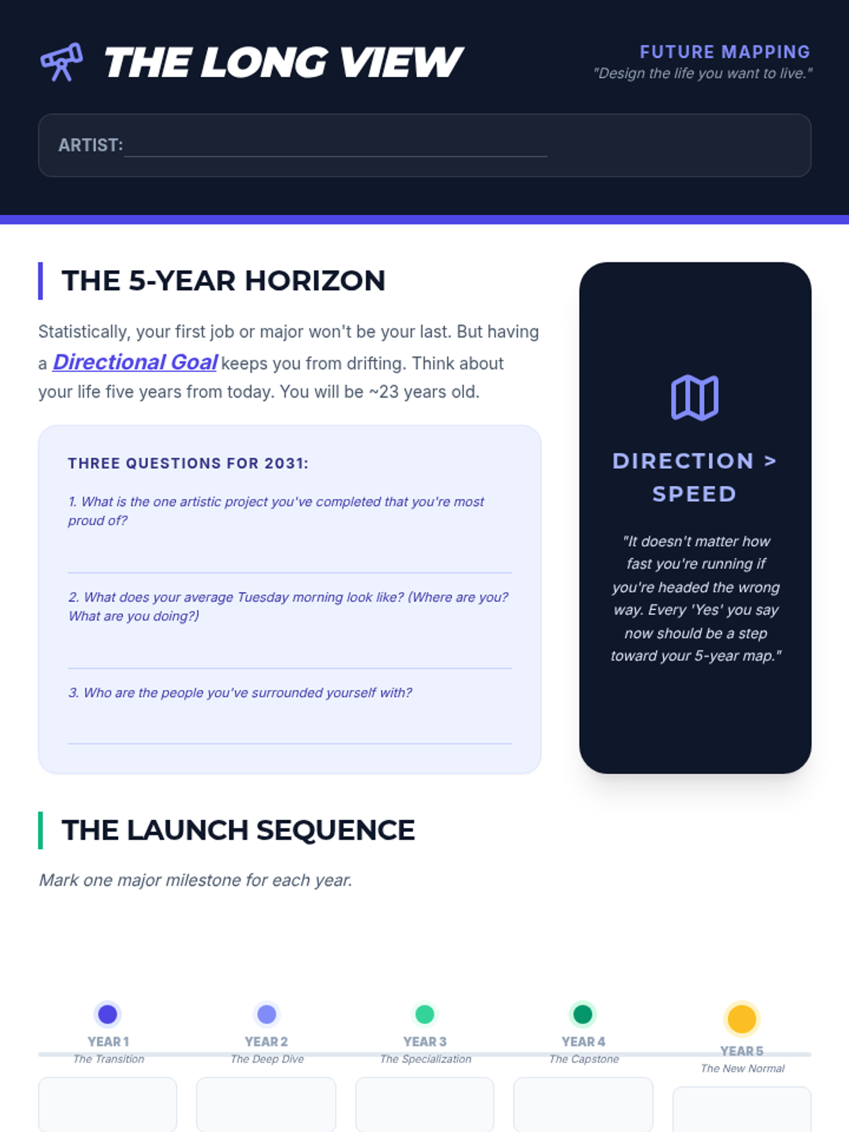 Guides students through a long-term goal-setting exercise, helping them map out professional and personal milestones for their first five years after high school using a visual timeline approach.