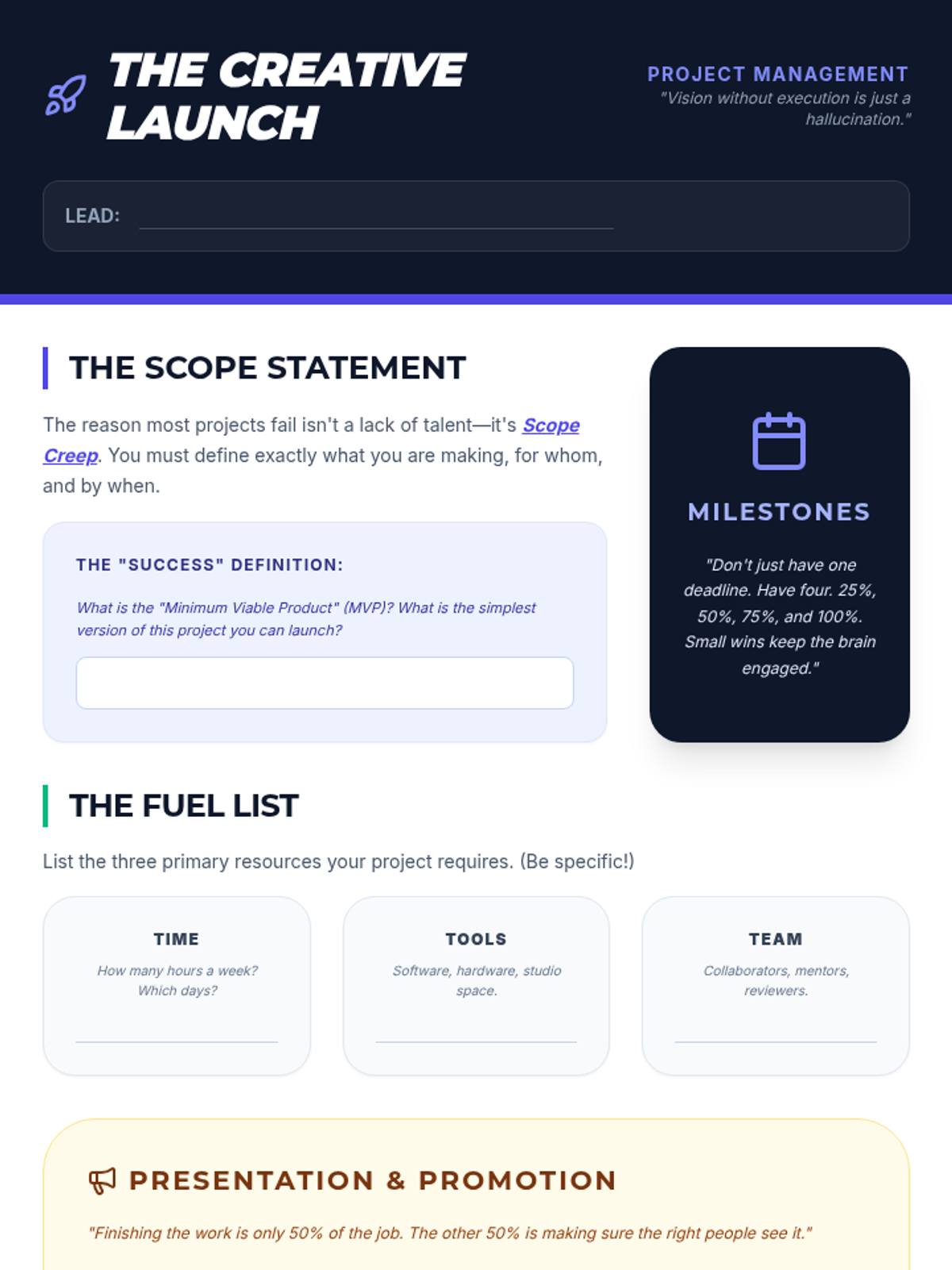 Teaches students how to plan, execute, and document a significant creative project, focusing on milestones, resource management, and the art of the 'Launch.'