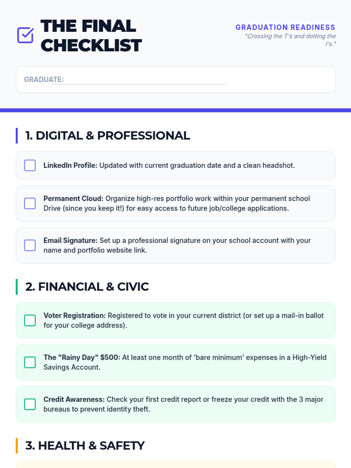 A comprehensive final review and logistics checklist for high school seniors, covering voter registration, insurance cards, professional email signatures, and emergency contact updates.