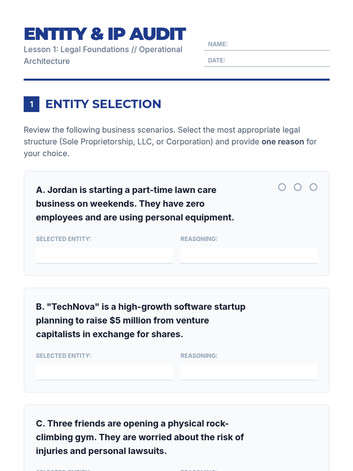 Students explore the differences between LLCs, Sole Proprietorships, and Corporations, along with intellectual property basics like patents and trademarks to protect their business concepts.