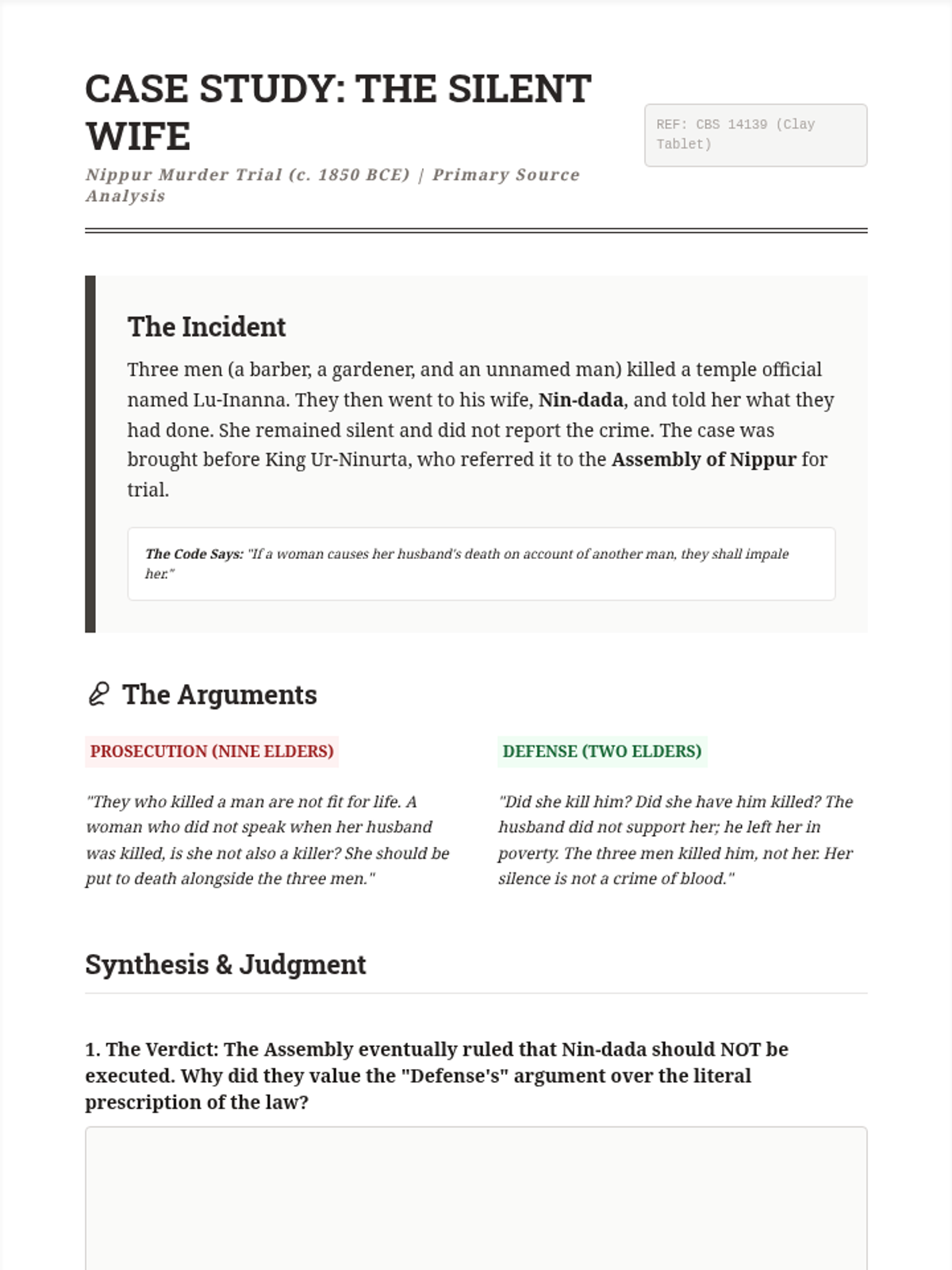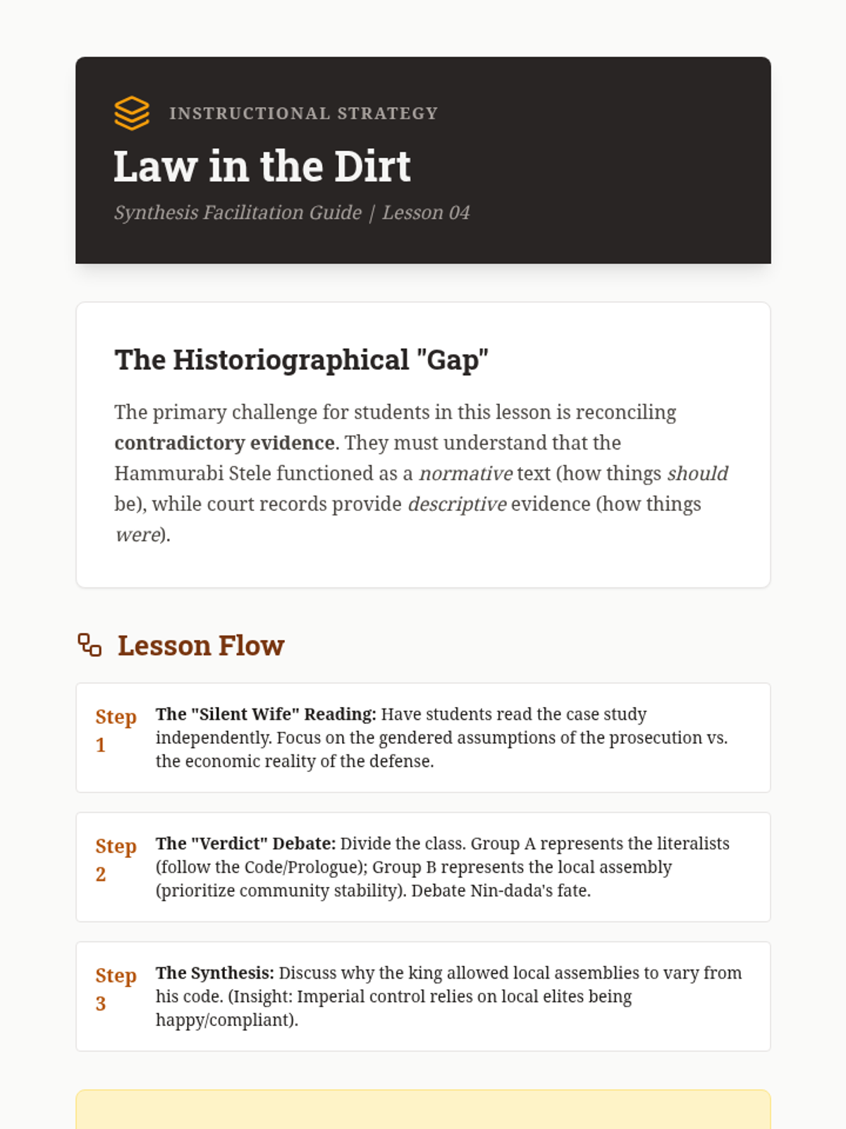 Contrasts the idealized 'Law of the King' on steles with 'Law in Practice' found in administrative tablets, court records, and marriage contracts. Students explore why actual judicial outcomes often diverged from the harsh prescriptions of the formal codes.