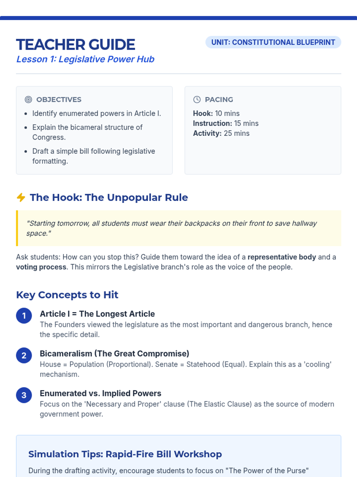 Students examine Article I to identify the enumerated powers of Congress and the bicameral structure of the House and Senate, concluding with a bill drafting workshop.