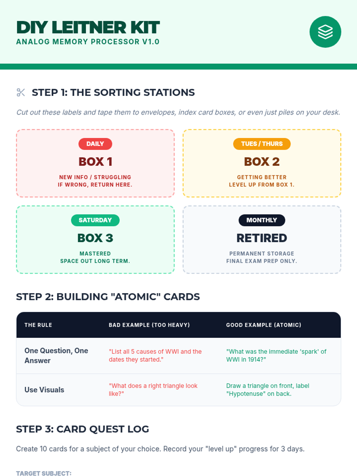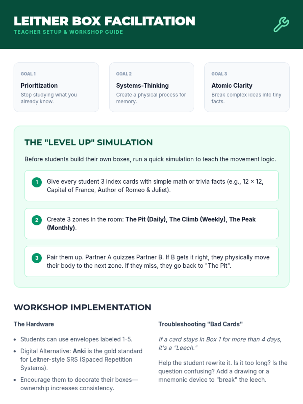 Students construct a physical or digital Leitner Box system for flashcards, sorting items based on how well they know them. This introduces the concept of prioritizing difficult material to save cognitive energy.