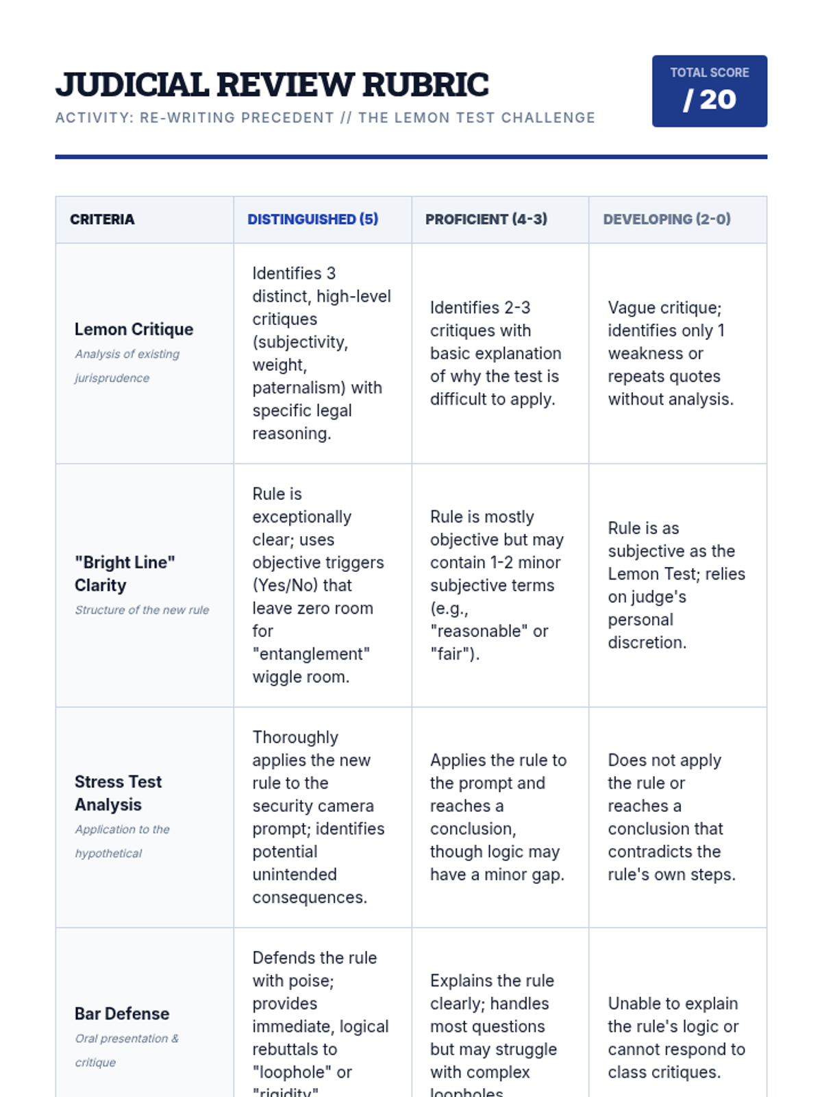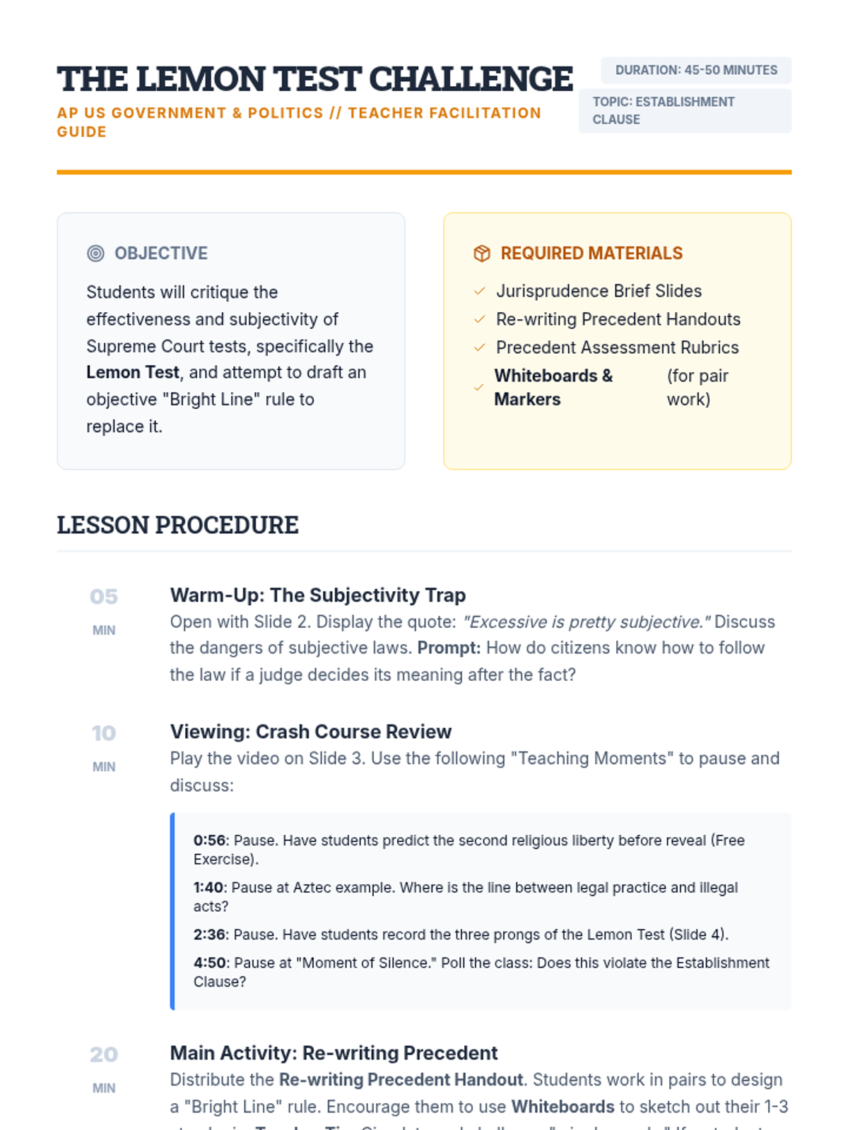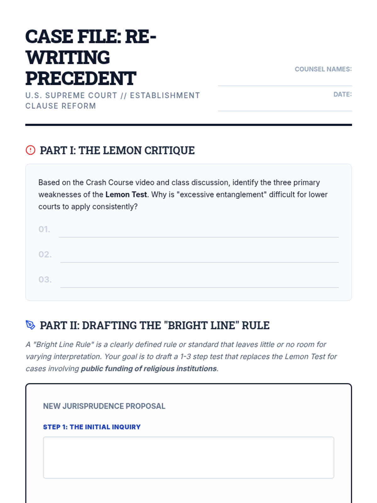 Students will analyze the Establishment Clause through the lens of the Lemon Test, critiquing its subjectivity and attempting to draft their own 'Bright Line' rule to replace it. This lesson features a deep dive into the Crash Course Government and Politics video on Freedom of Religion.