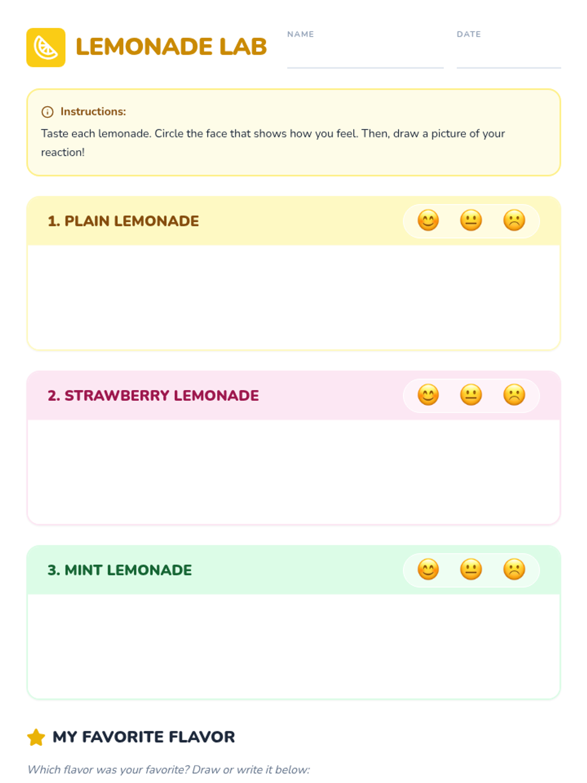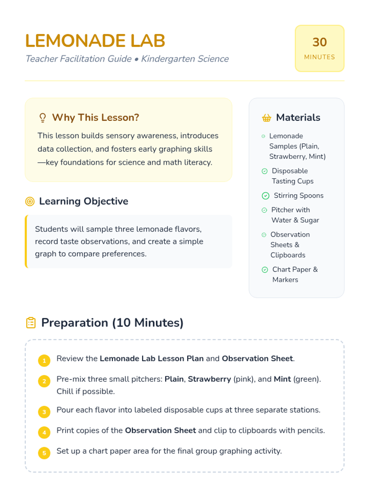 A sensory science and early data literacy lesson where kindergarteners taste-test different lemonade flavors, record observations, and create a group graph.