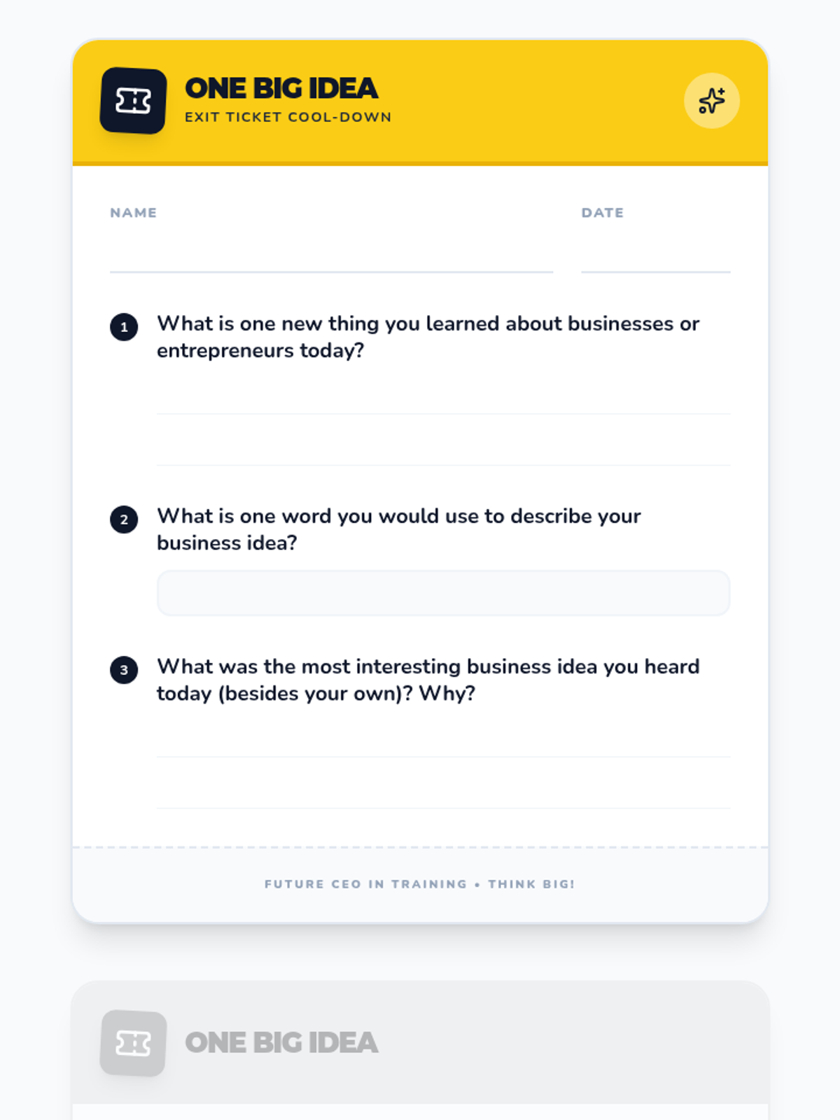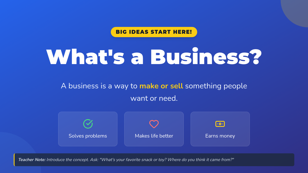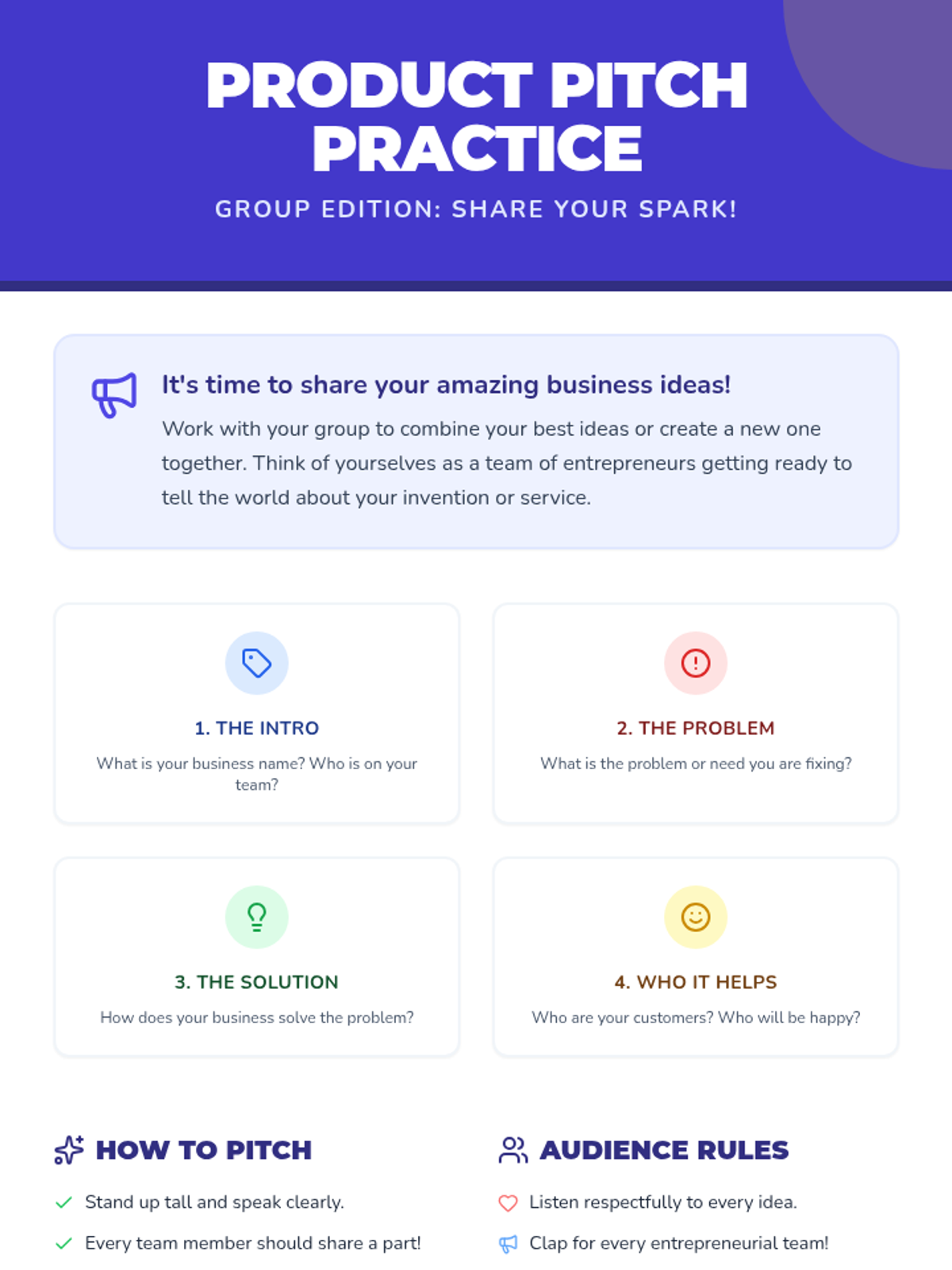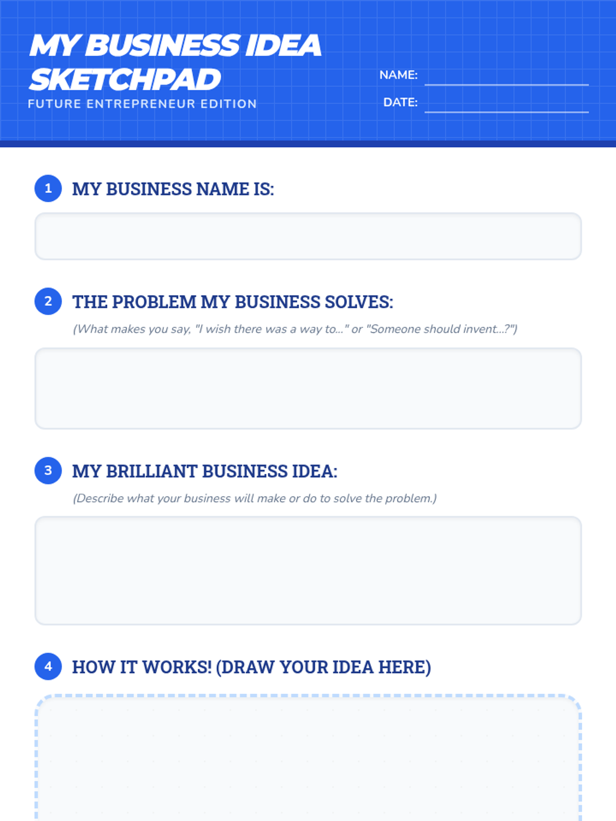 This lesson introduces 3rd graders to entrepreneurship by guiding them through brainstorming and developing their first business idea. Students will explore problem-solving, identify market needs, and sketch out their innovative solutions in a creative, hands-on environment.