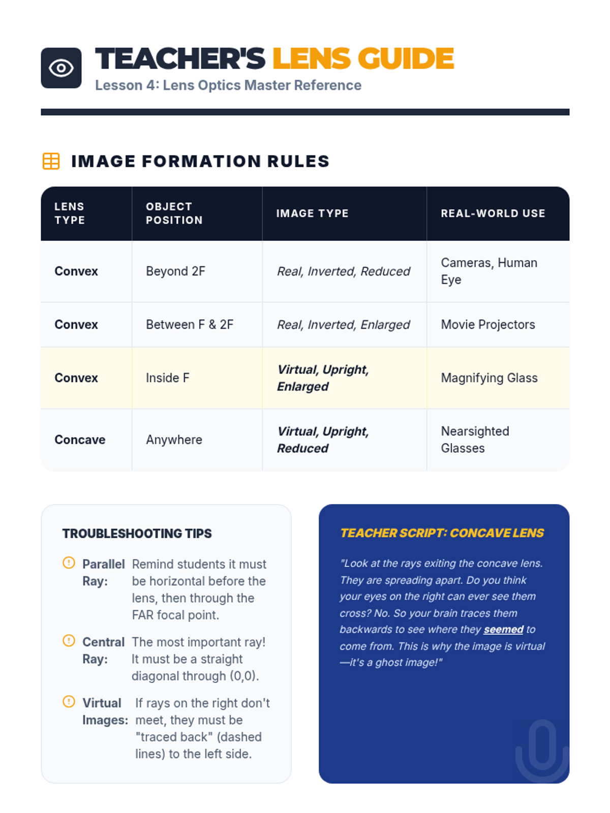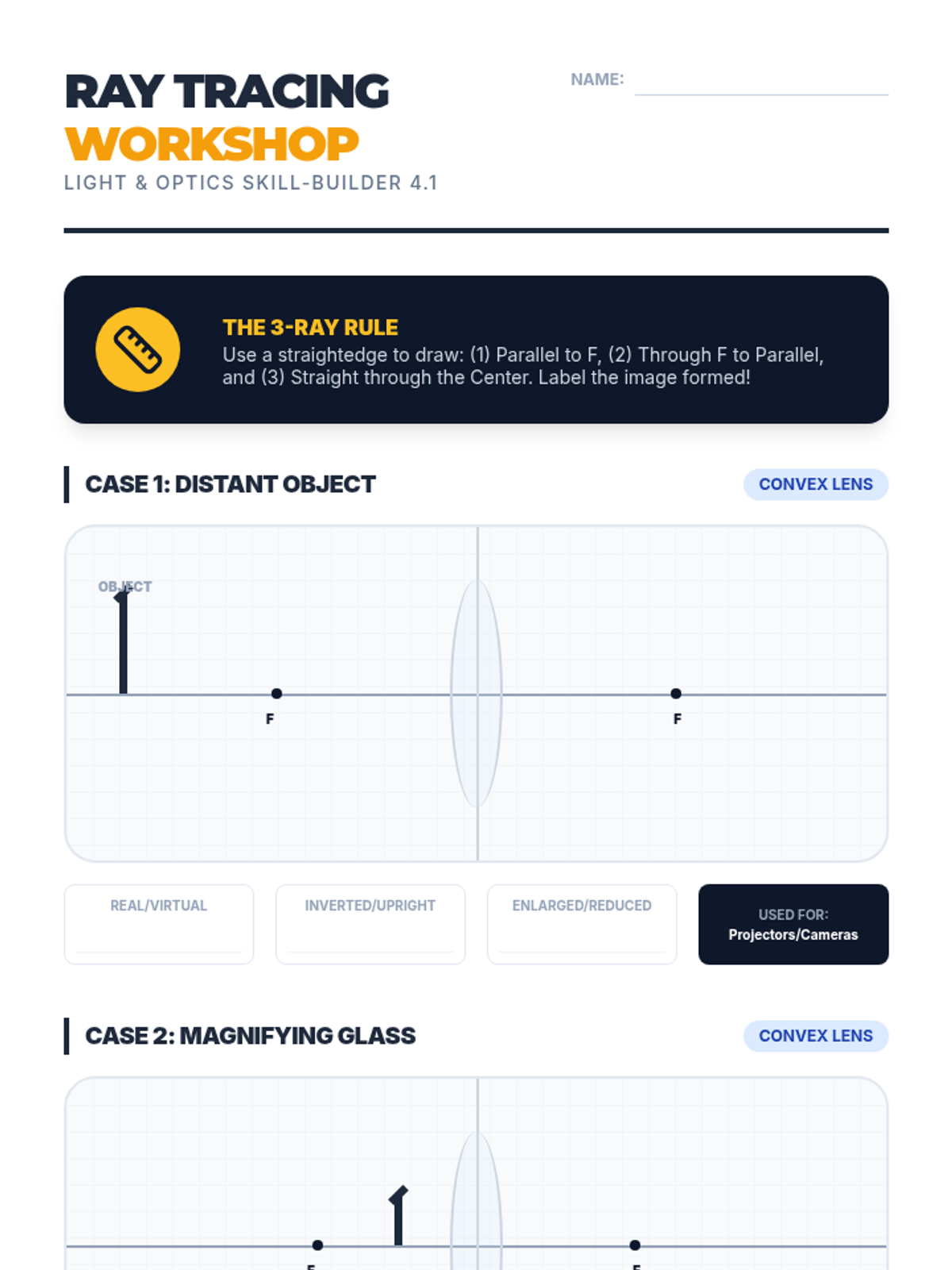 A hands-on workshop focusing on ray diagrams for converging and diverging lenses, exploring how image formation changes with object distance.