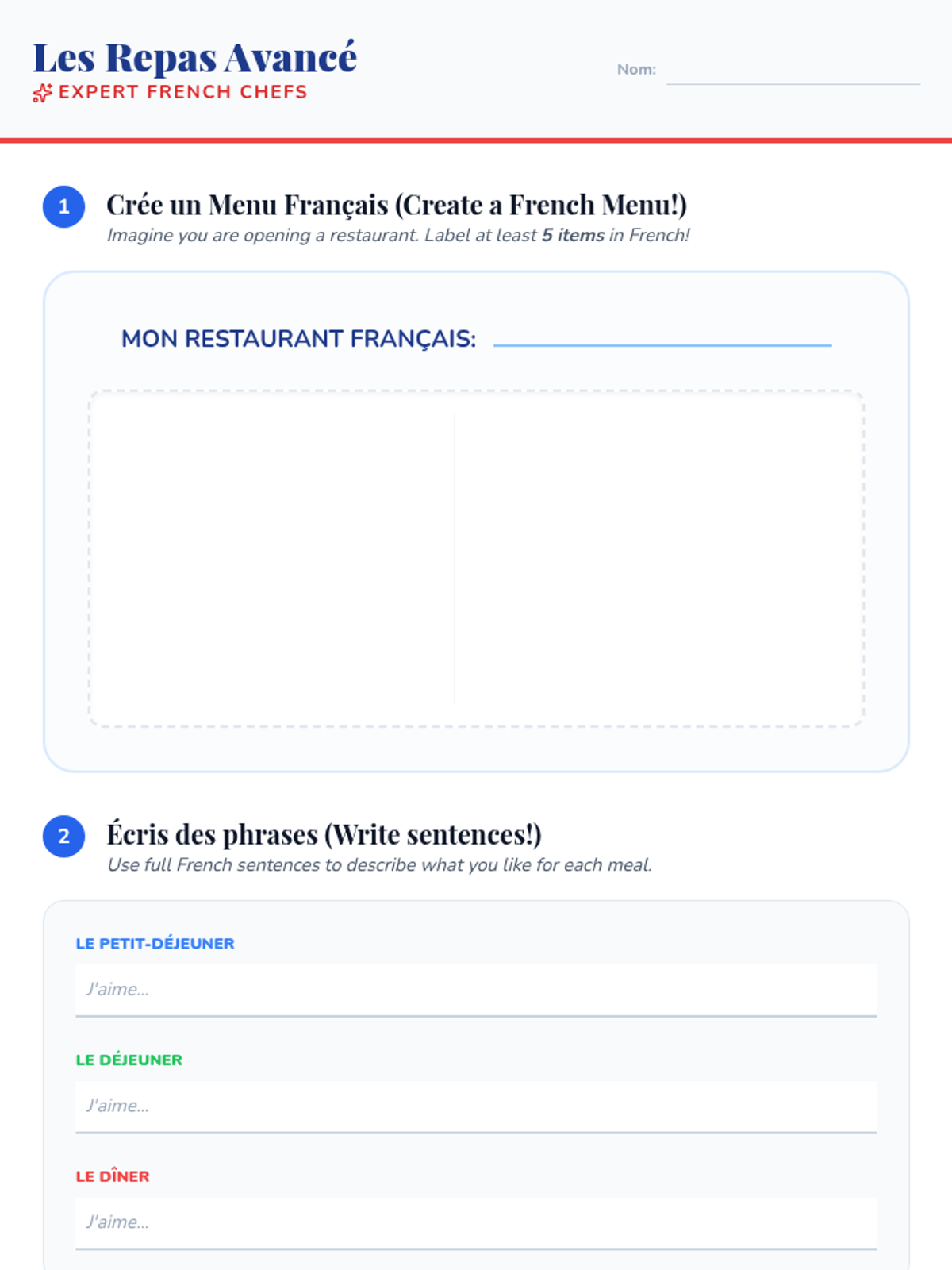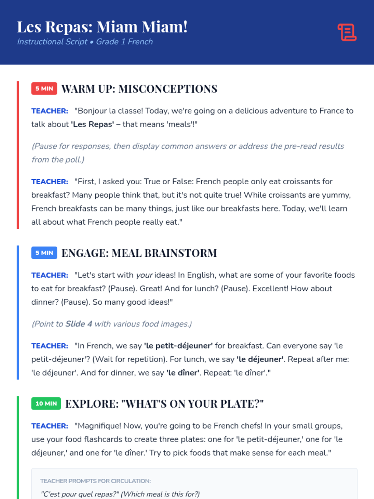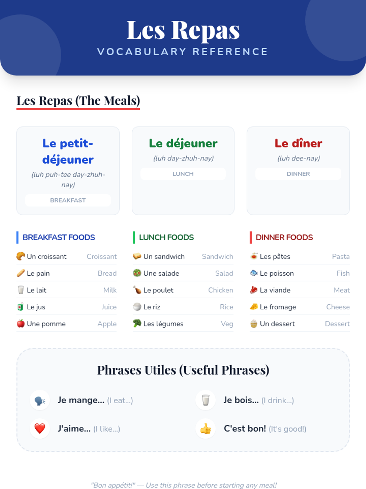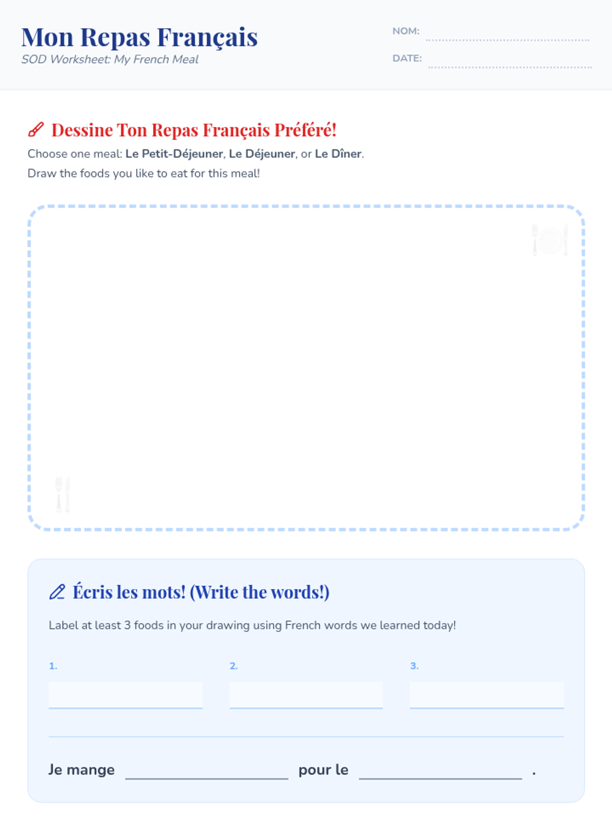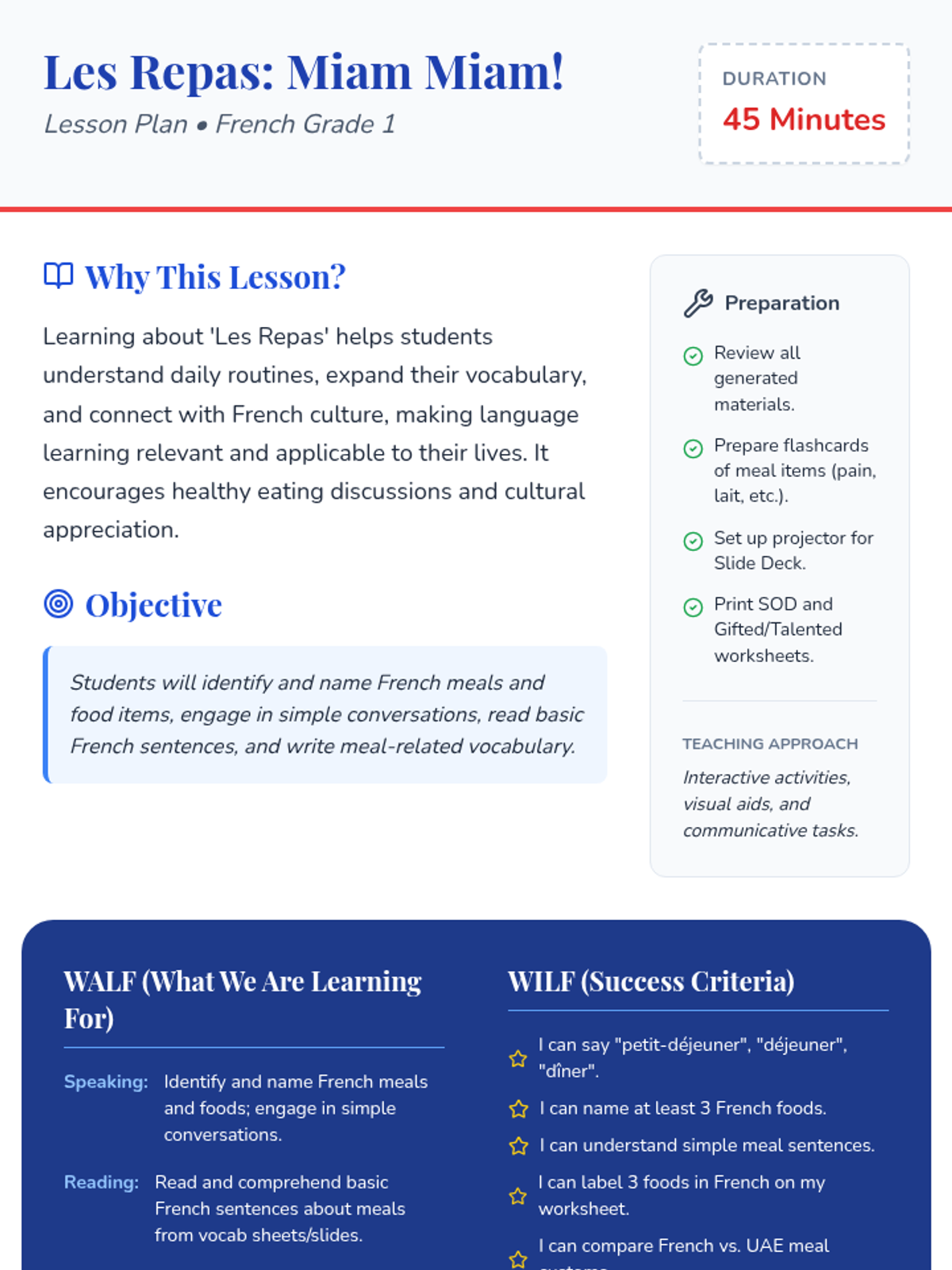 A 45-minute French lesson for 1st graders to explore and discuss different meals, fostering linguistic skills and cultural awareness through vocabulary building and creative activities.
