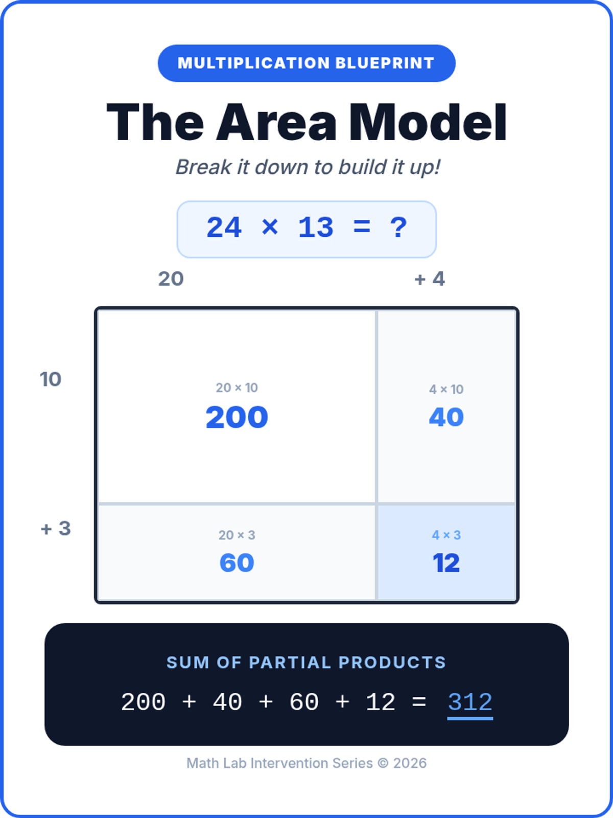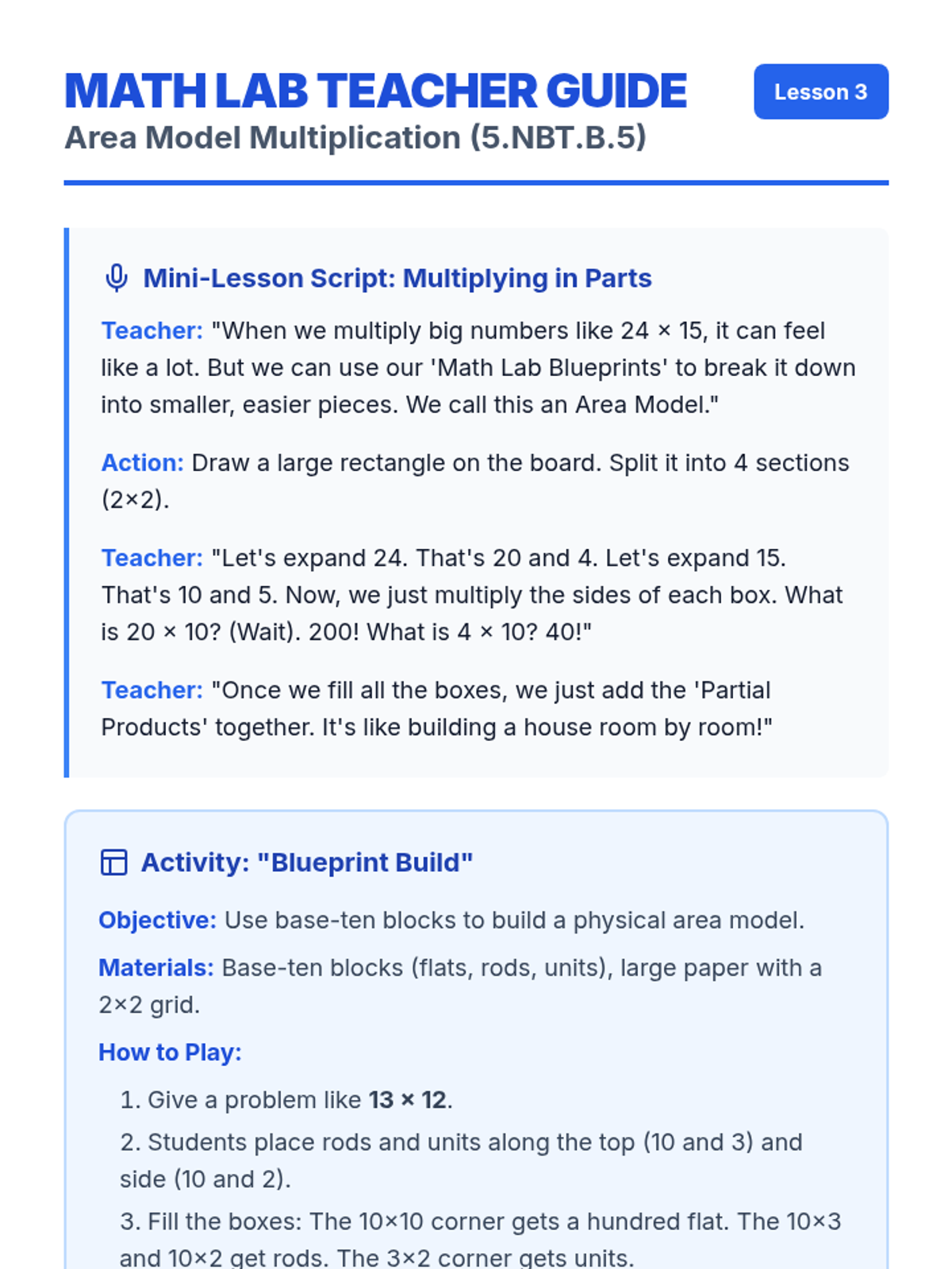 Focuses on 2-digit by 2-digit multiplication using area models to find four distinct partial products.