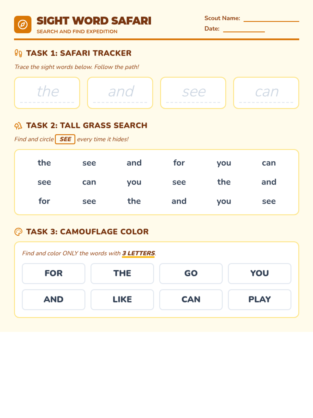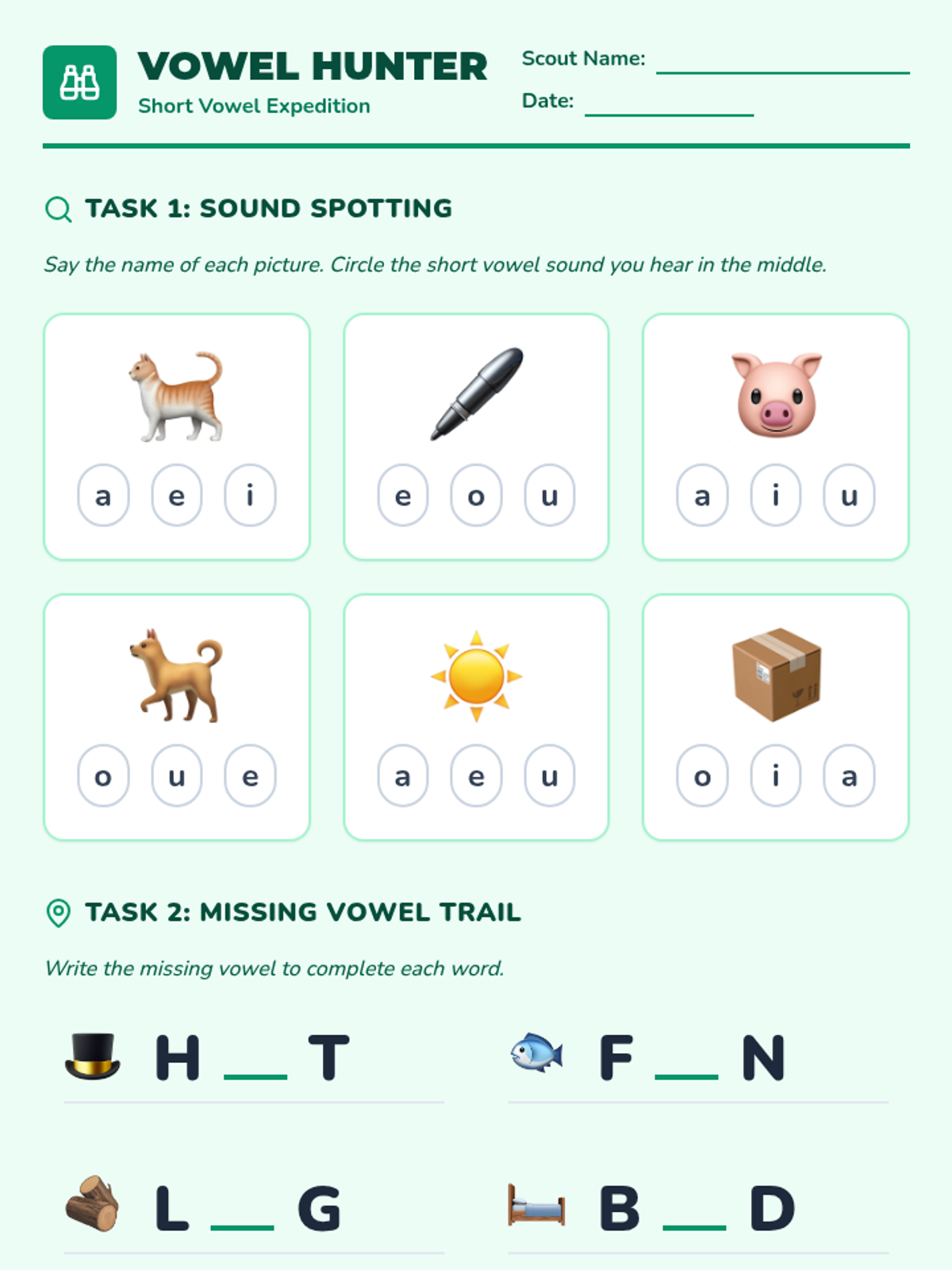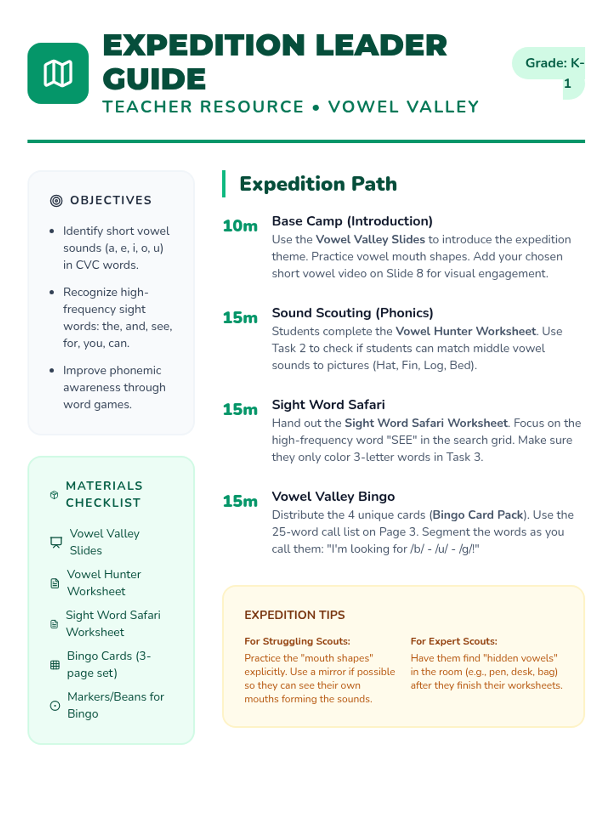 A foundational literacy lesson focusing on short vowel sounds and high-frequency sight words through an engaging 'nature expedition' theme. Students will identify vowel sounds in CVC words and practice common sight words.
