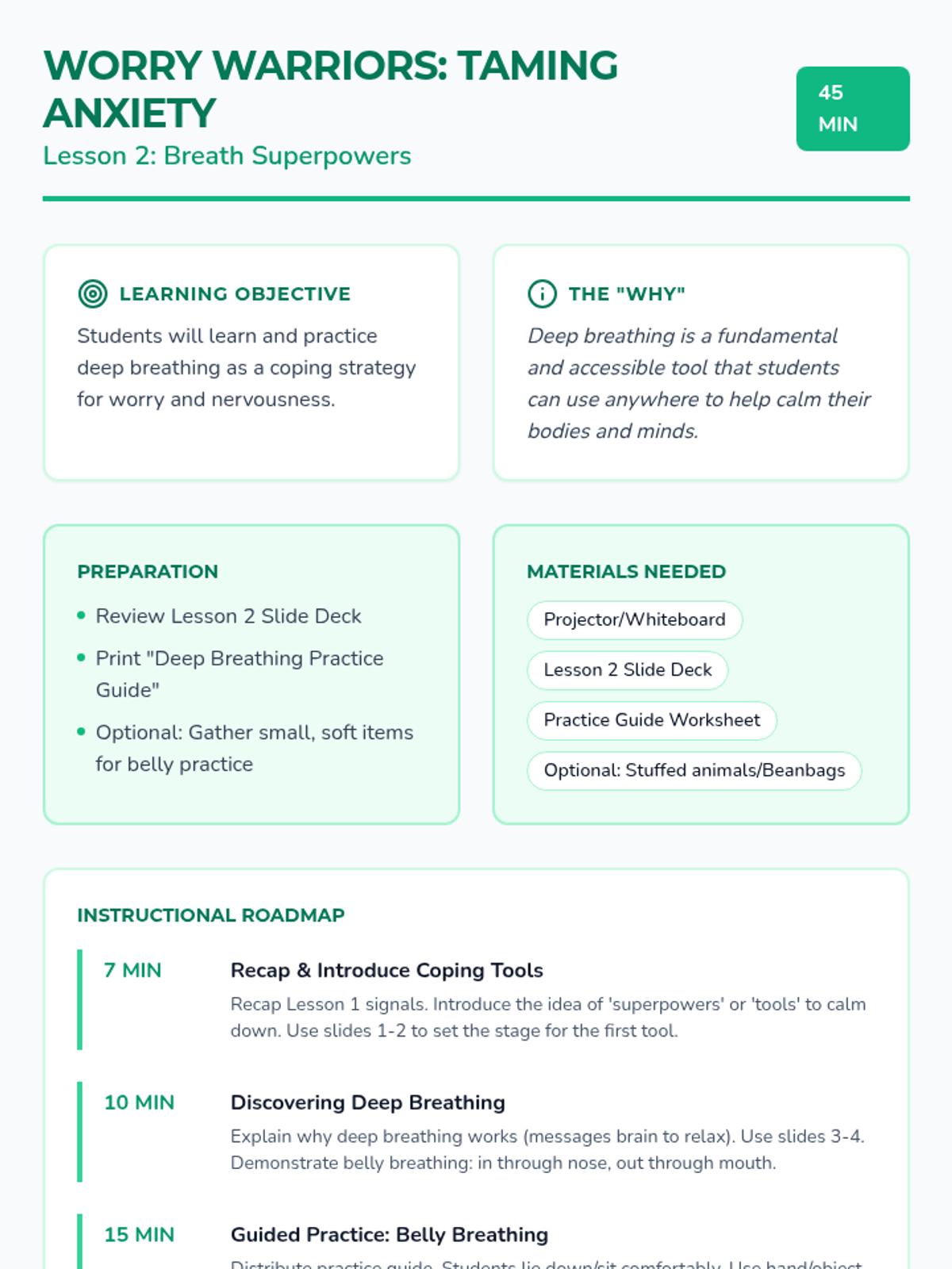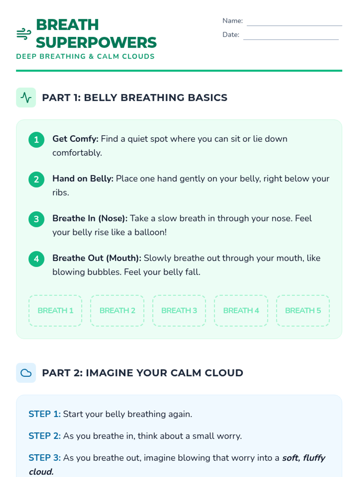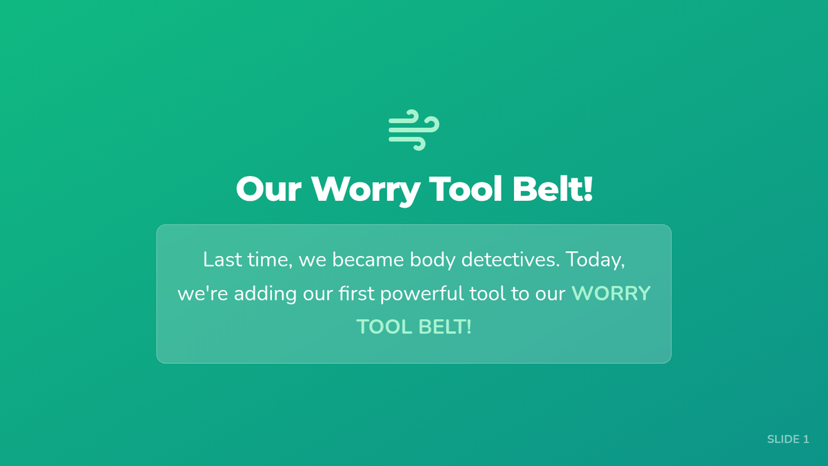 Students learn deep belly breathing as a tool for calming their nervous system and visualize worries floating away like 'calm clouds'.