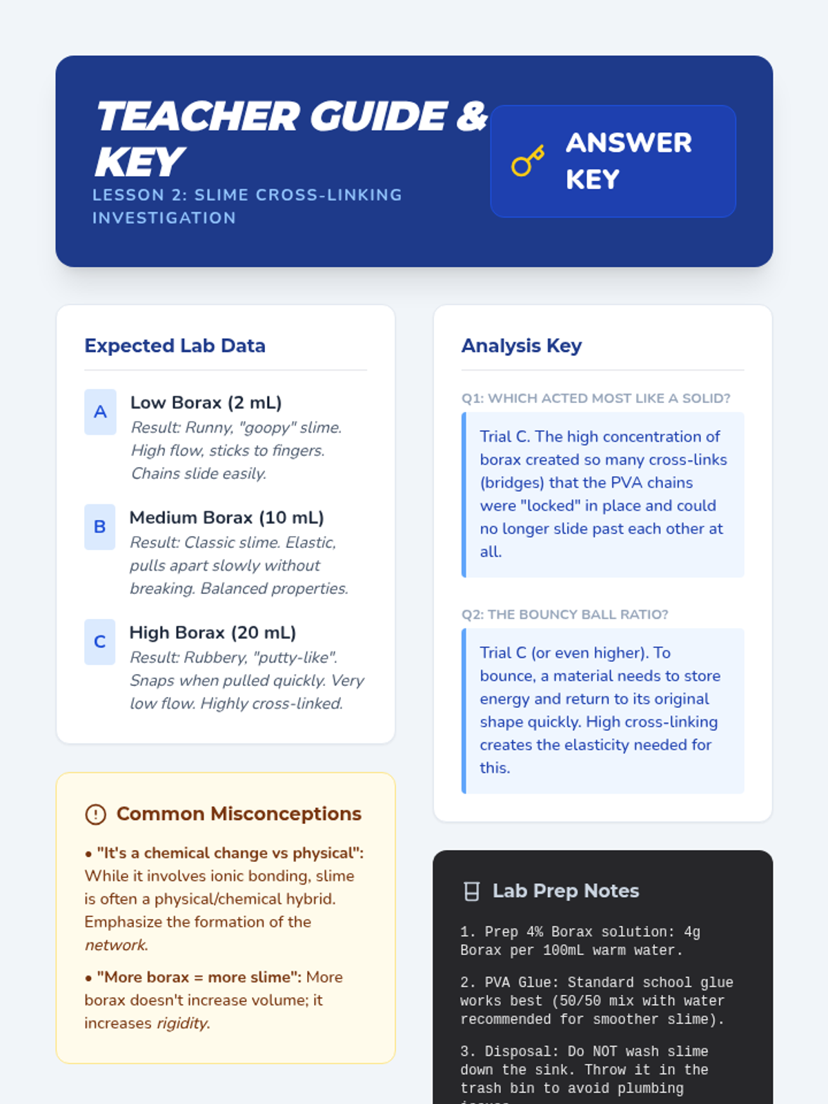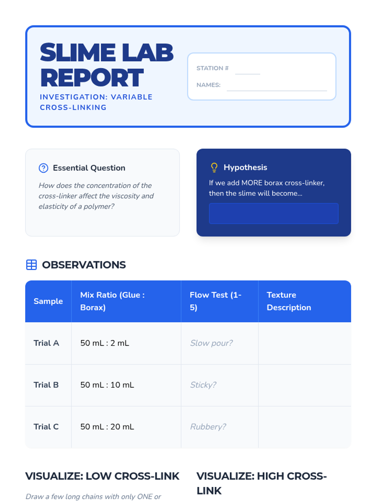 Exploration of cross-linking through a hands-on slime lab. Students investigate how chemical bonds between chains change a material's state.