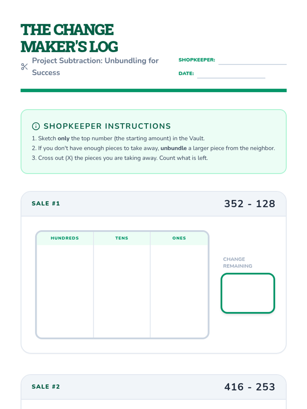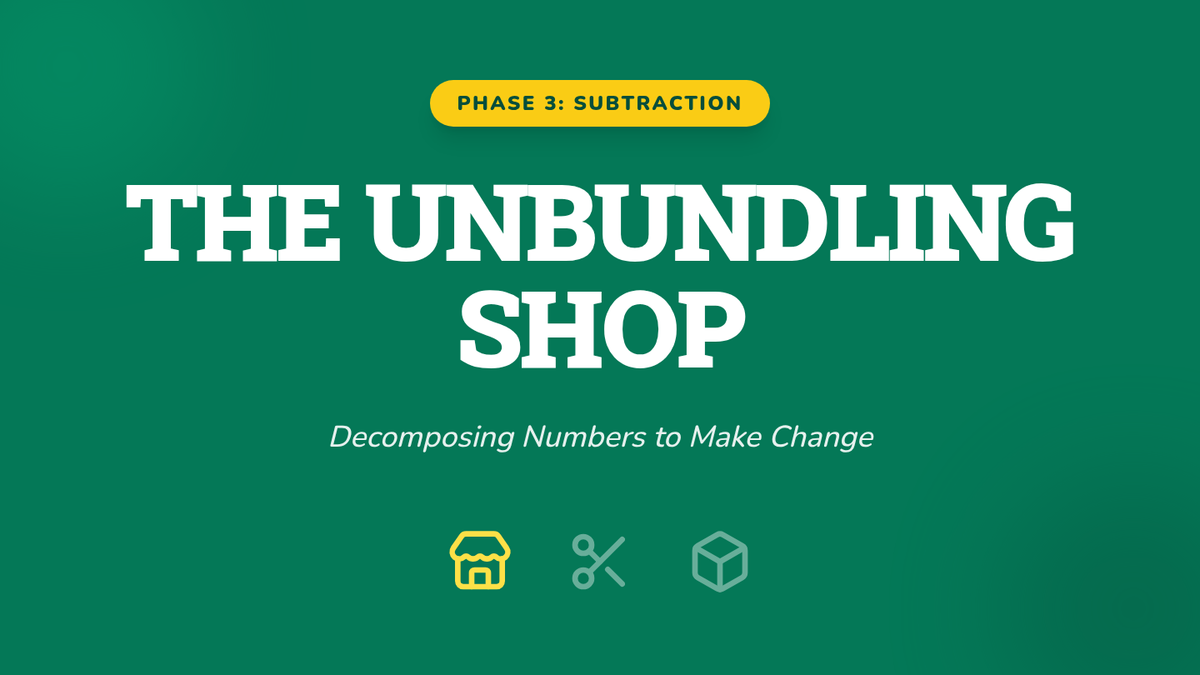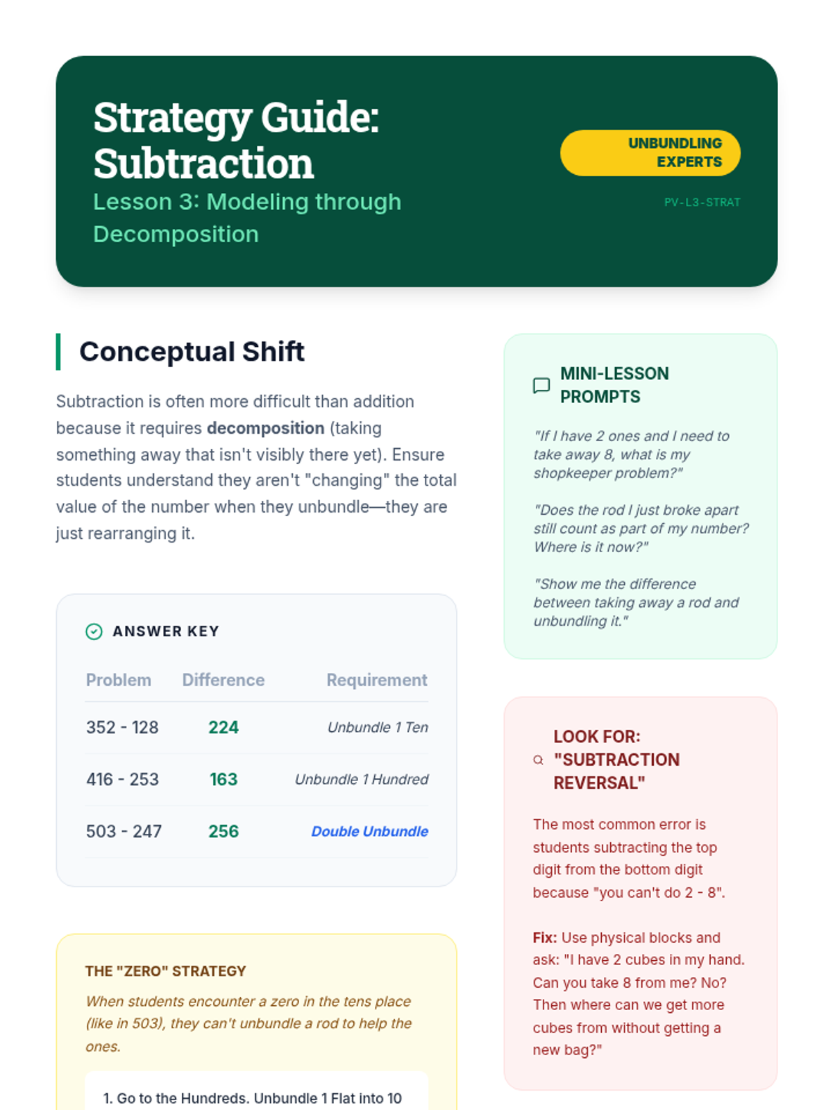Students tackle subtraction requiring borrowing by physically breaking apart base-ten blocks (unbundling) to create value in lower places.