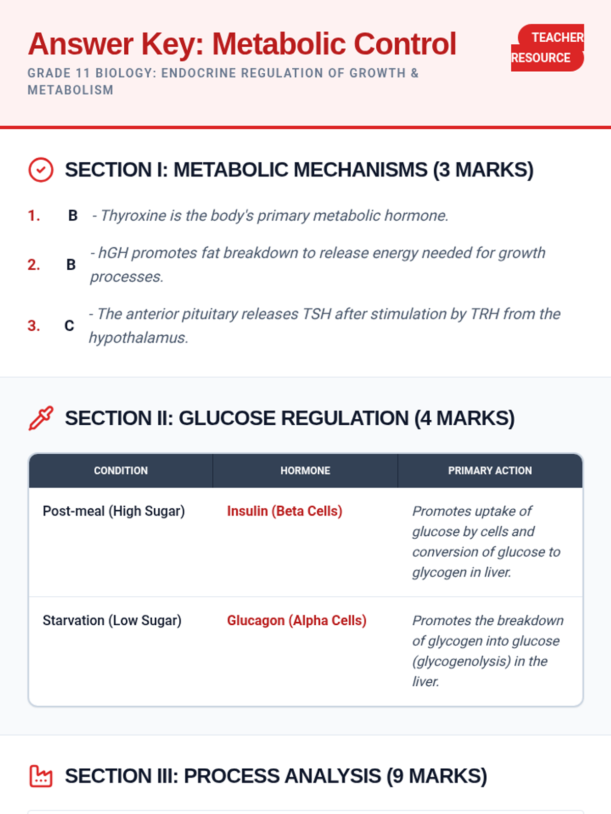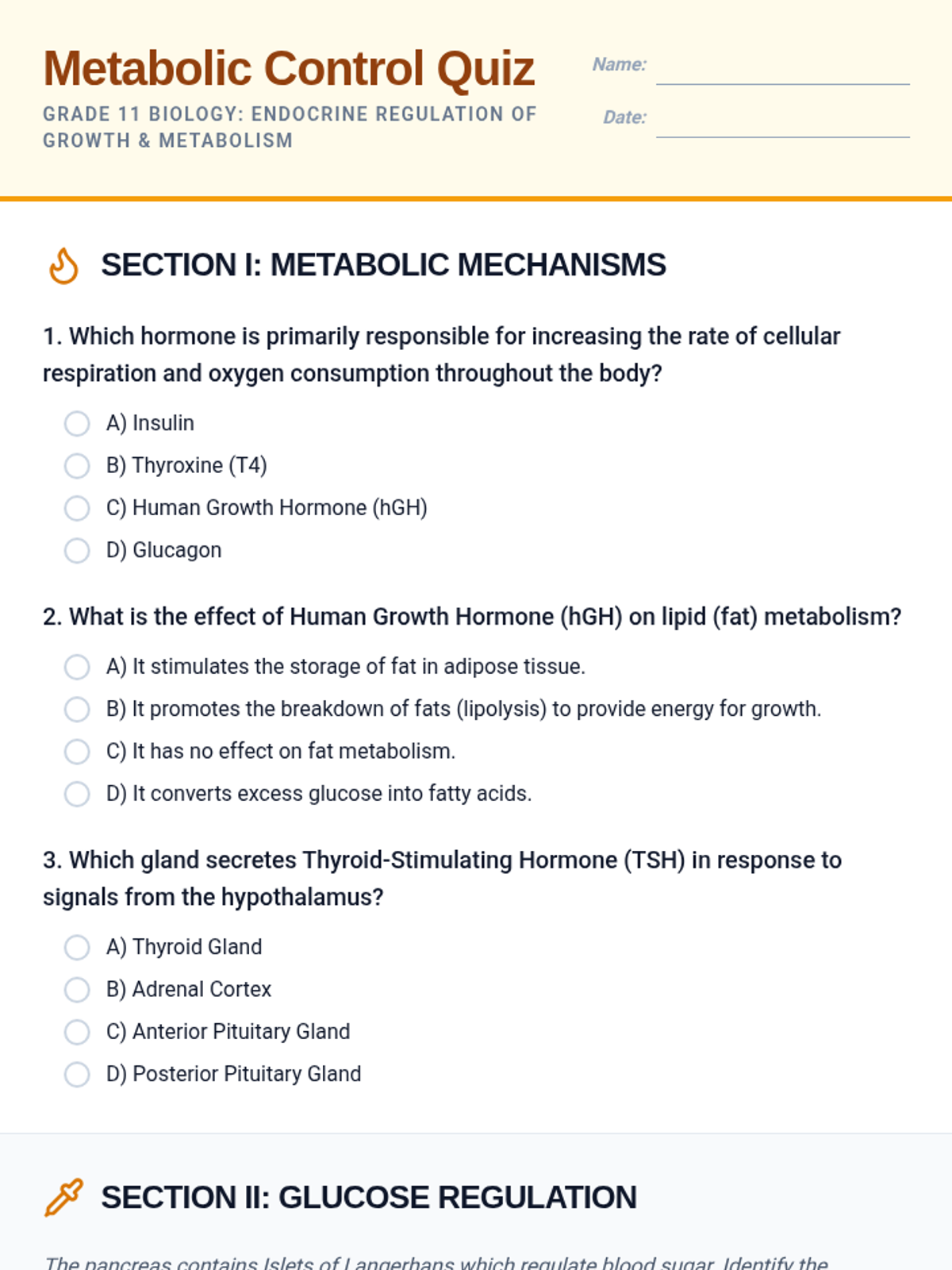 An assessment covering the endocrine system's role in regulating growth and metabolic rate, specifically focusing on the thyroid, growth hormone, and blood glucose regulation.
