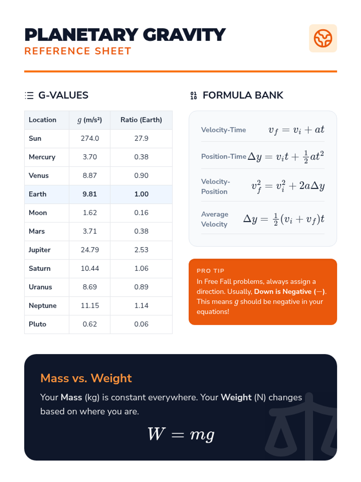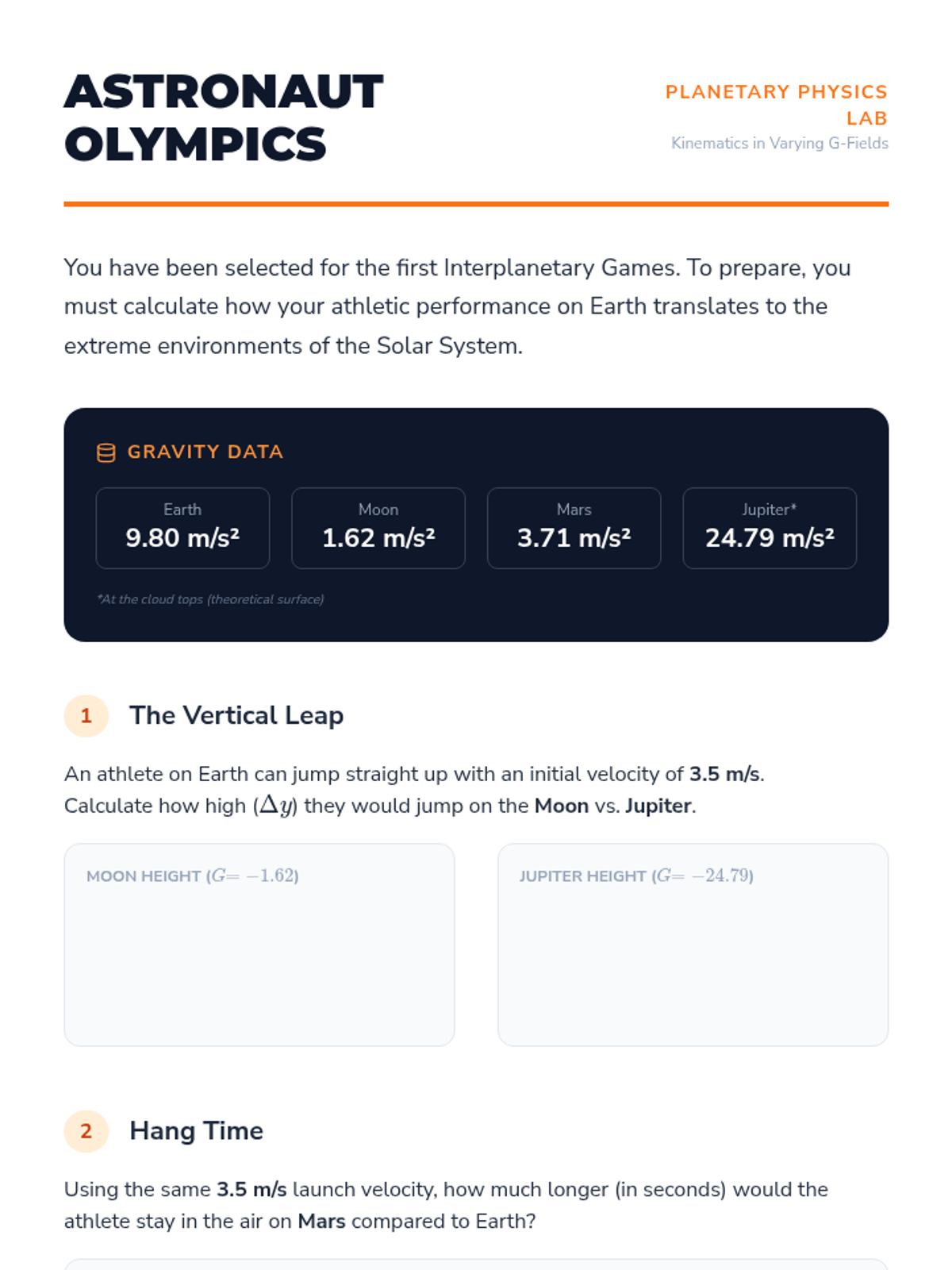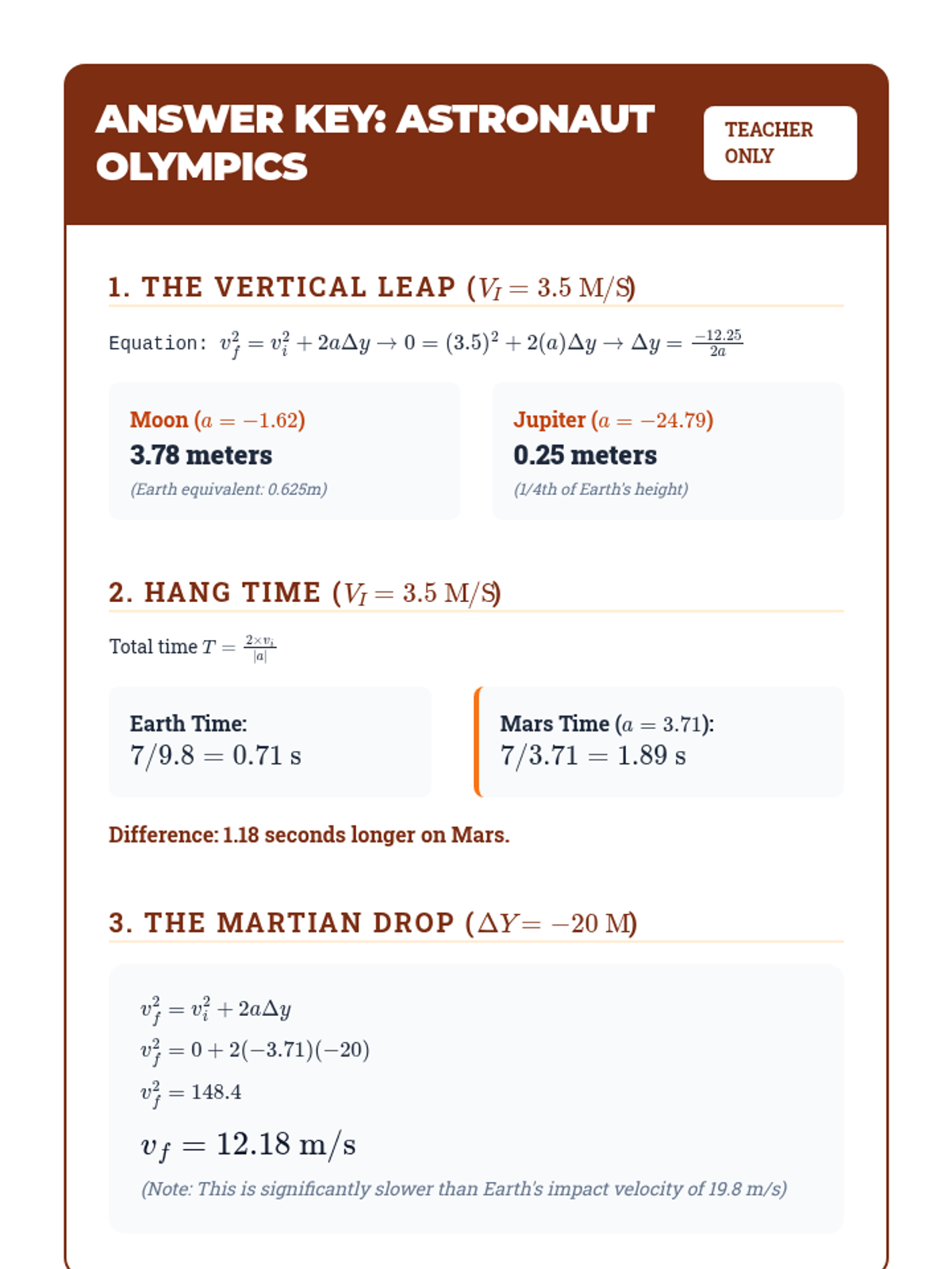 Students apply their free fall kinematic models to data from the Moon and Mars, calculating how jump heights and fall times differ in varying gravitational fields.