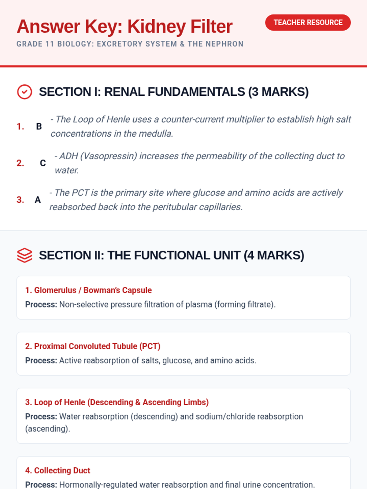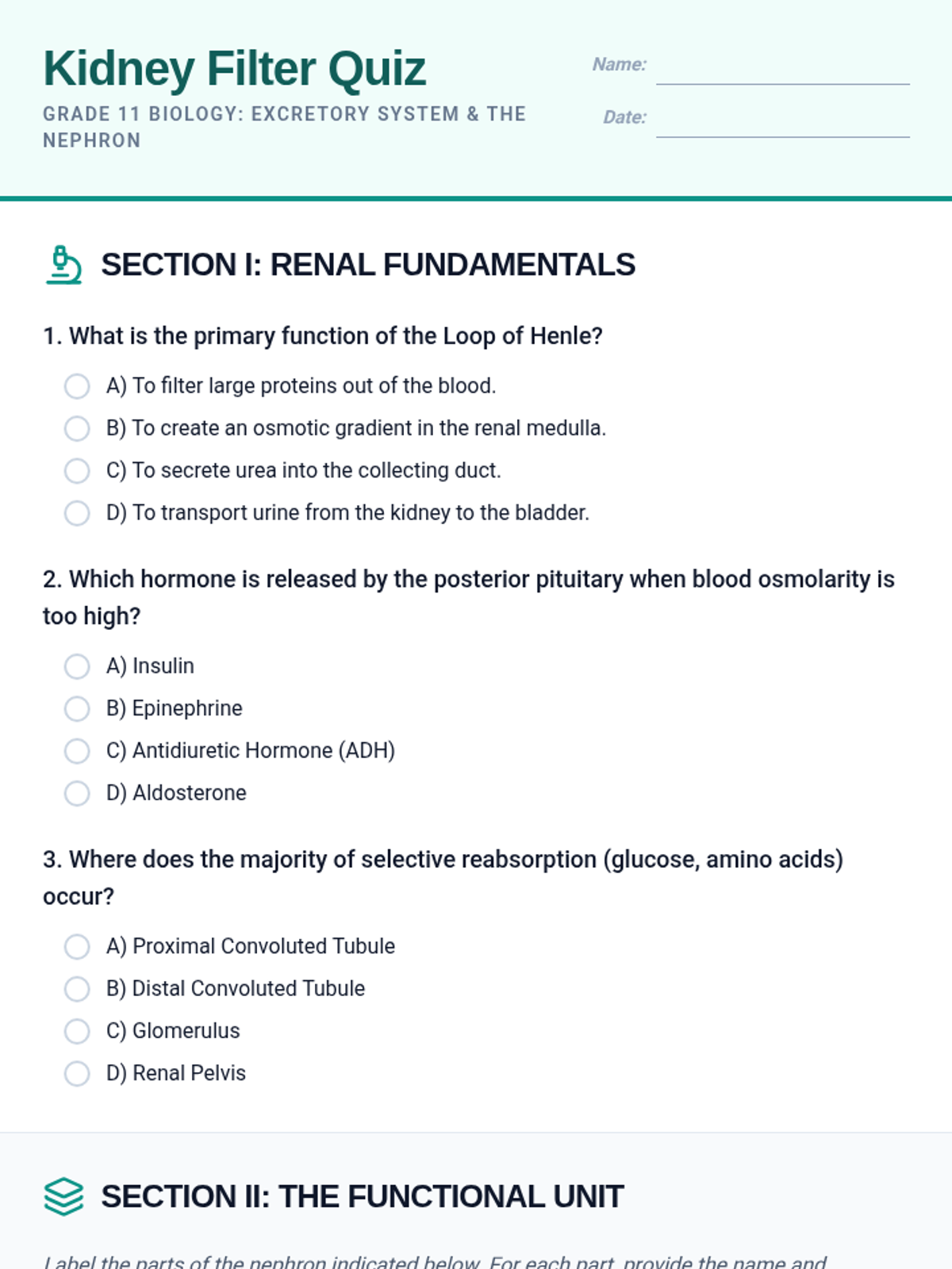 An assessment covering the anatomy of the kidney, the functional unit of the nephron, and the hormonal control of water balance (ADH).