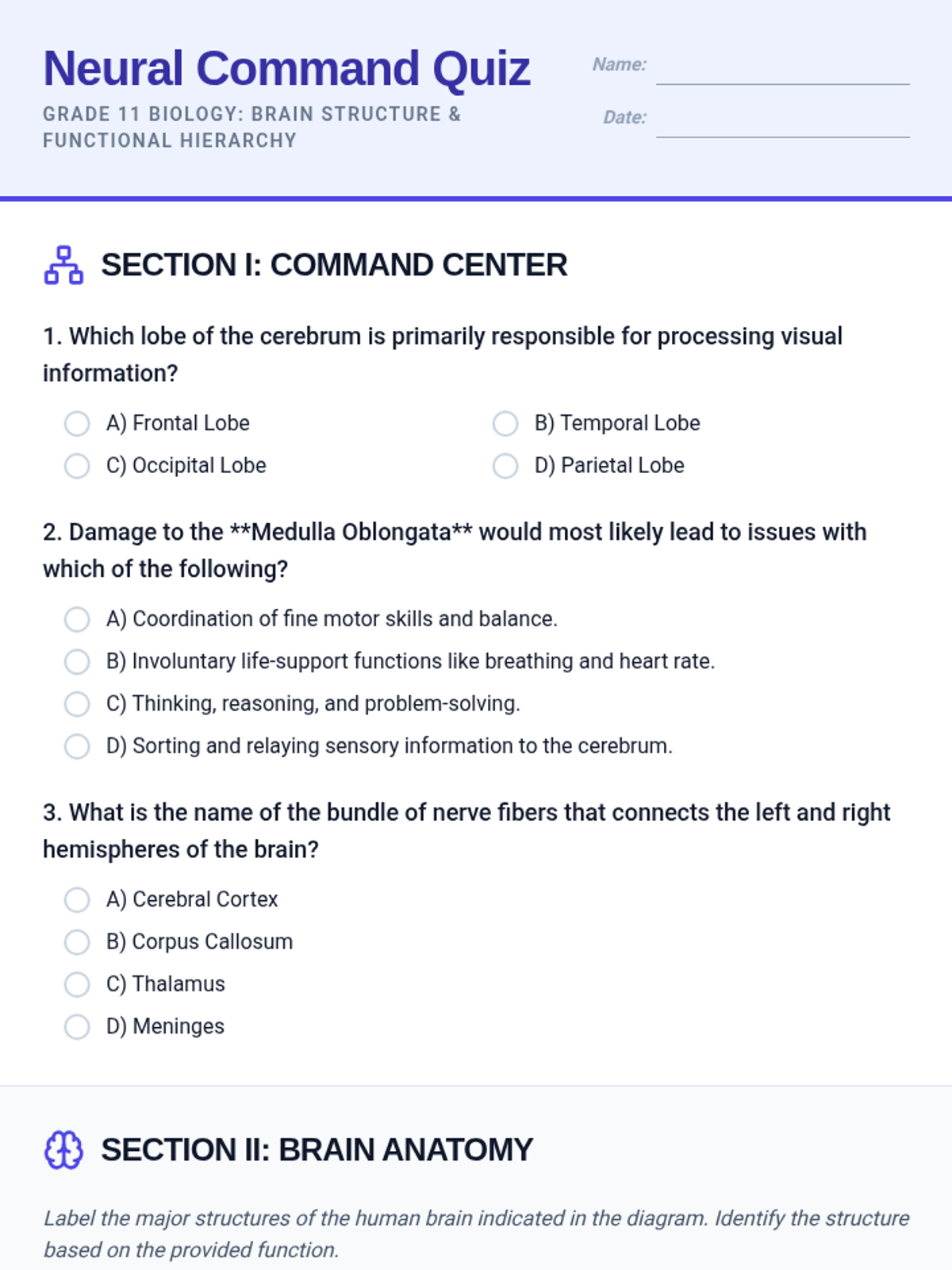 A foundational week-long unit on the human brain and nervous system, focusing on brain region anatomy, functional localization, and the impact of site-specific brain injuries.