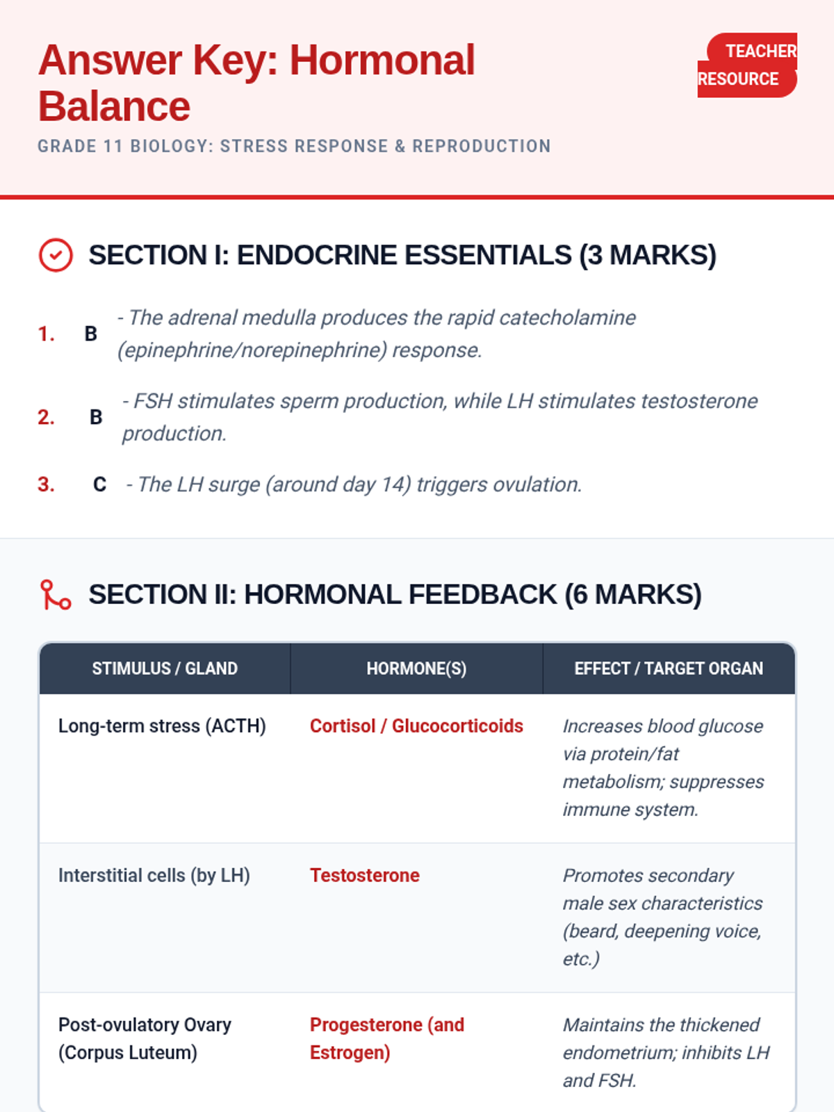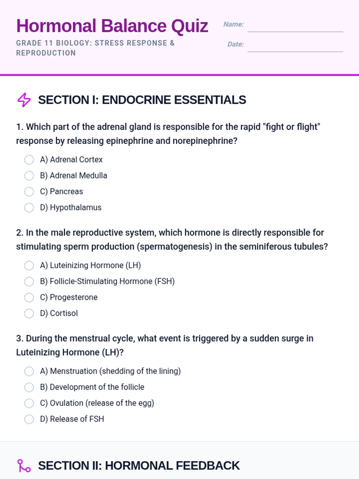 An assessment covering the endocrine system's role in the stress response (adrenal glands) and the hormonal regulation of the human reproductive system.