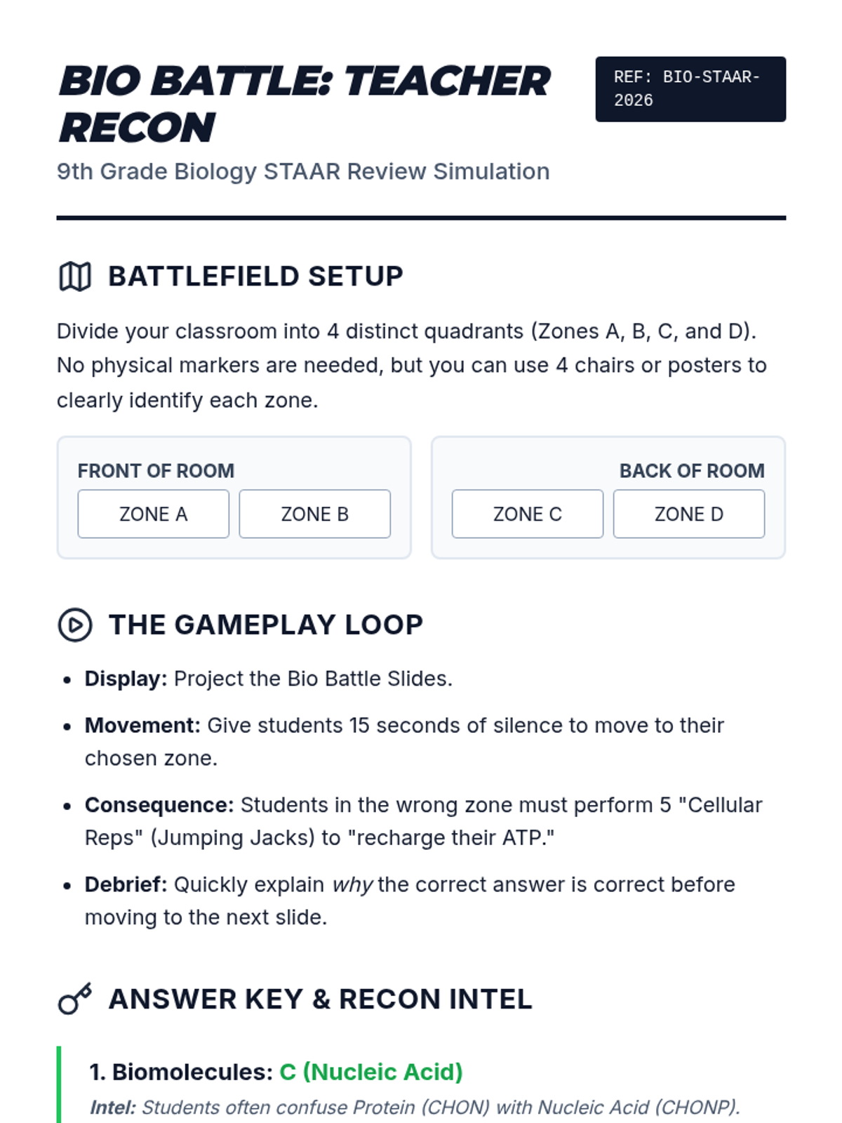A high-energy, movement-based review game designed to prepare students for the 9th grade biology STAAR test. This lesson focuses on the most challenging concepts like protein synthesis, biomolecules, and succession using a "vote with your feet" classroom mechanic.