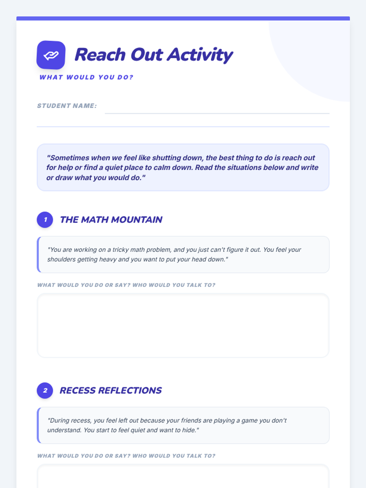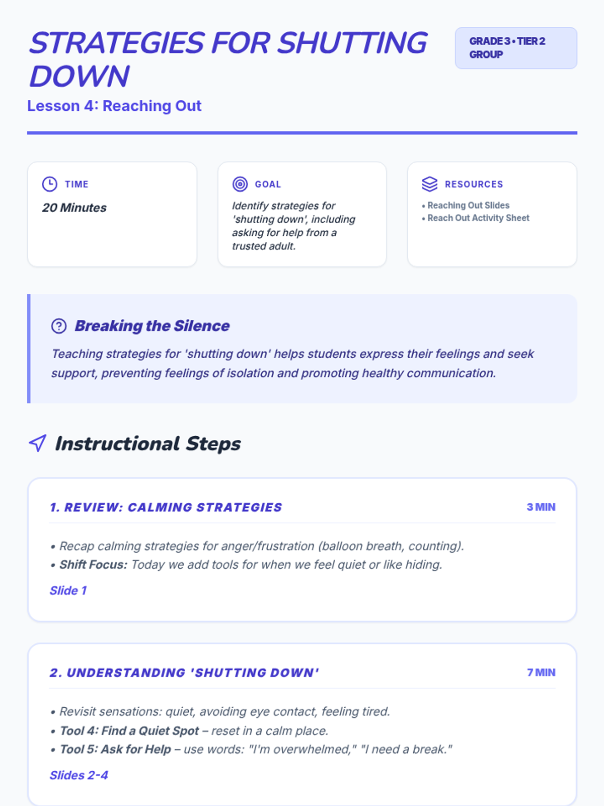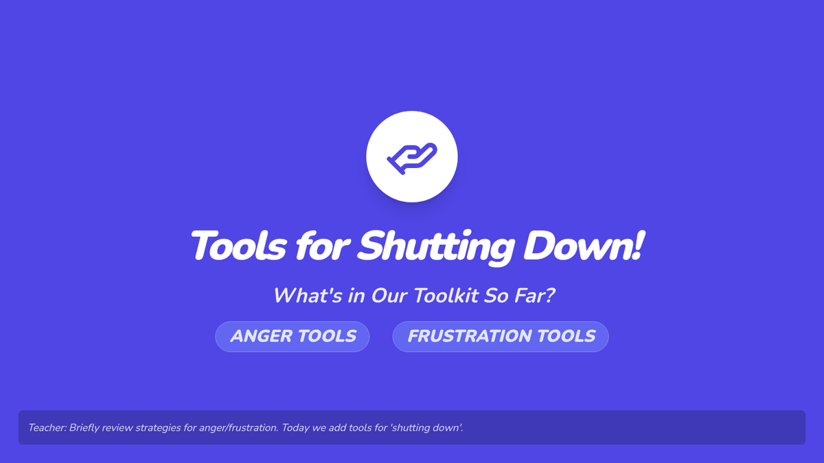 Students learn specific strategies for when they feel like 'shutting down', focusing on seeking help from trusted adults and taking quiet resets.