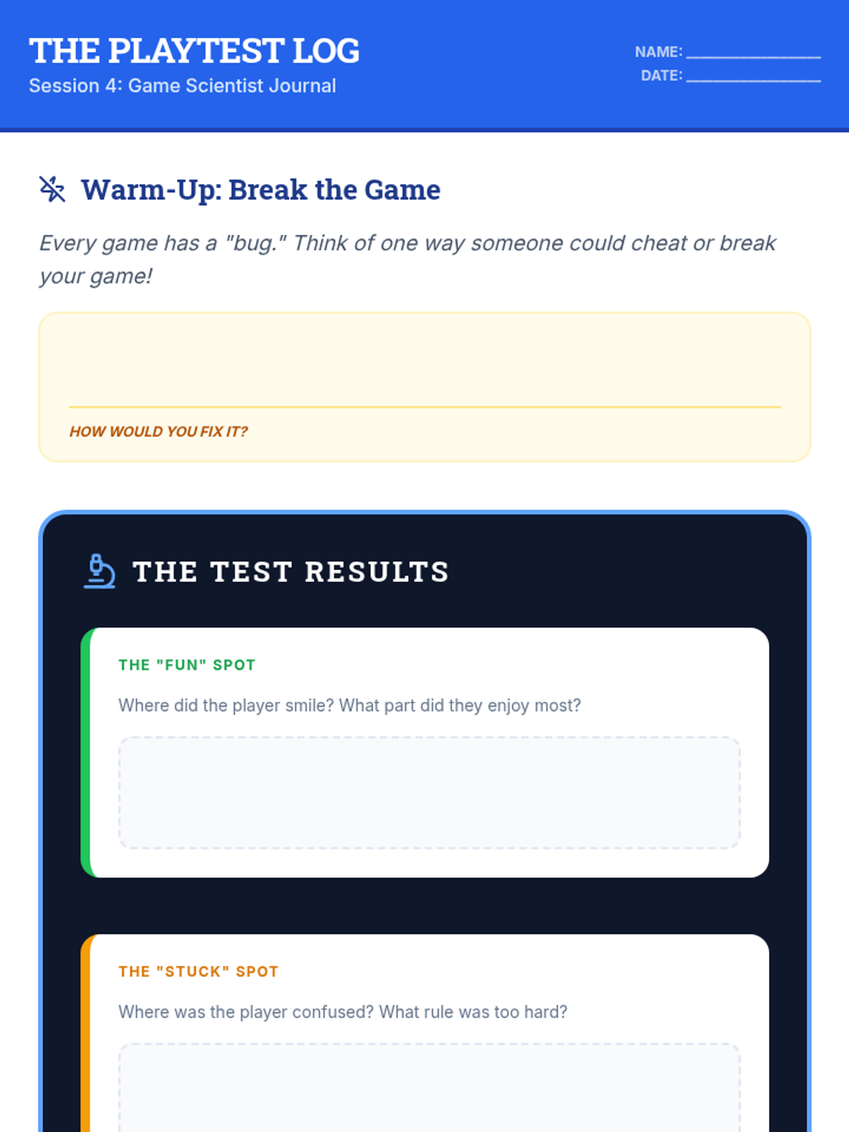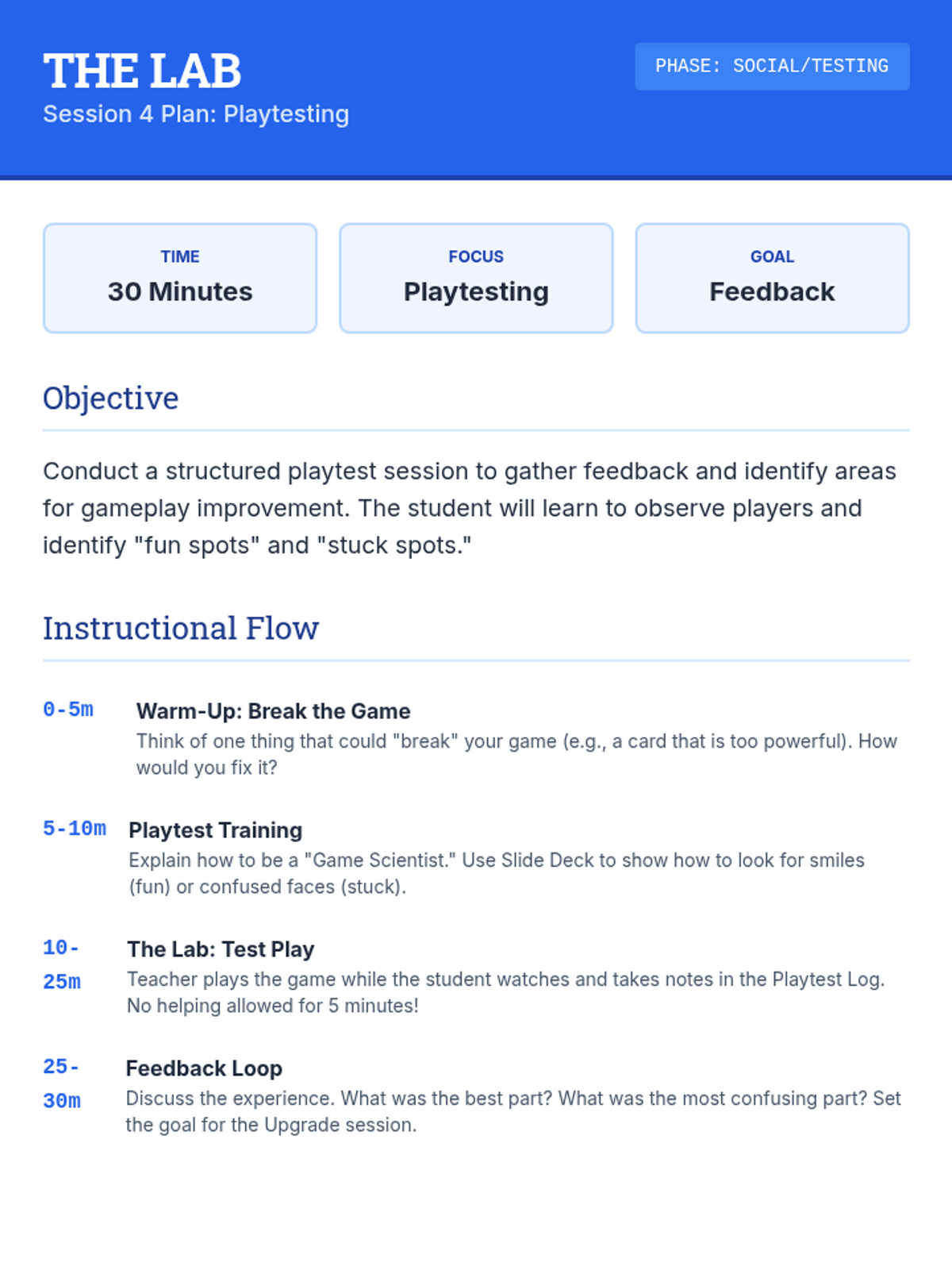 Conduct a structured playtest session to gather feedback and identify areas for gameplay improvement.