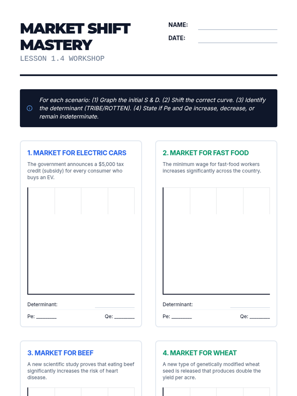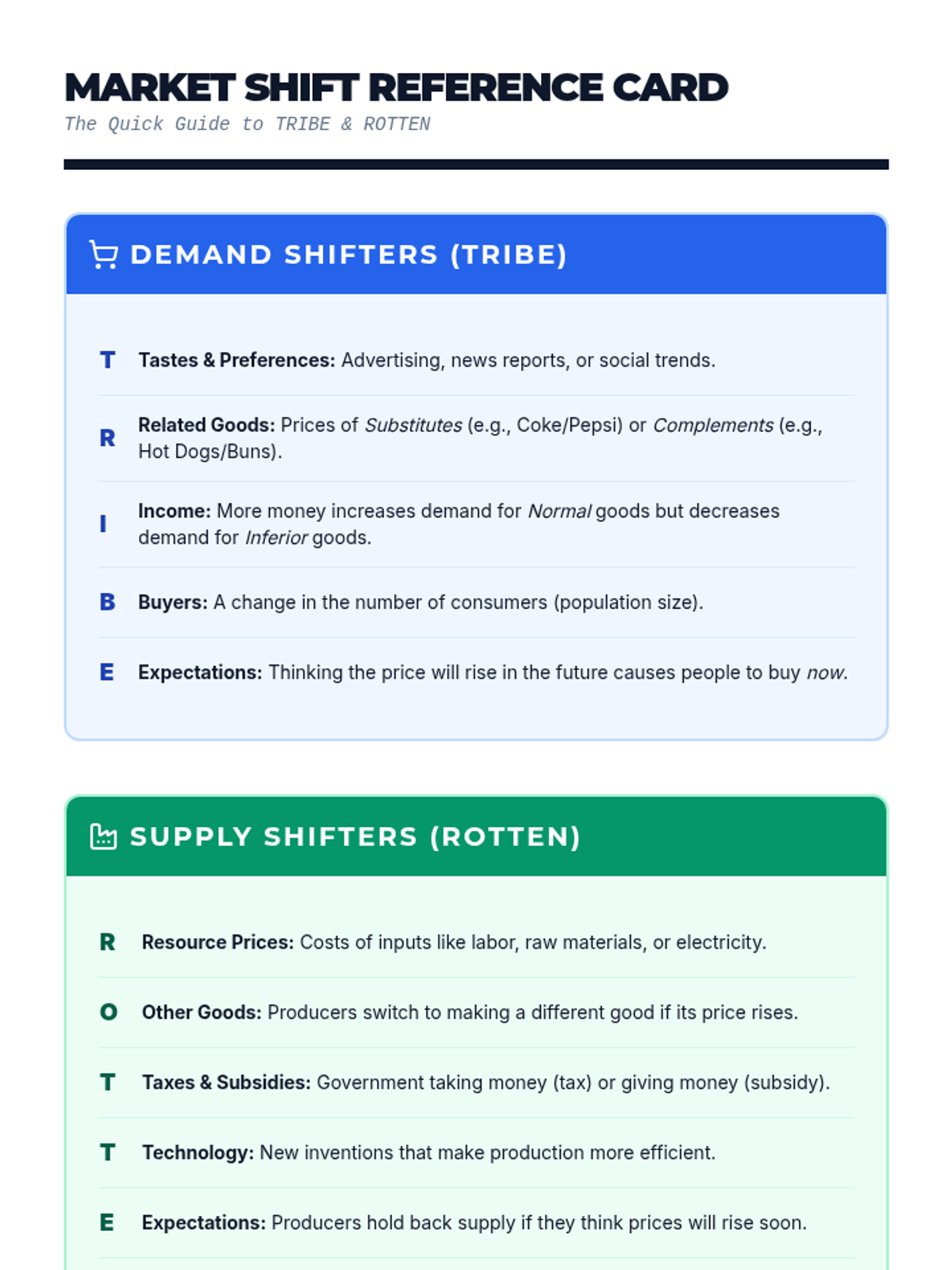 This rigorous lesson introduces the non-price determinants (TRIBE and ROTTEN) that shift supply and demand curves. Students practice 'double shifting' scenarios to predict indeterminate outcomes in price or quantity.