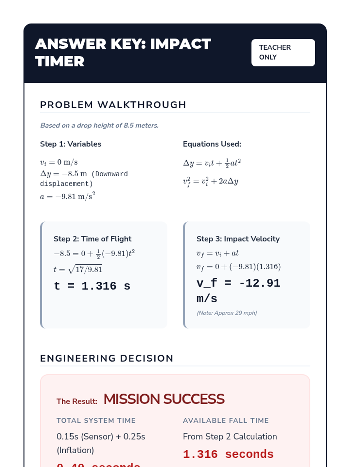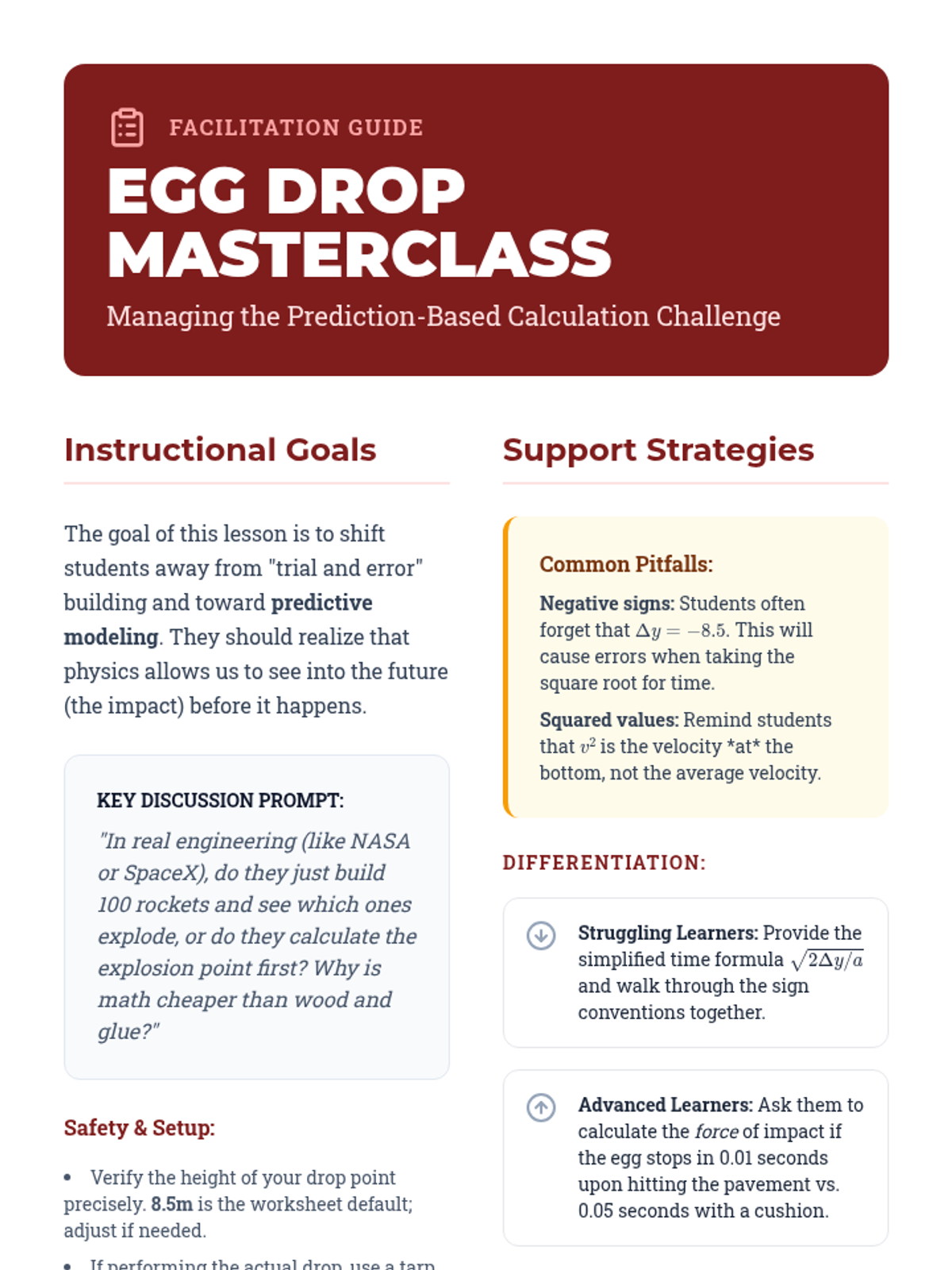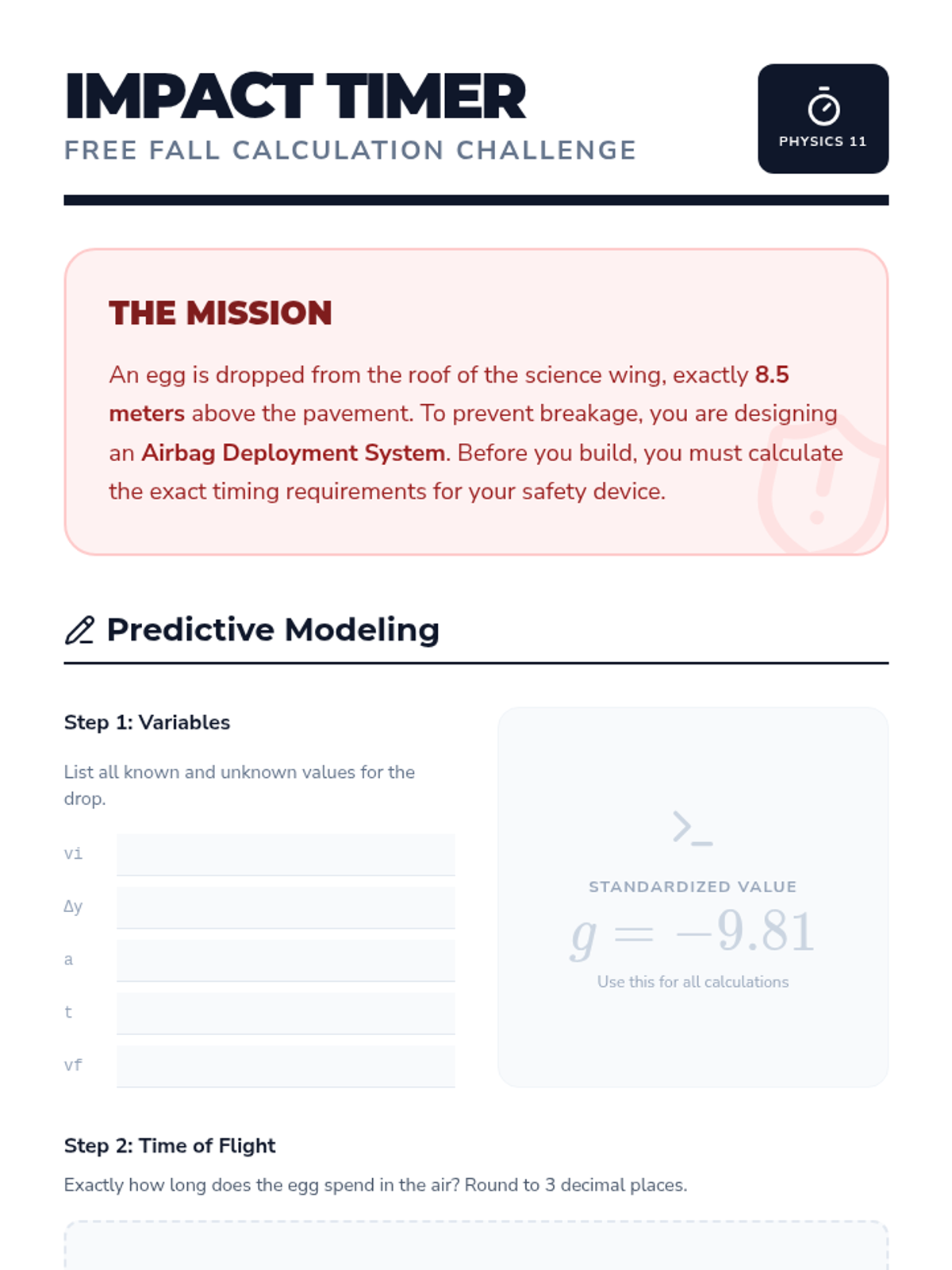 A predictive modeling challenge where students calculate impact velocity and fall time for an egg drop, emphasizing the math behind safety systems.