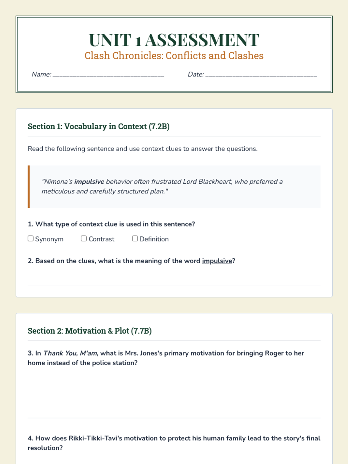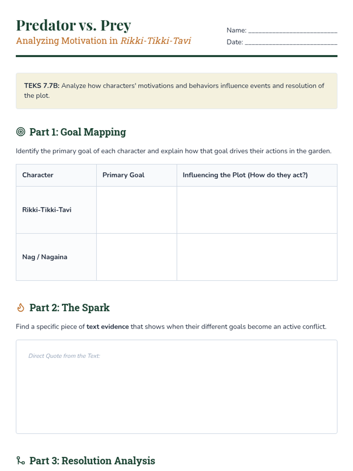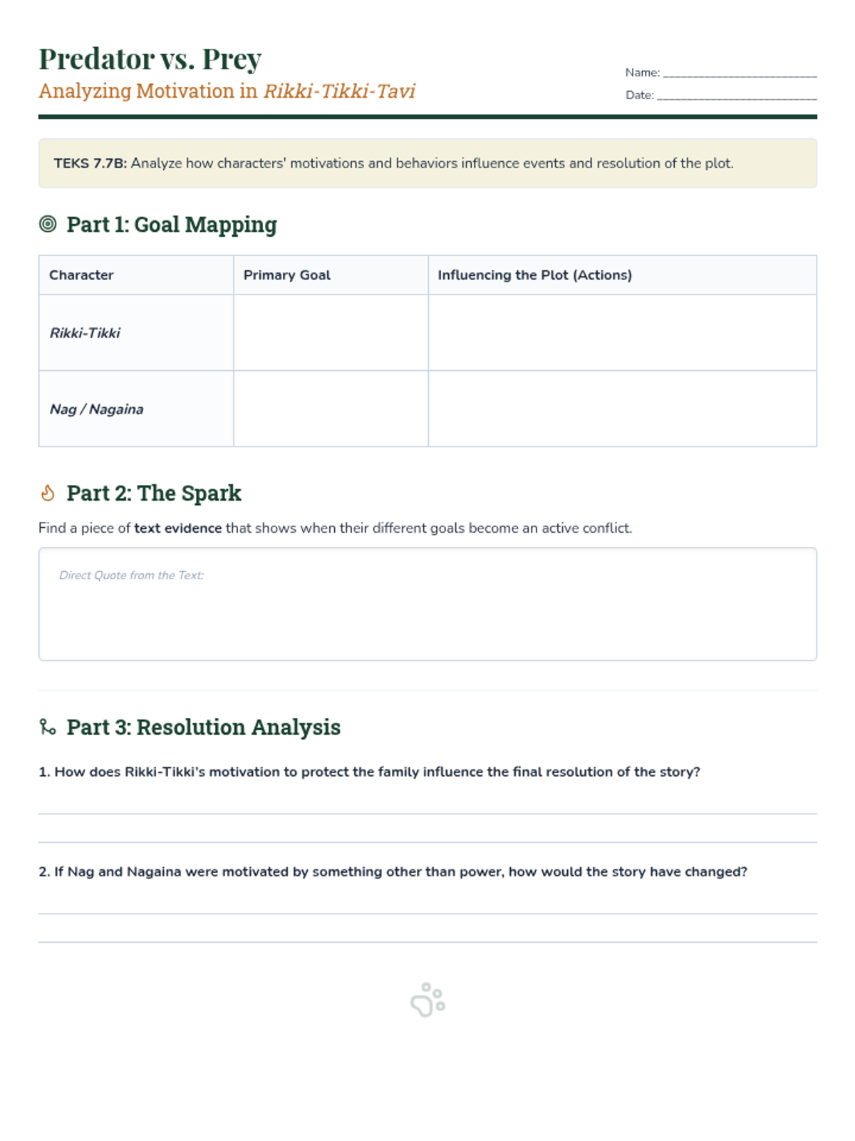 Intro to Unit, Essential Question, and analyzing character motivation in Kipling's 'Rikki-Tikki-Tavi'.