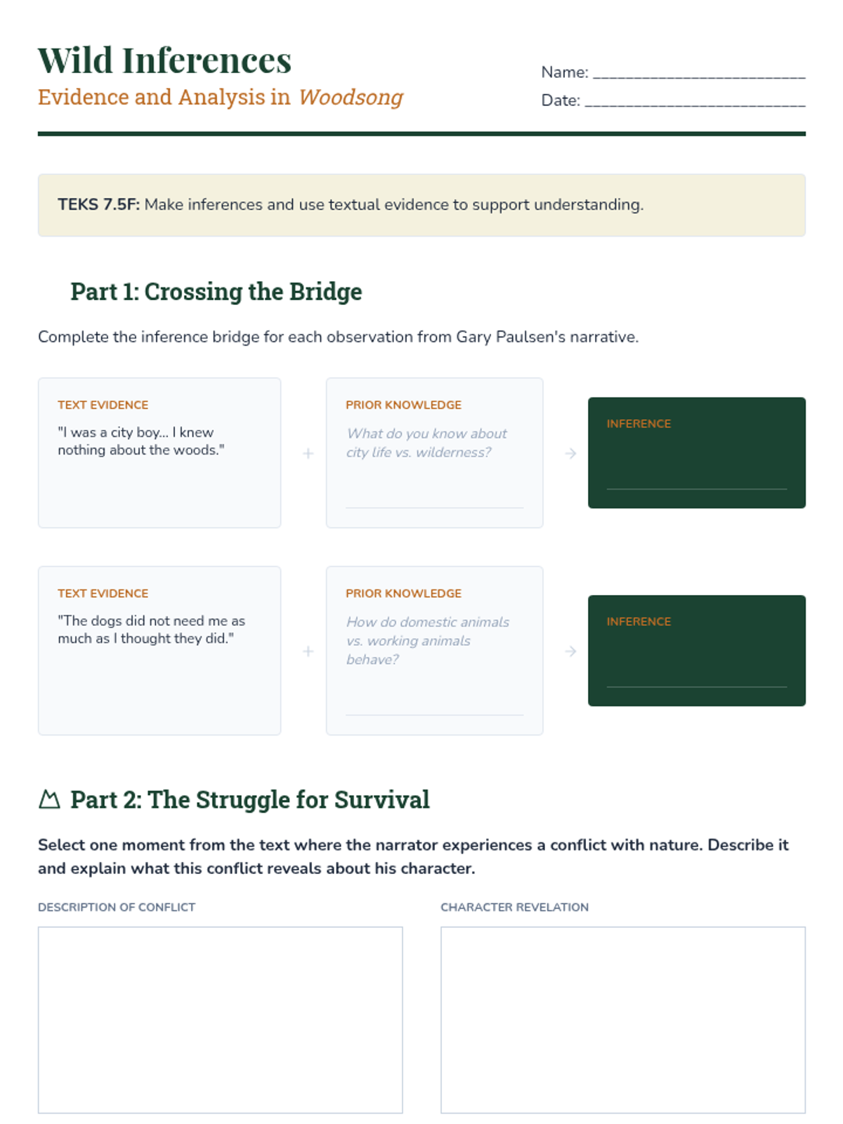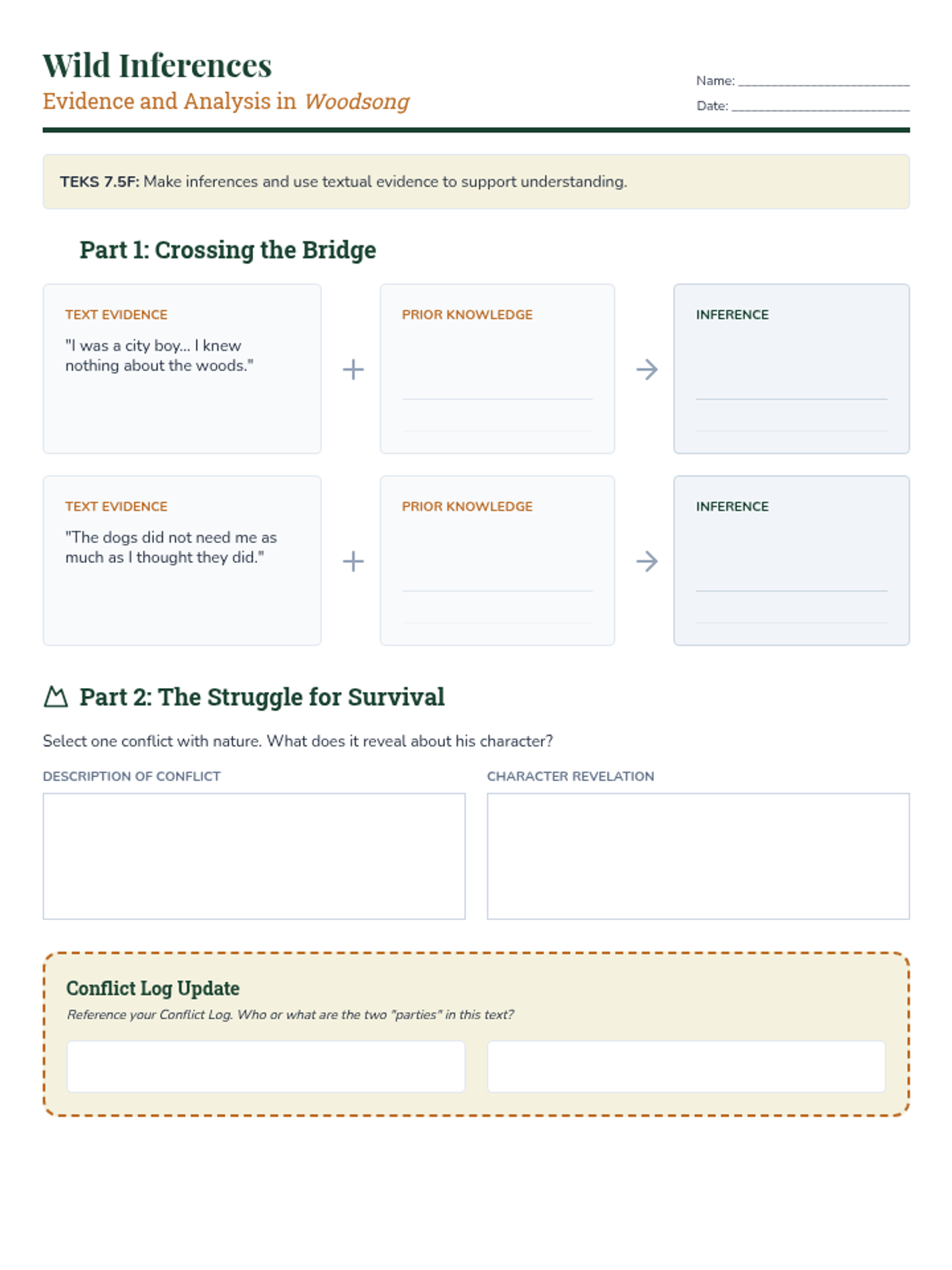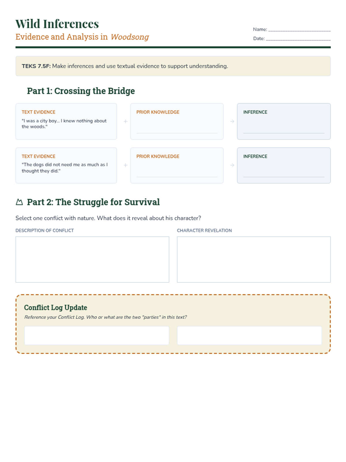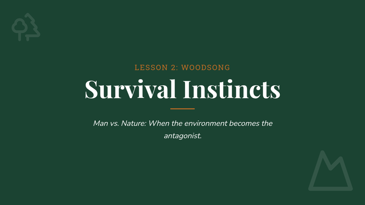 Analysis of survival and external conflict in informational texts through 'Woodsong'.