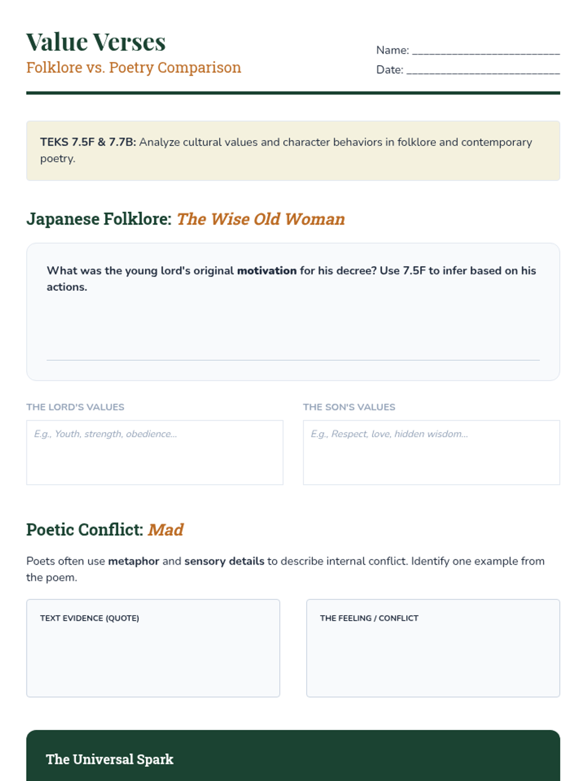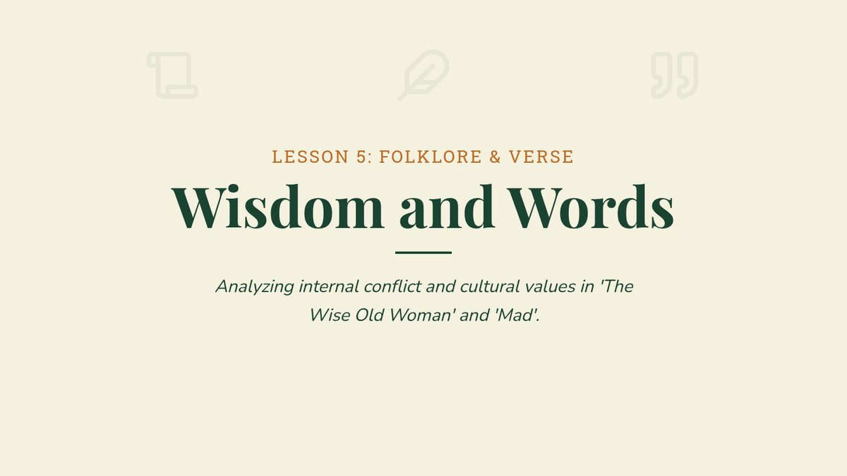 Examining internal conflict and cultural values in 'The Wise Old Woman' and 'Mad'.