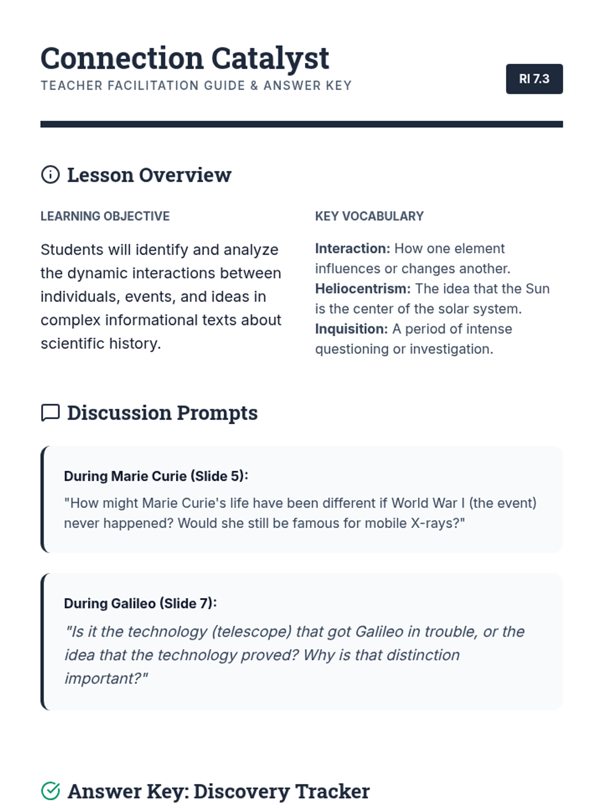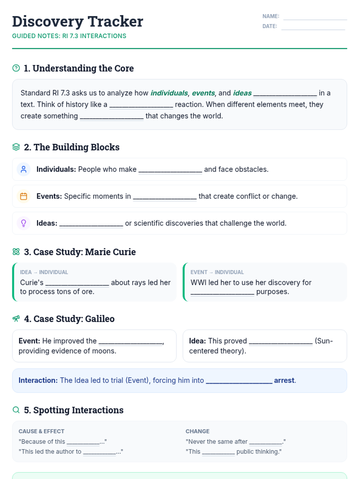 Students will analyze how individuals, events, and ideas interact in the context of historical biographies and scientific breakthroughs, specifically targeting RI 7.3.