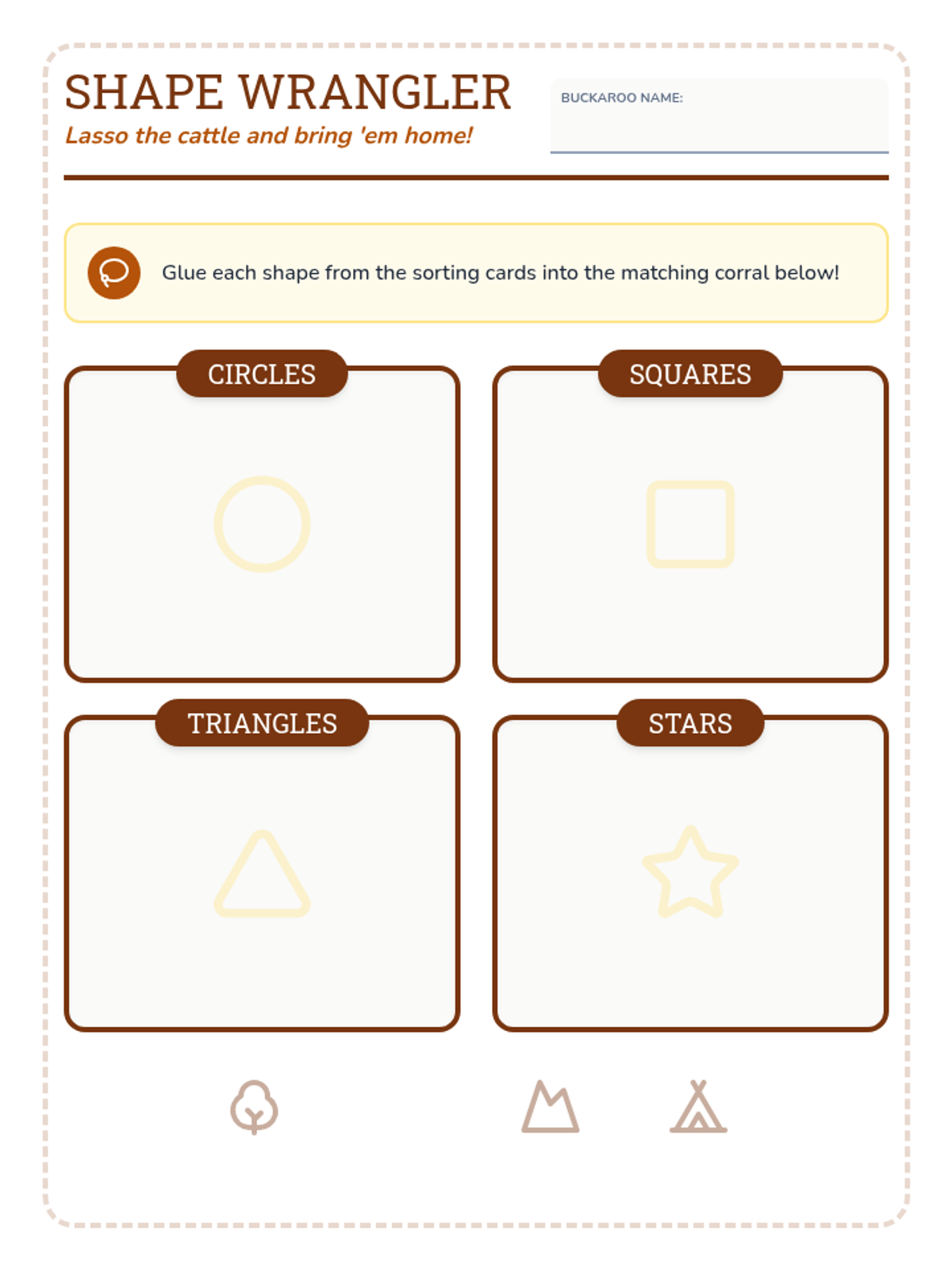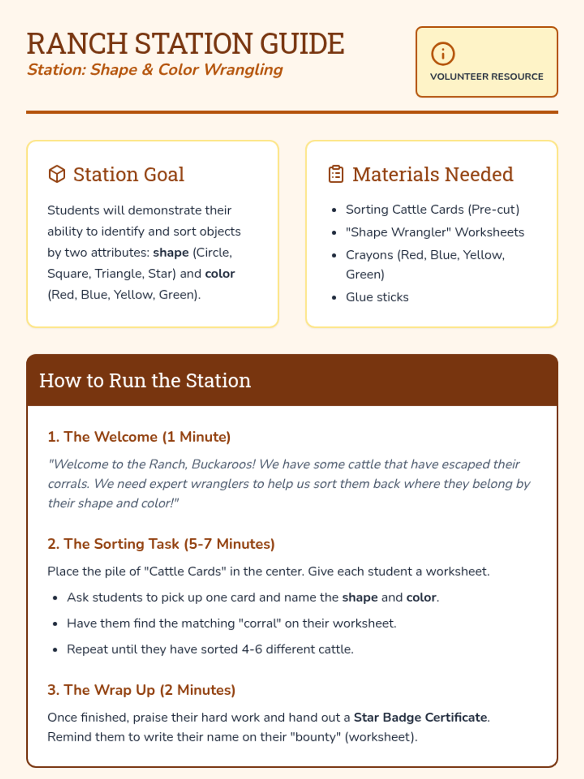 A collection of Western-themed activities for a Kindergarten Round Up, focusing on fundamental color and shape identification through engaging hands-on "ranch" tasks.