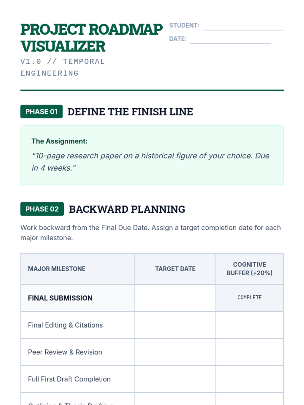 Learners create visual roadmaps and backward plans for long-term writing projects to manage sustained attention and deadlines.