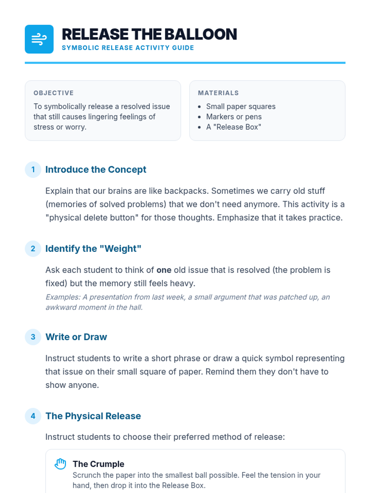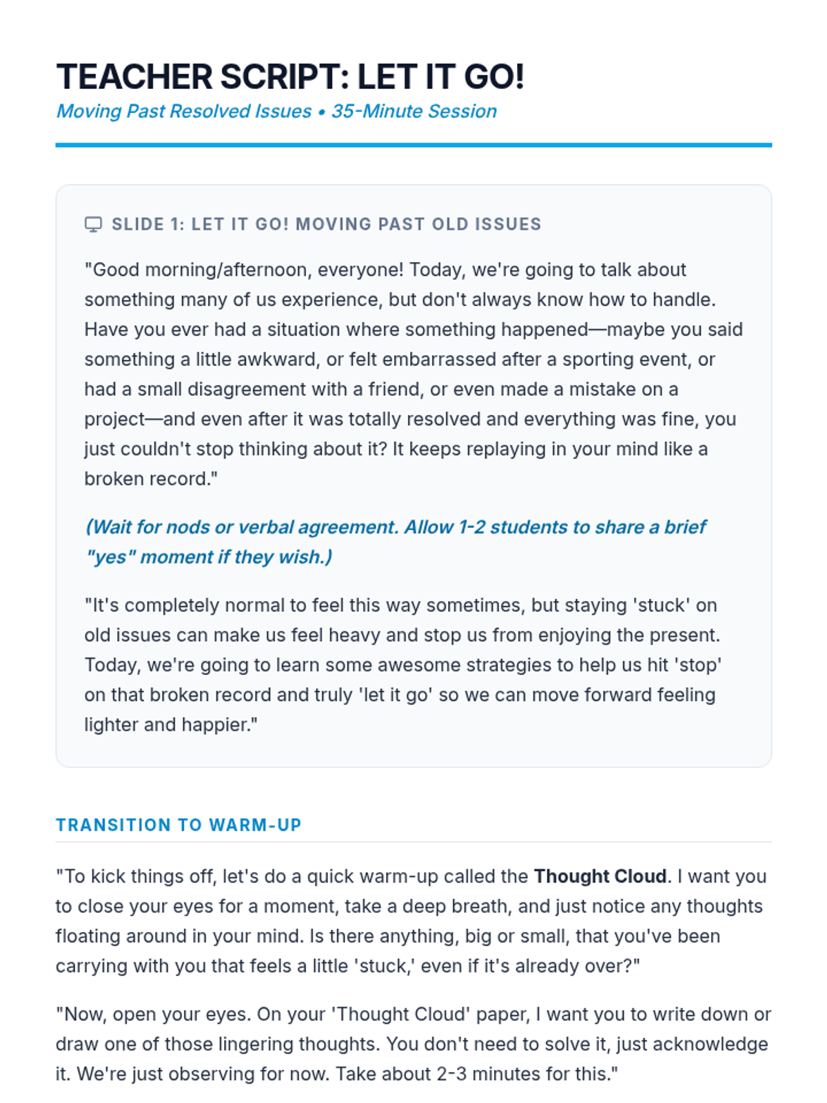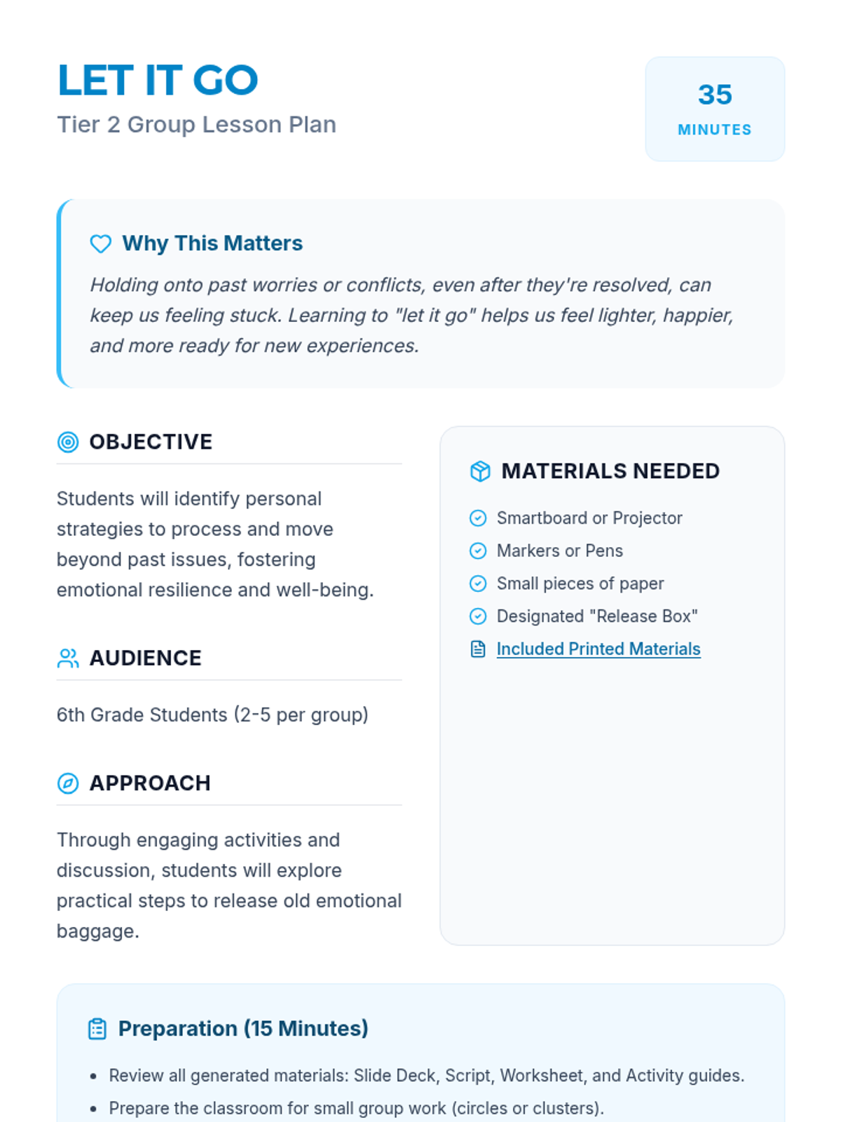 A 35-minute Tier 2 group session for 6th graders focused on emotional resilience and strategies for moving past resolved issues. Students learn to identify lingering thoughts and use practical tools like positive self-talk and mindfulness to "let go."