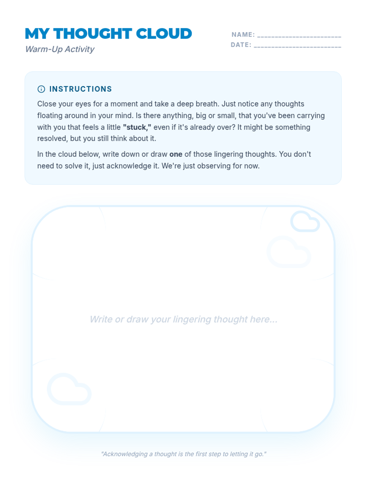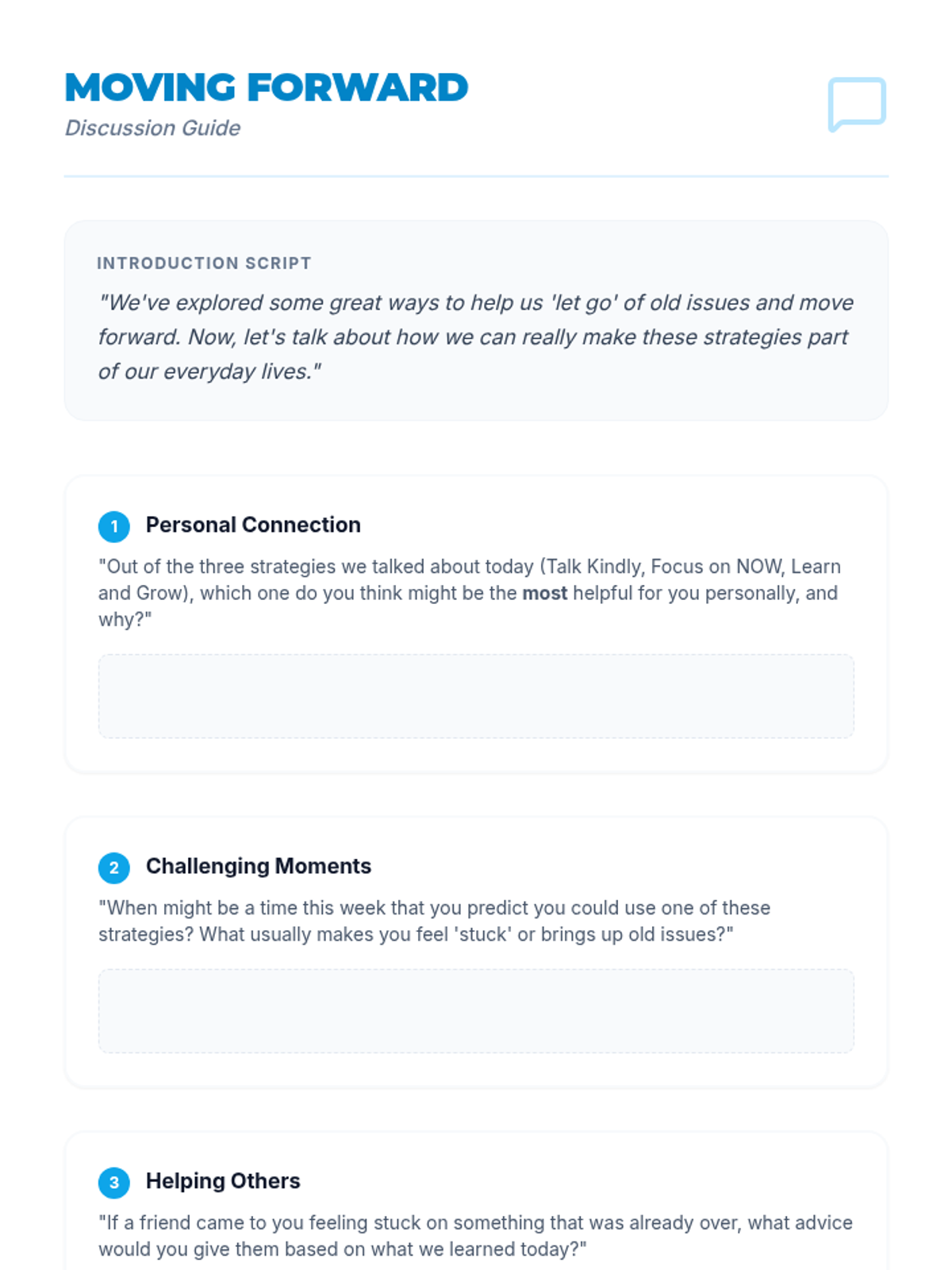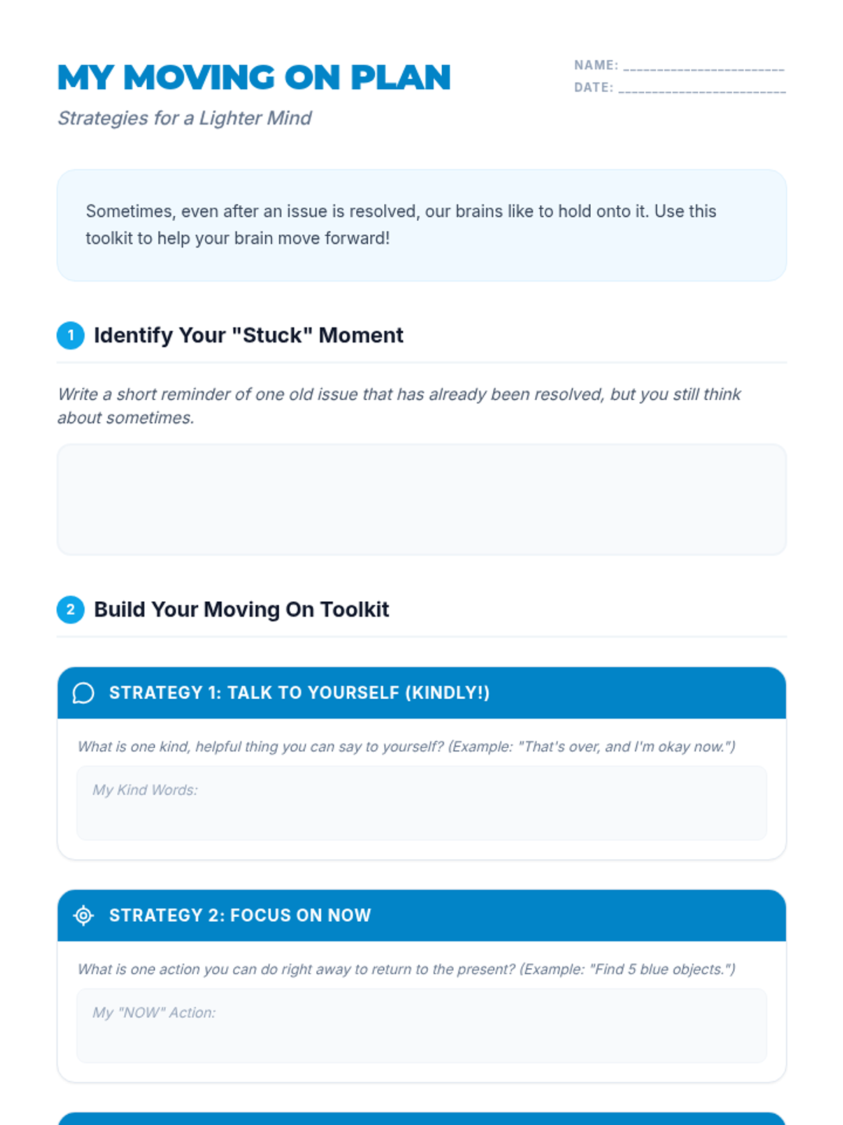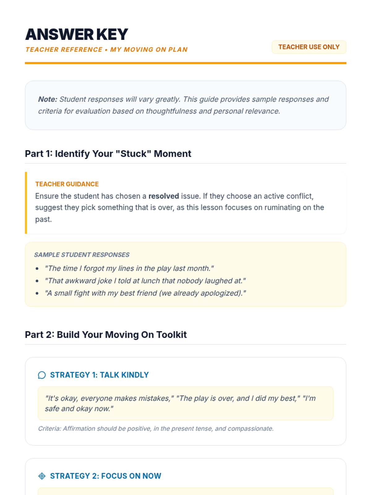 A 35-minute Tier 2 group session for 6th graders focused on emotional resilience and strategies for moving past resolved issues. Students learn to identify lingering thoughts and use practical tools like positive self-talk and mindfulness to "let go."