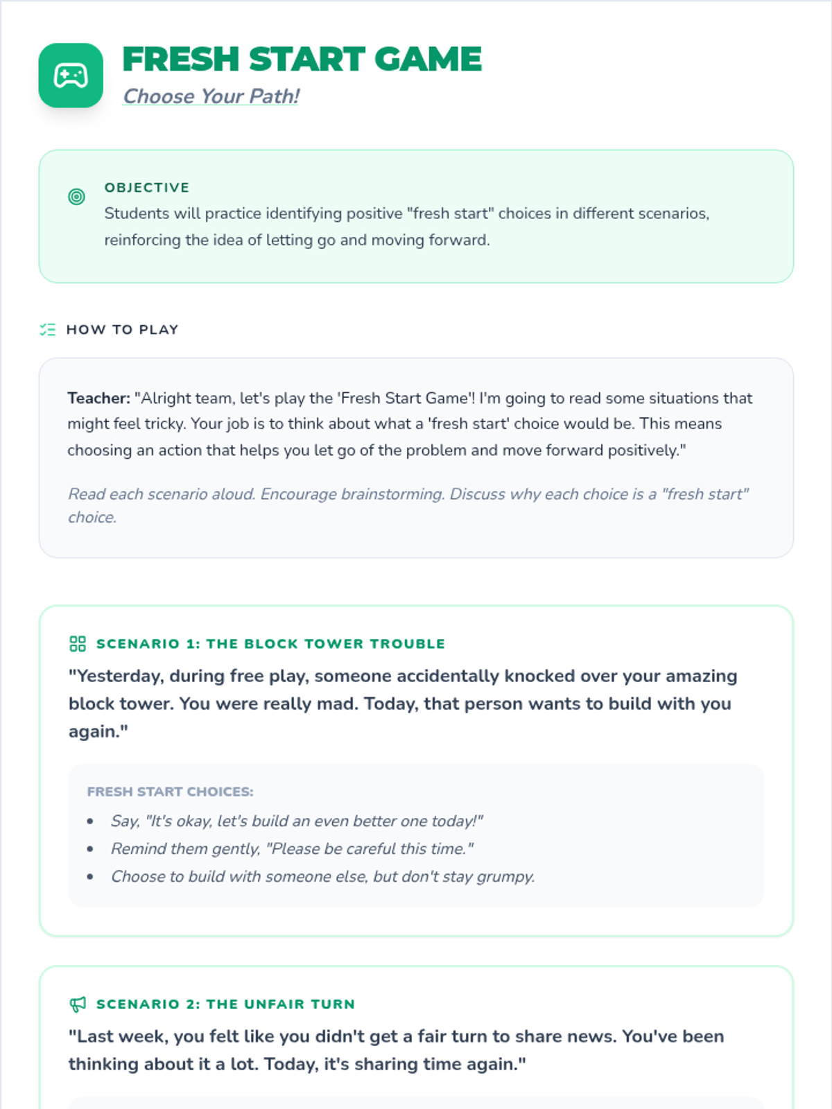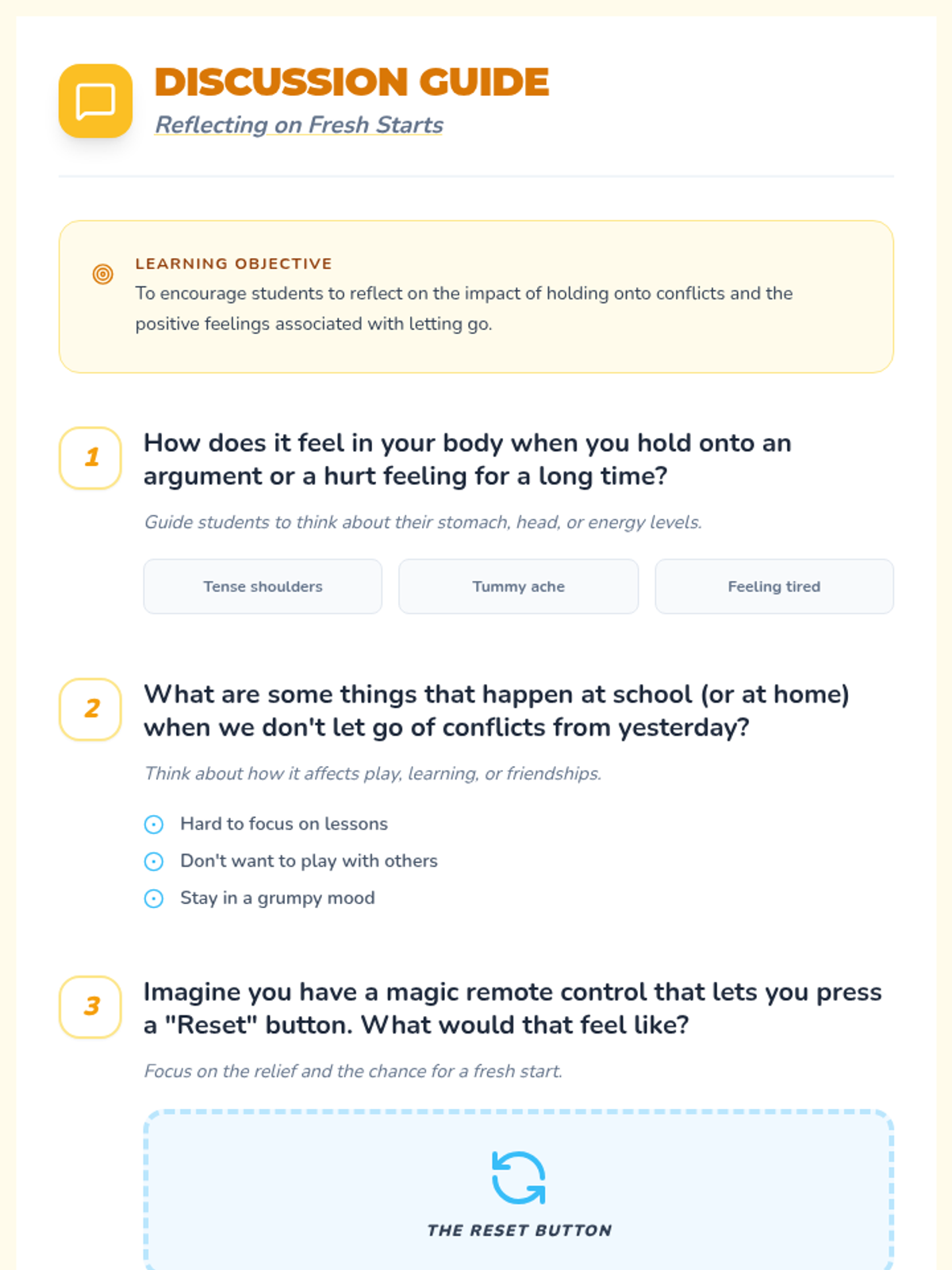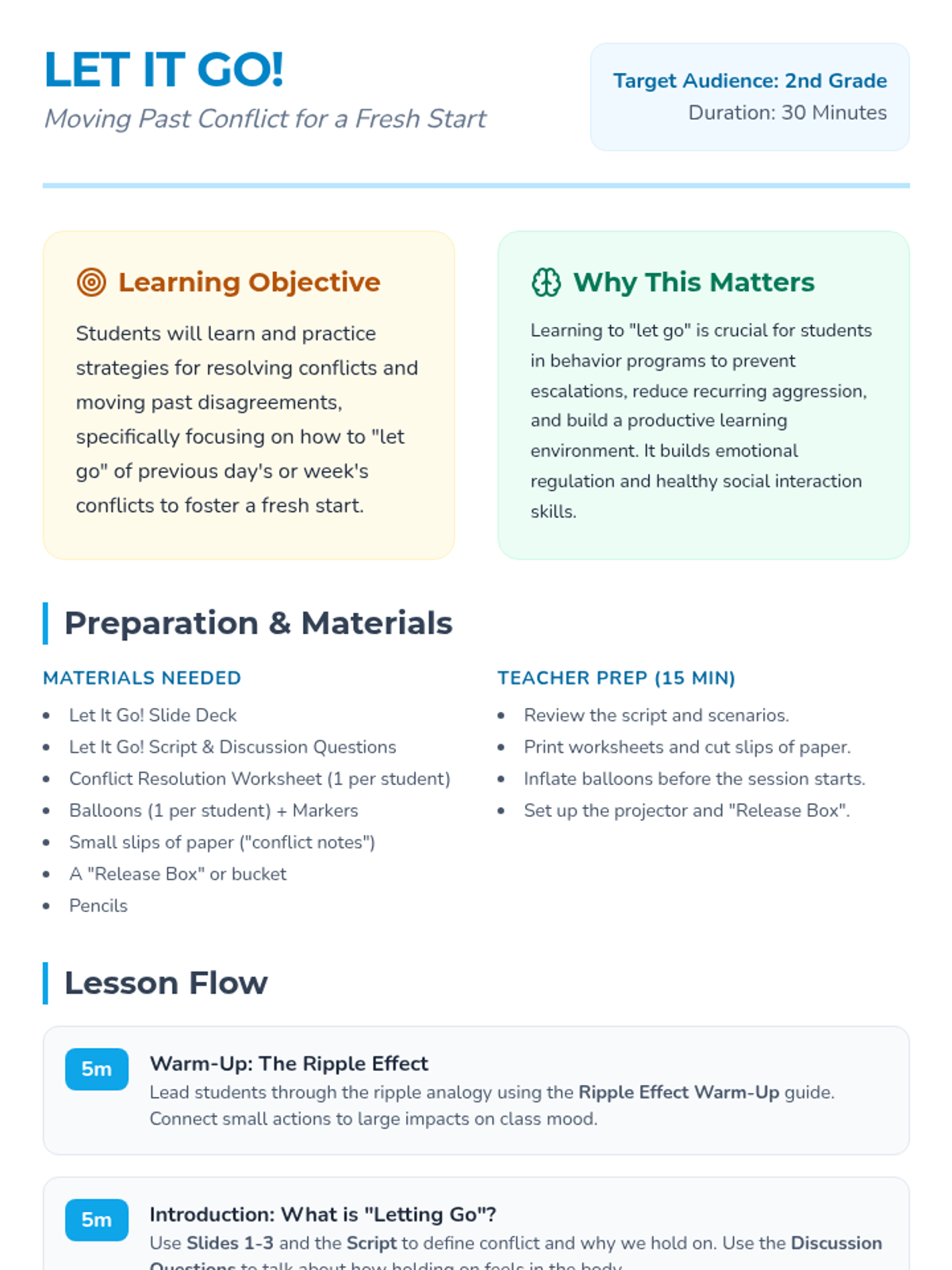 A 30-minute social-emotional learning lesson for 2nd graders to help them resolve conflicts, move past disagreements, and embrace fresh starts through symbolic activities and guided discussion.