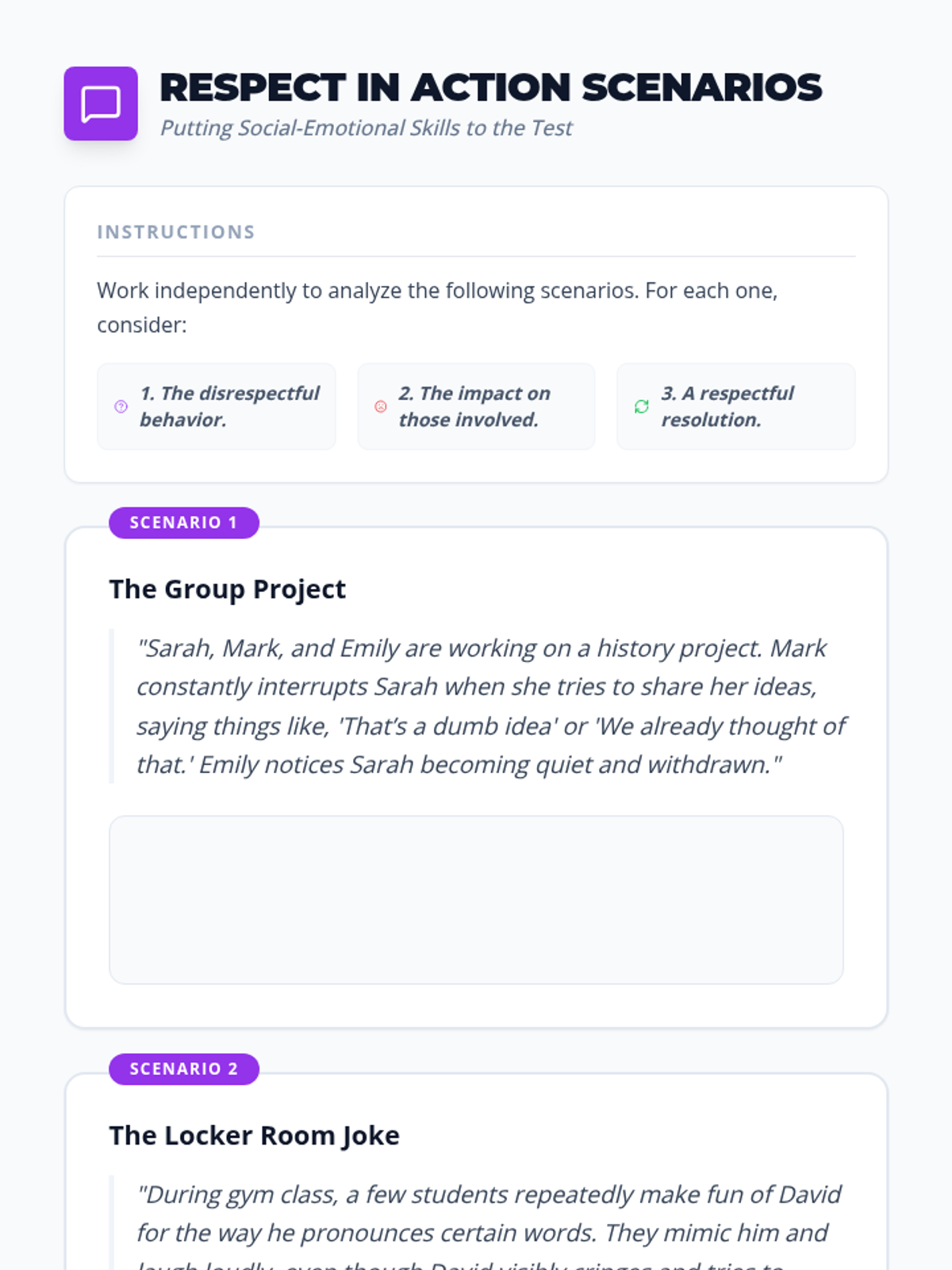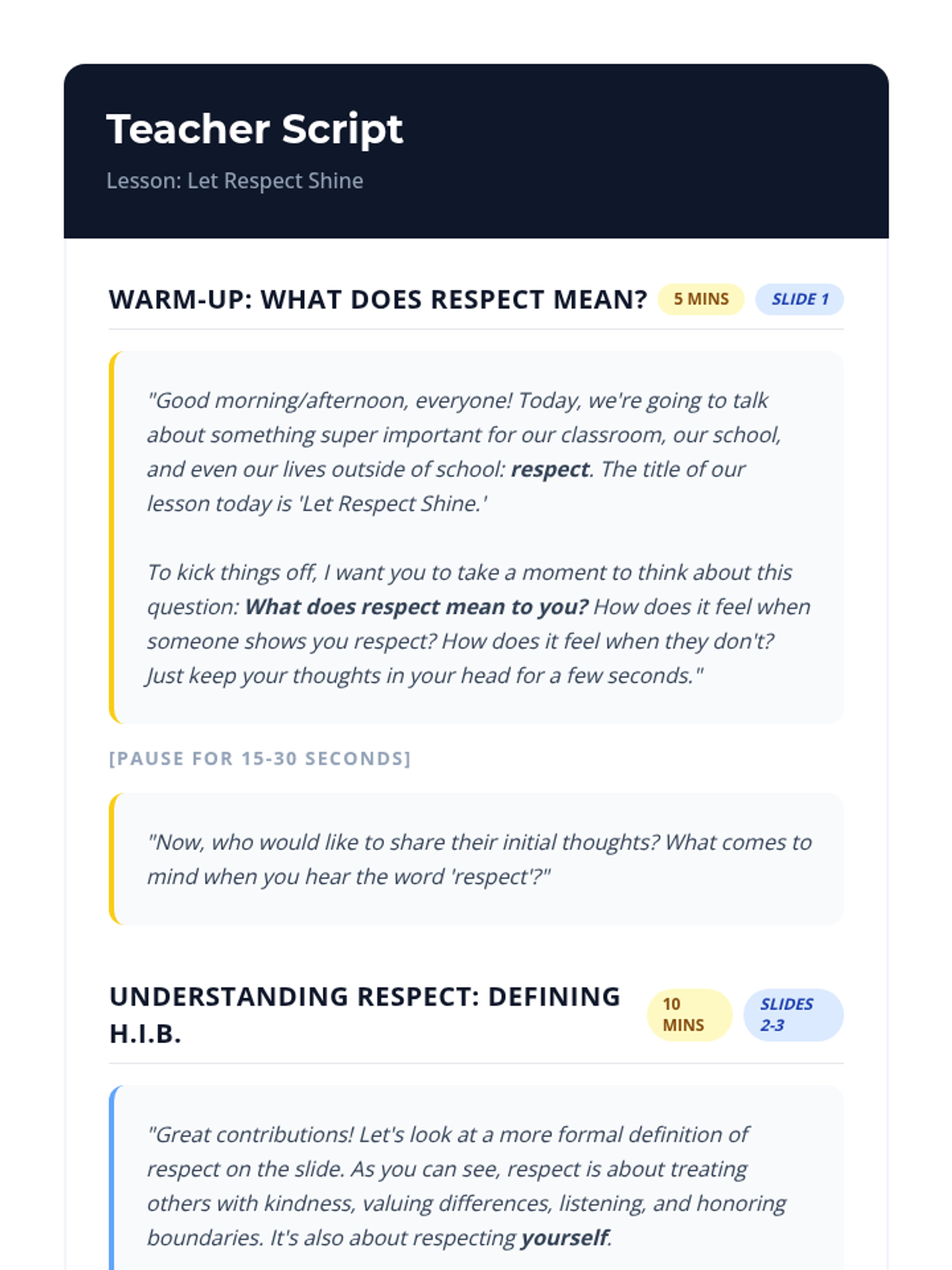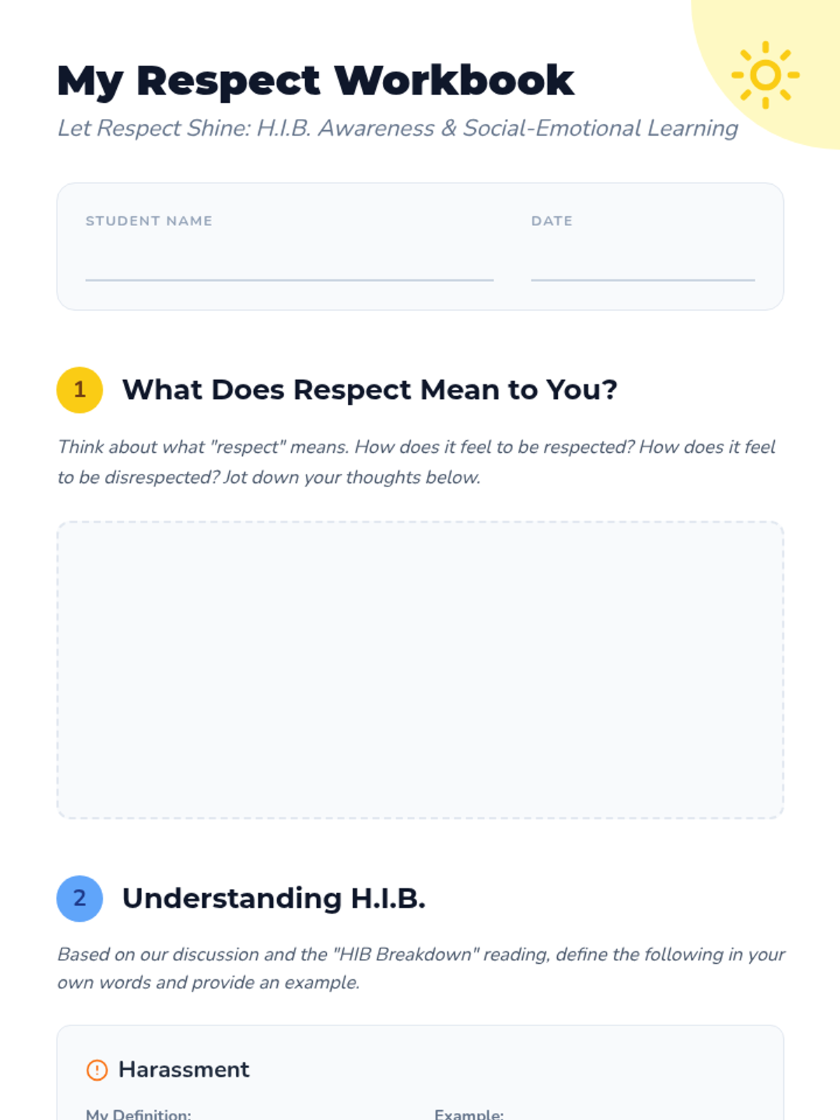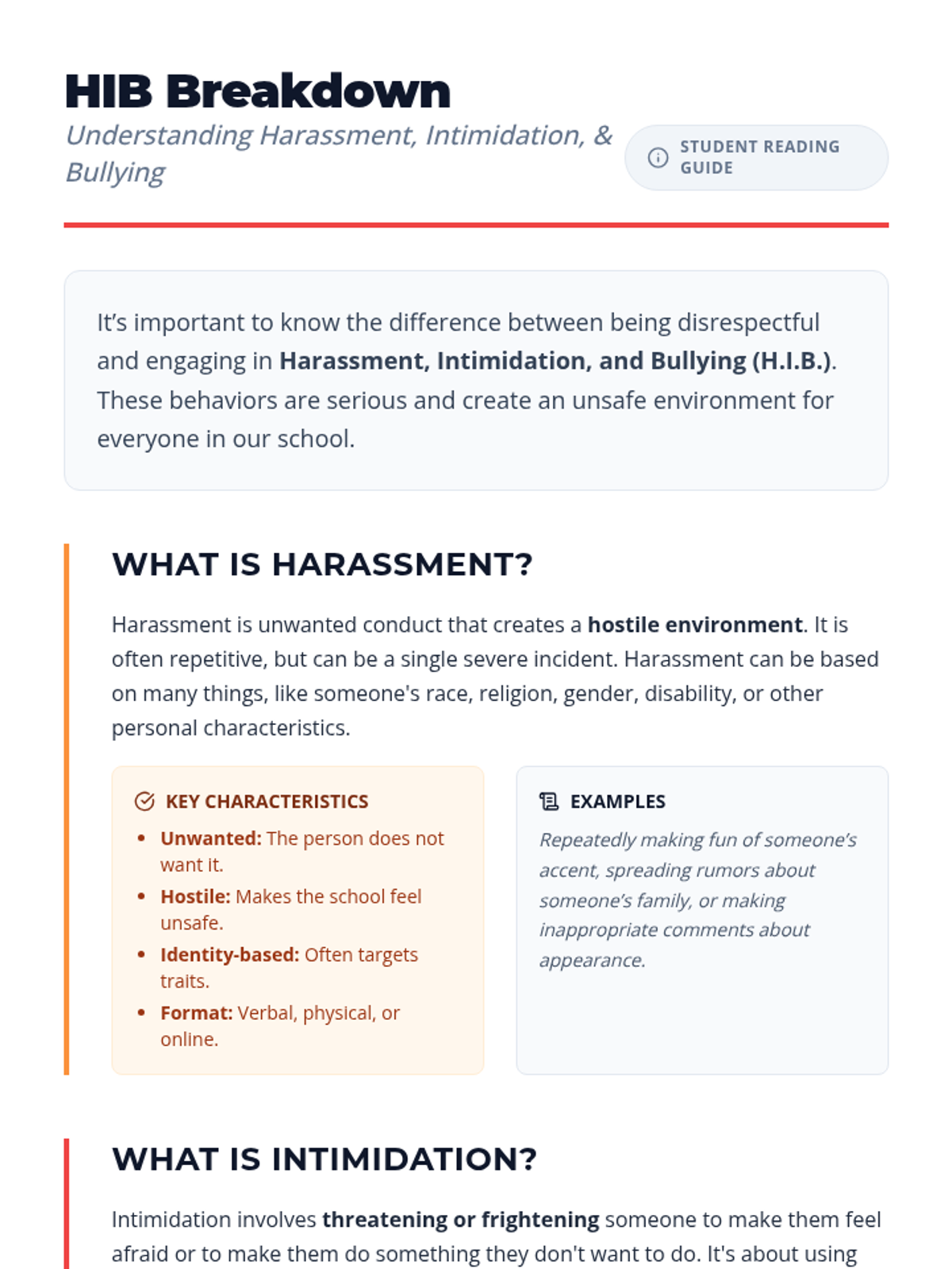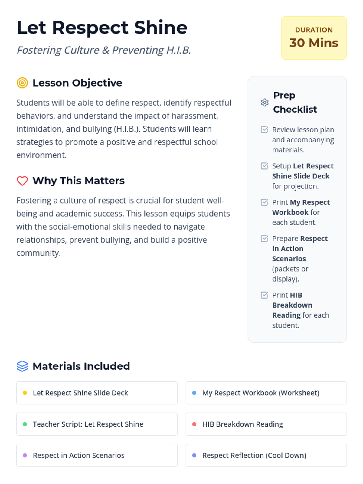 A 30-minute 7th-grade lesson focused on fostering respect and understanding Harassment, Intimidation, and Bullying (HIB) through discussion, scenarios, and reflection.