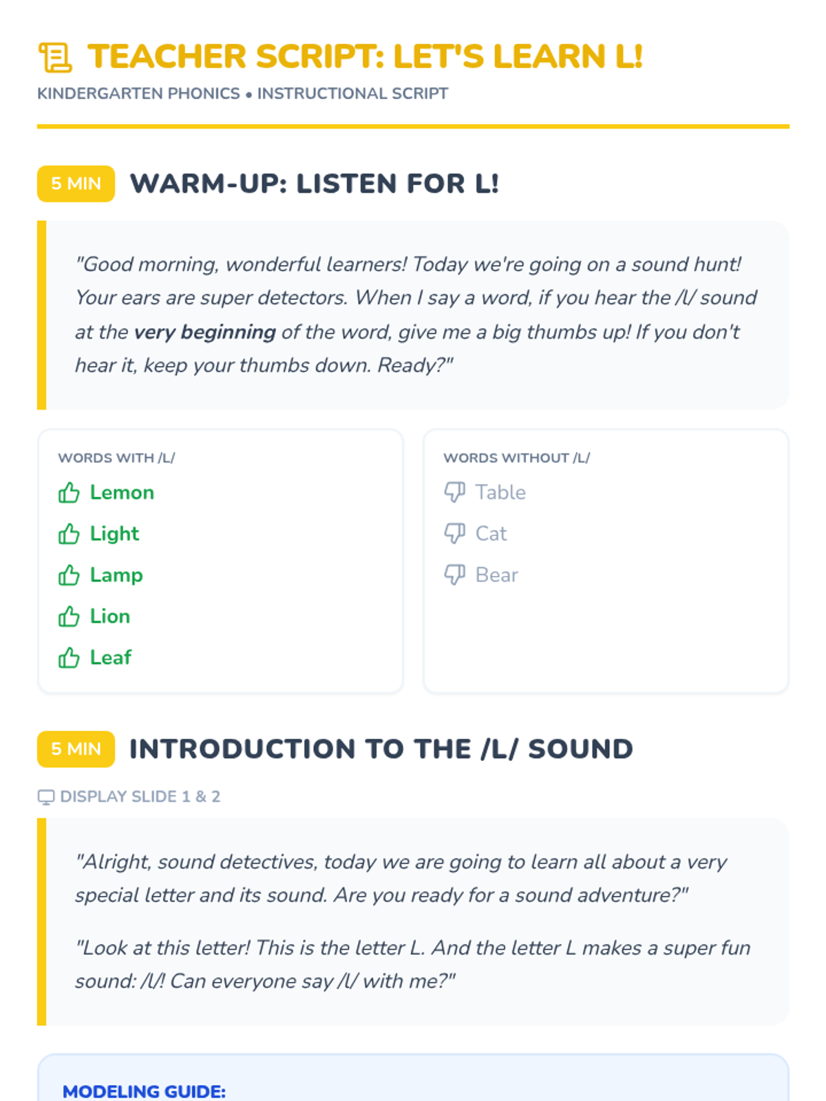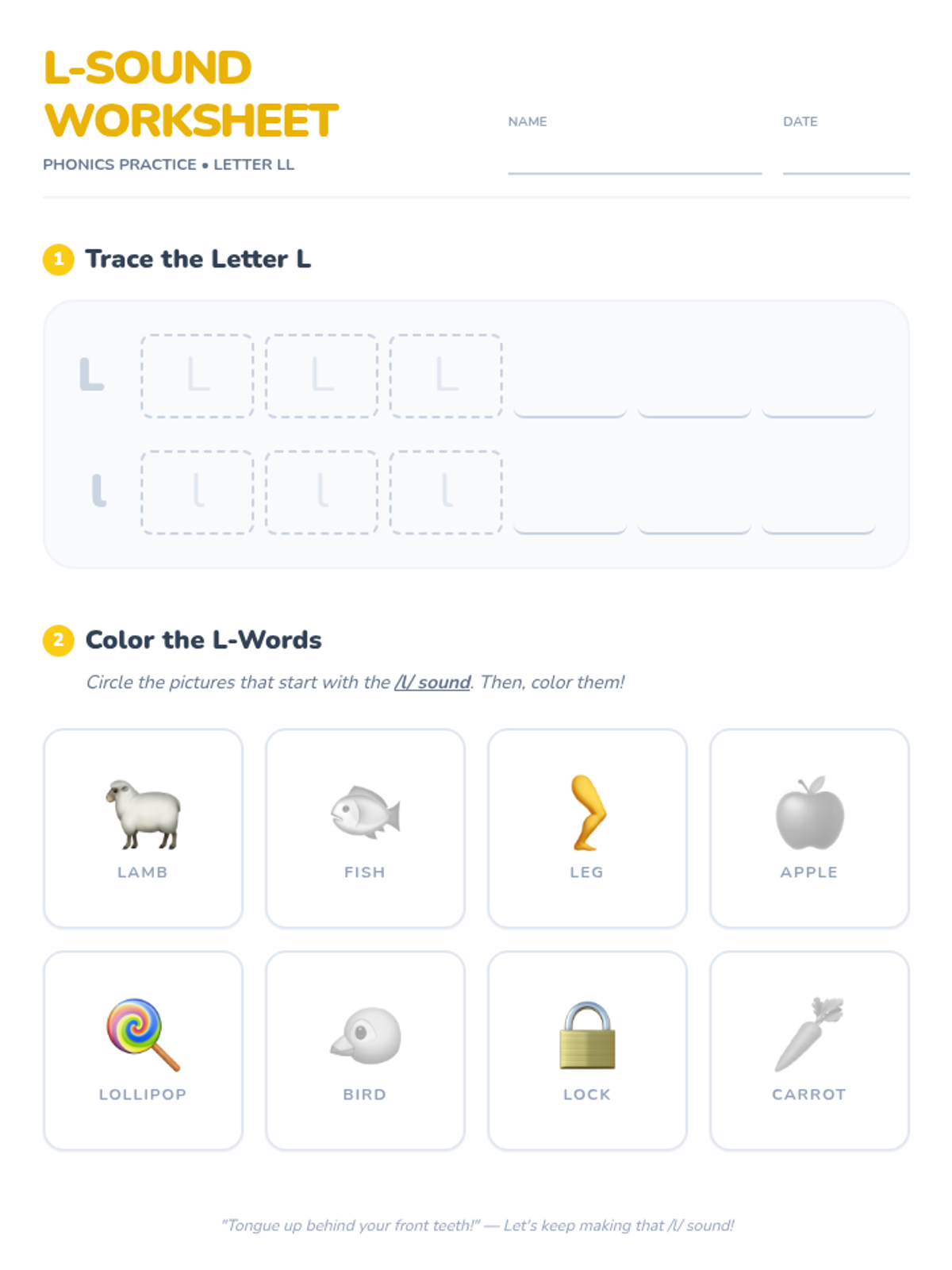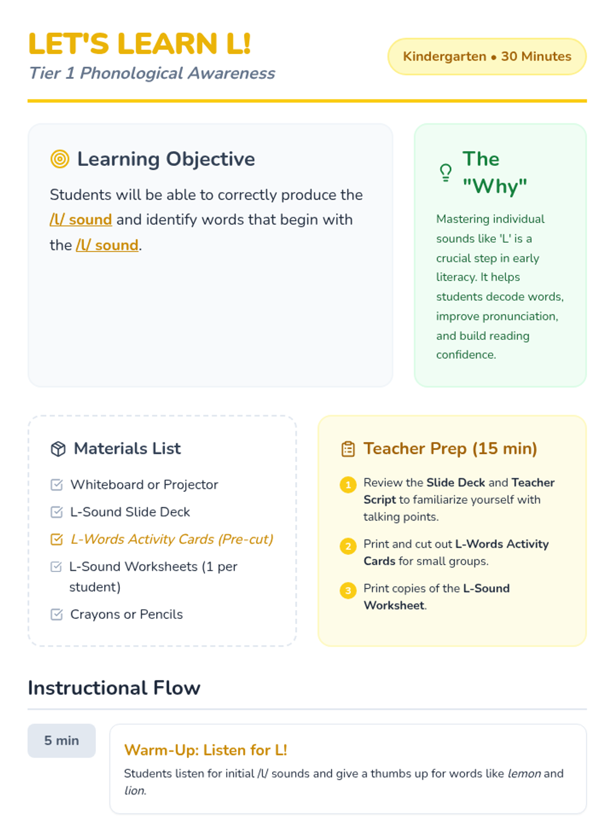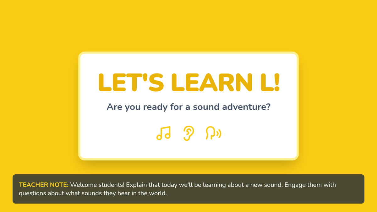 A fun, 30-minute introductory lesson for kindergarteners to recognize and produce the 'L' sound. Students will engage with visual slides, sorting activities, and hands-on tracing to master the /l/ phoneme.